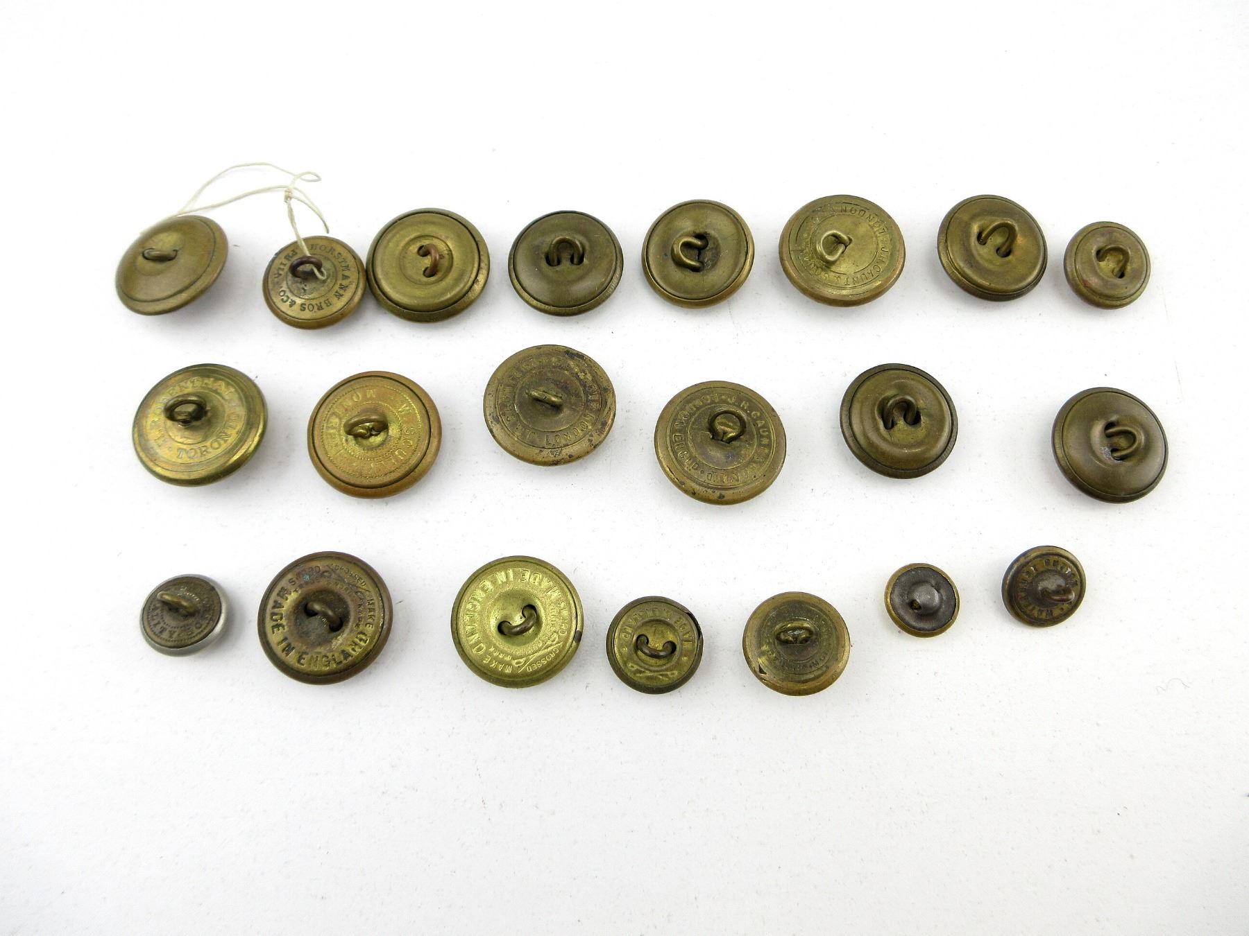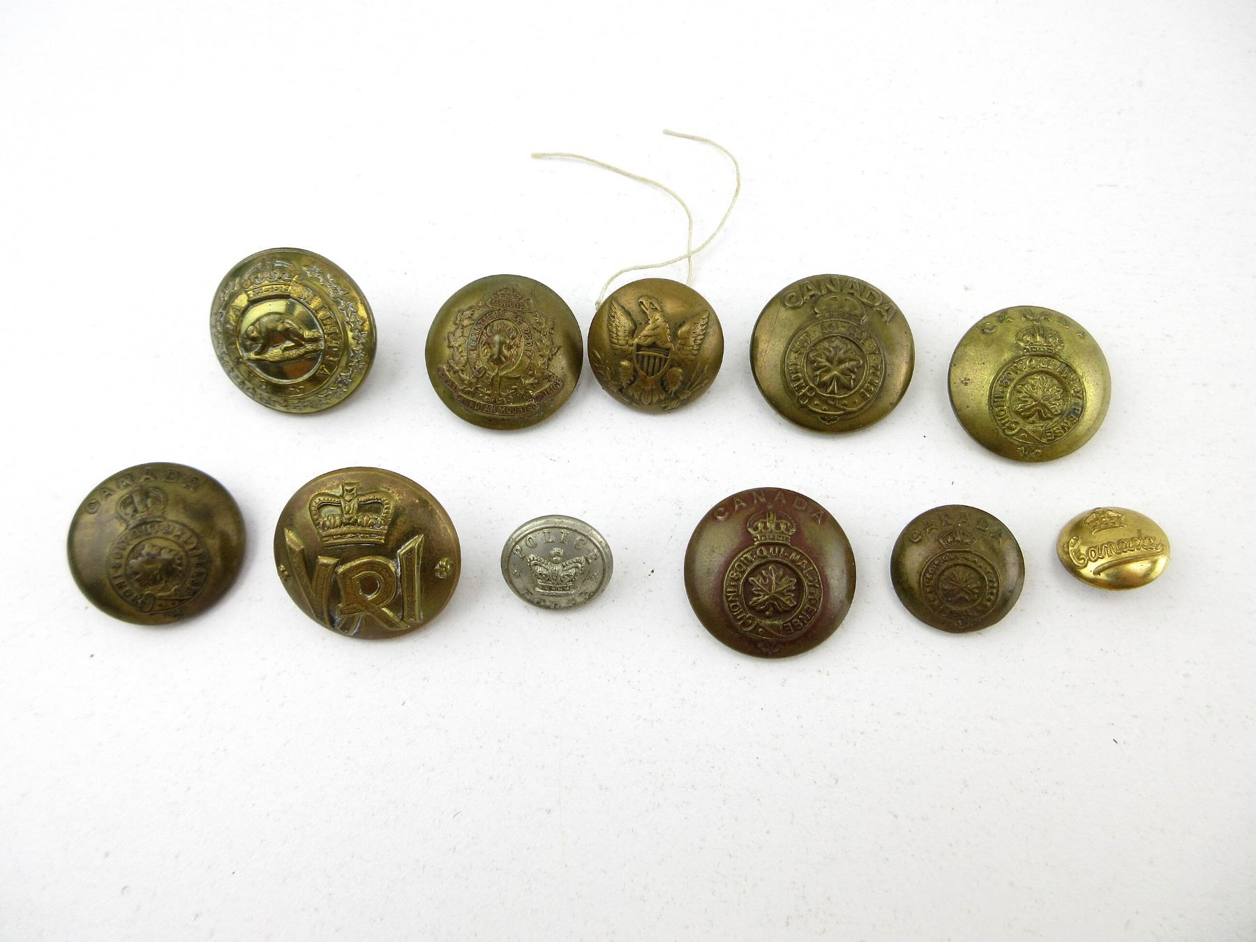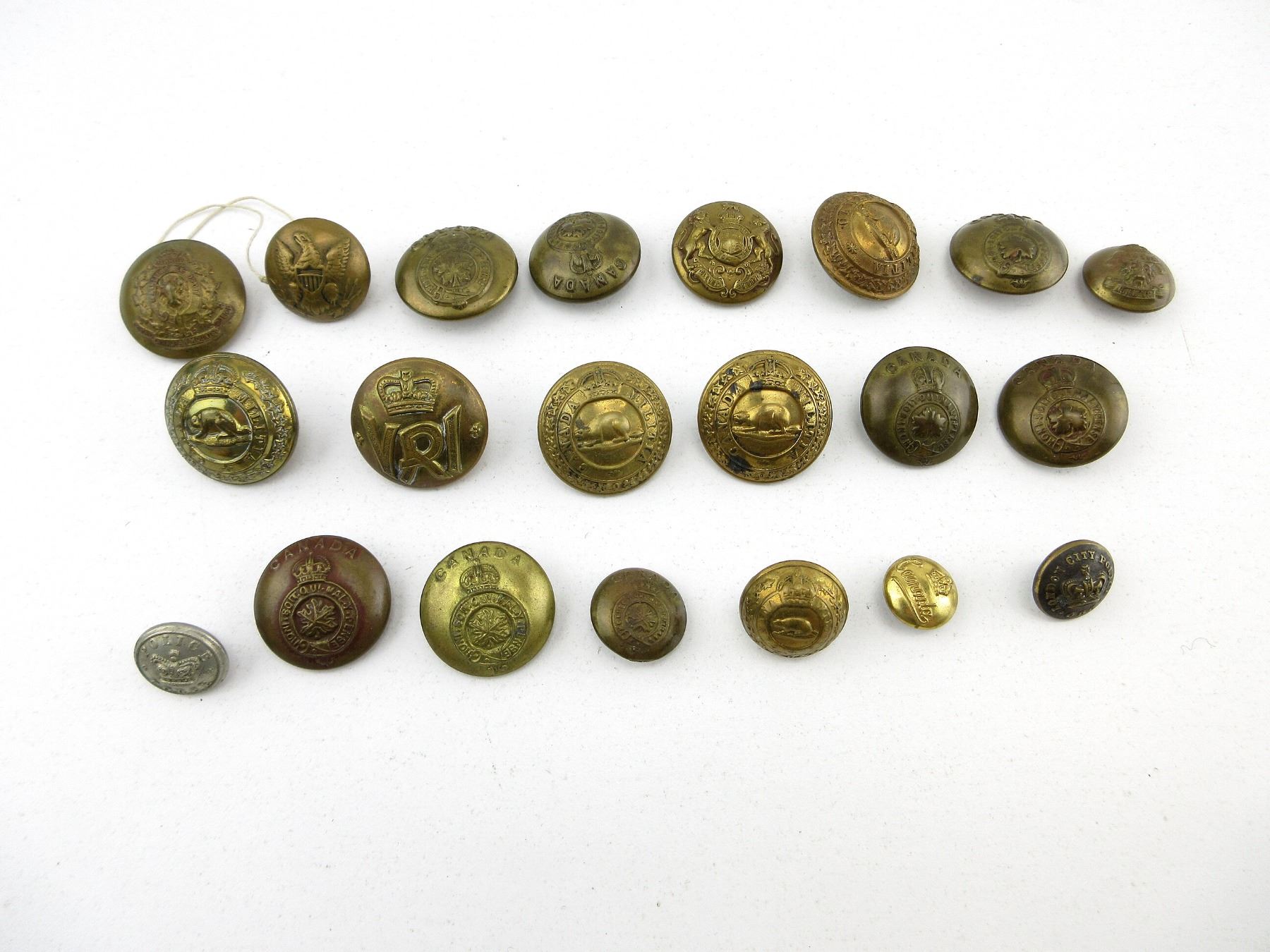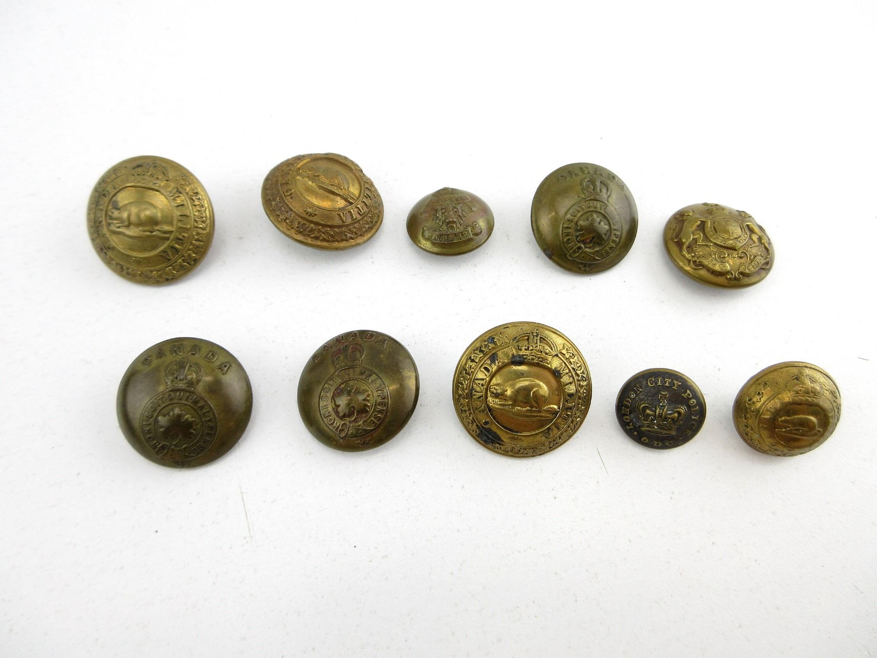 LOT INCLUDES; APPROX. (14) CANADIAN MILITARY BRASS BUTTONS, KING'S CROWNS, (1) U.S. MILITARY BRASS BUTTON, (2) BRITISH MILITARY BRASS BUTTONS, KING'S / QUEEN VICTORIA CROWNS, (2) RNWMP / RCMP BRASS BUTTONS, KING'S CROWNS & (2) LONDON POLICE METAL / BRASS BUTTONS, QUEEN'S CROWNS. SEE PHOTOS.