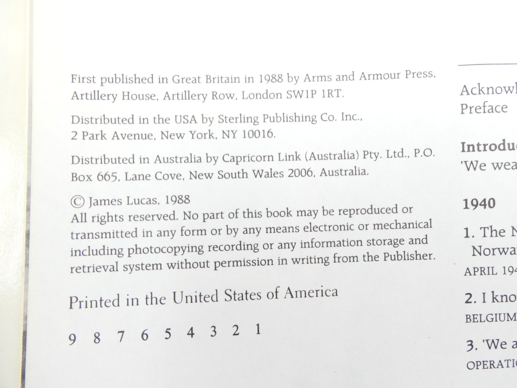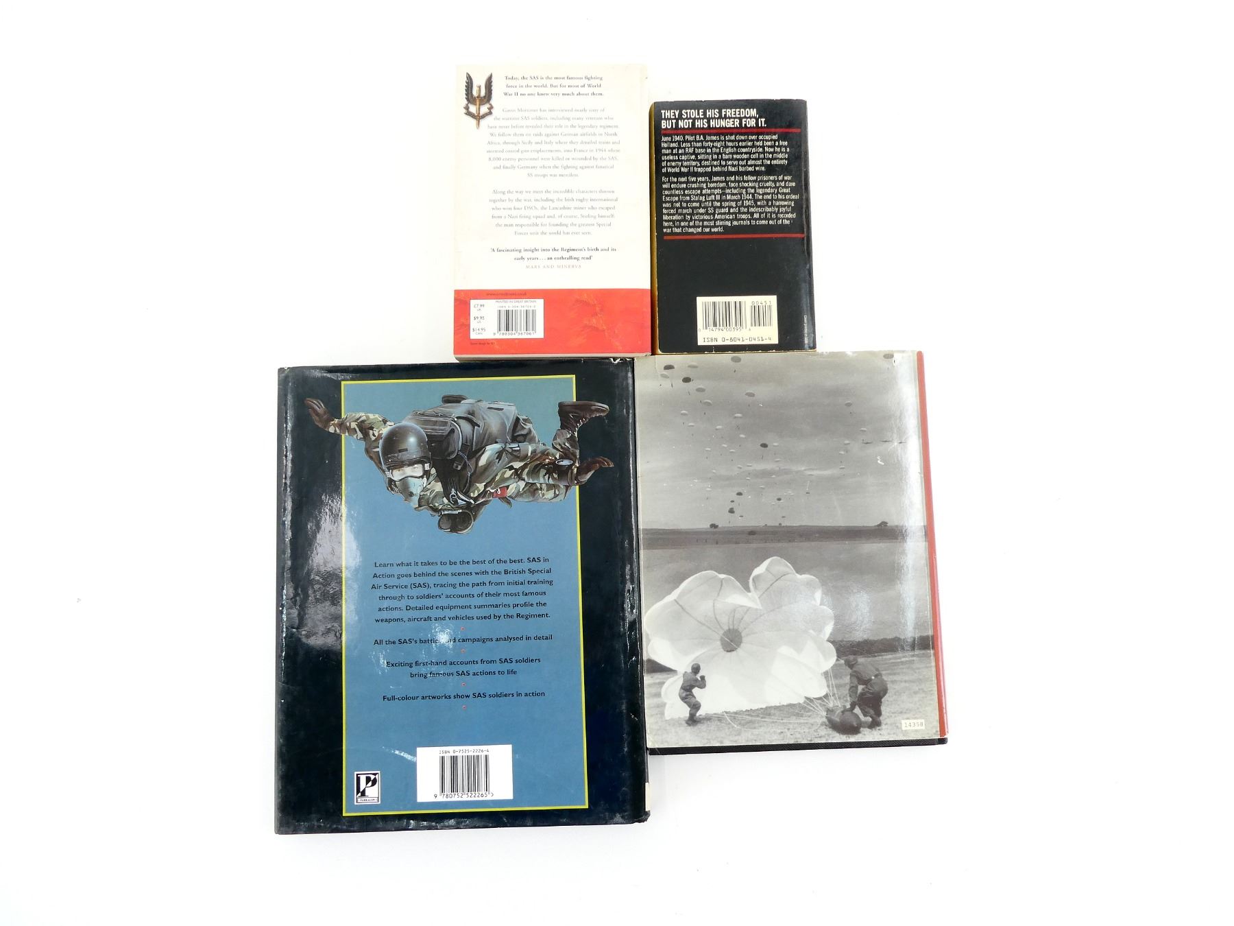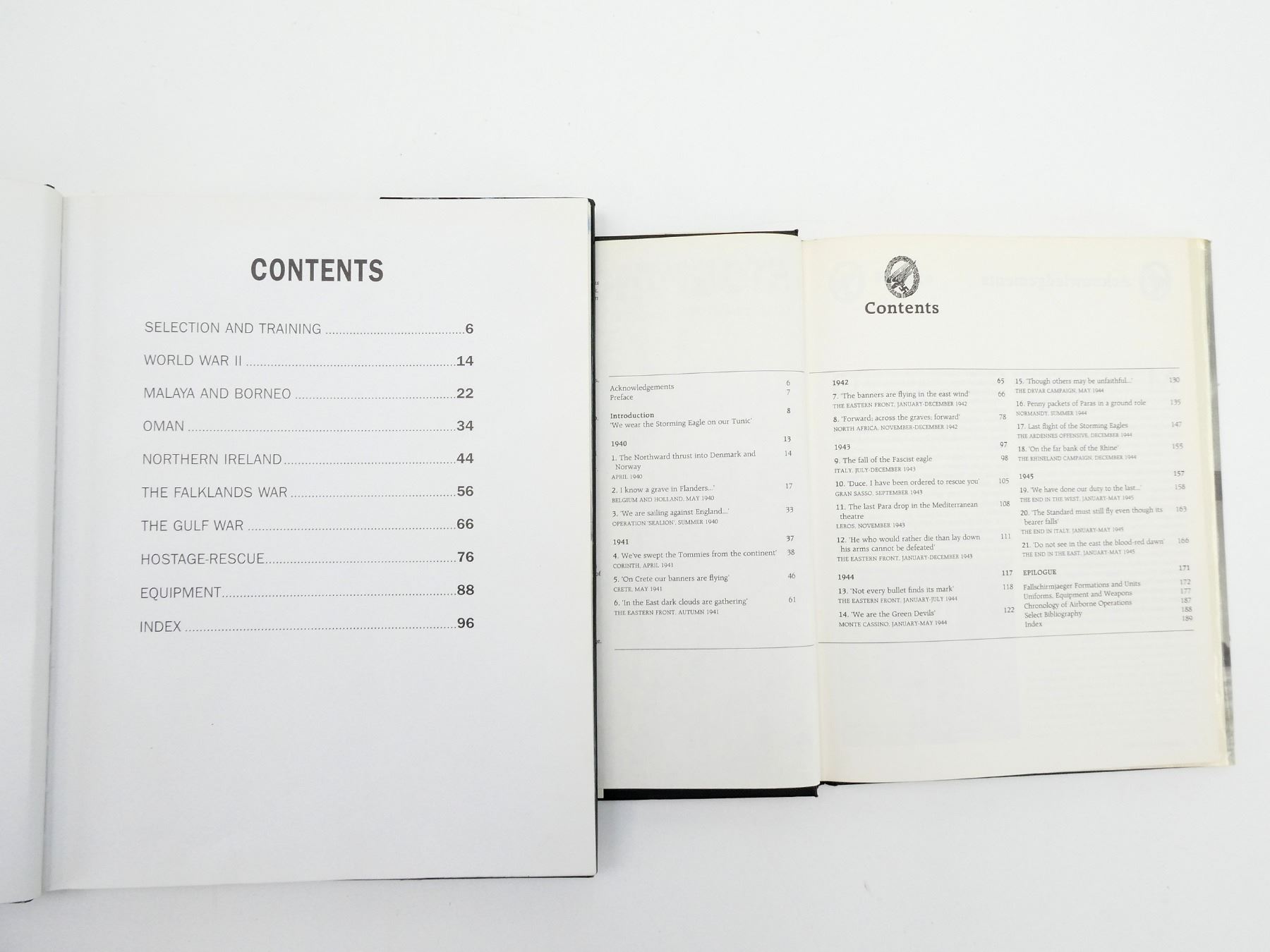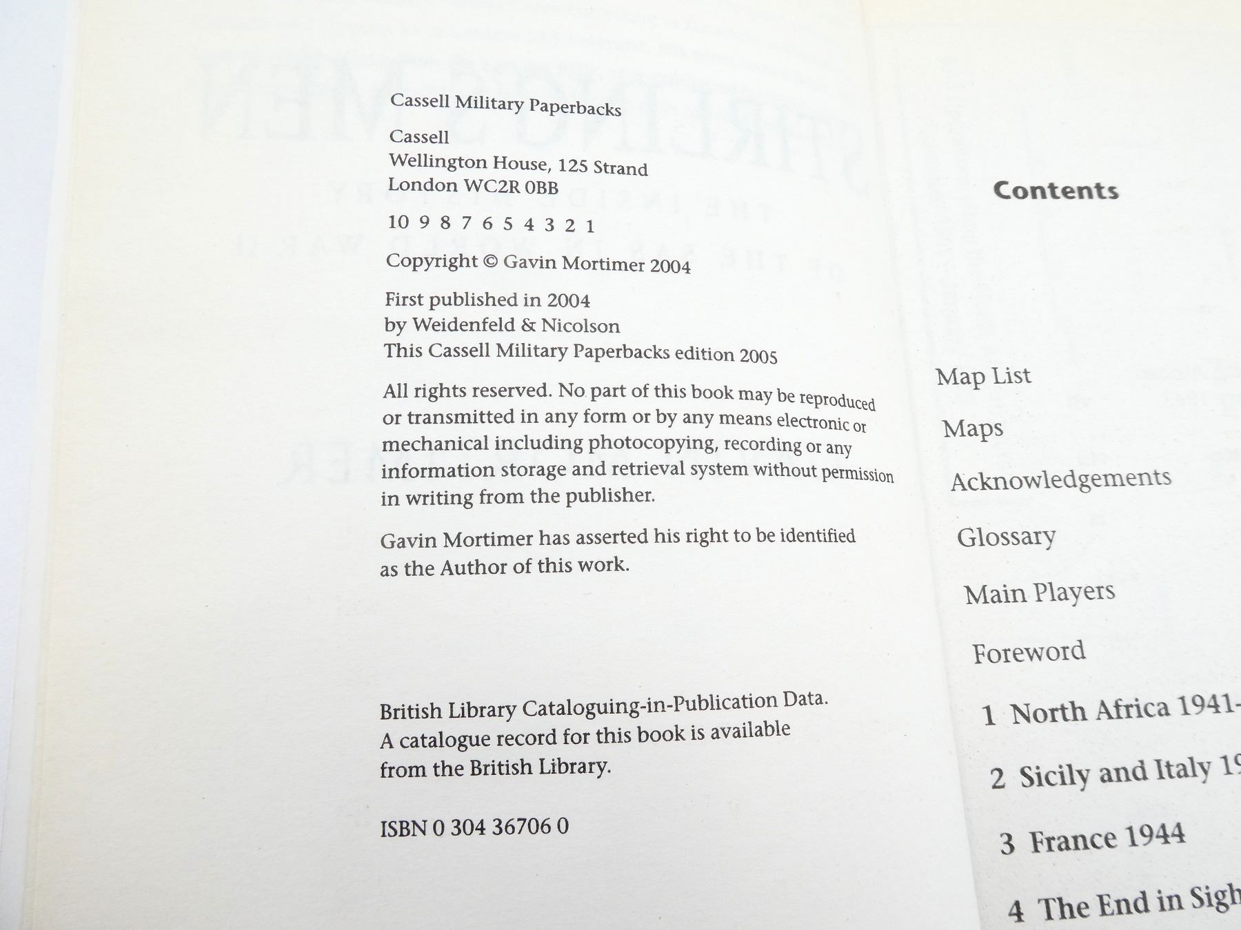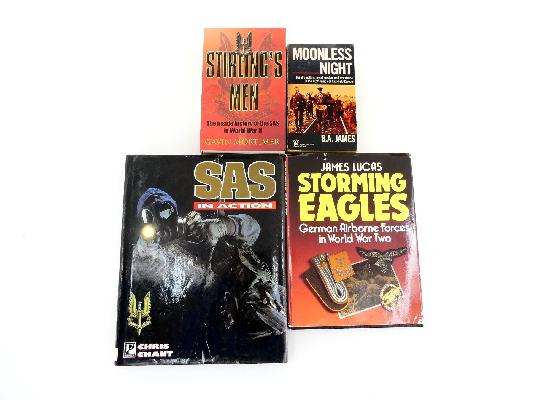 LOT INCLUDES; (1) "STIRLING'S MEN, THE INSIDE HISTORY OF THE SAS IN WORLD WAR II" BOOK BY GAVIN MORTIMER, SOFT COVER, ISBN: 0-304-36706-0, (1) "STORMING EAGLES, GERMAN AIRBORNE FORCES IN WORLD WAR TWO" BOOK BY JAMES LUCAS, HARD COVER WITH DUST COVER, COPYRIGHT 1988, (1) "SAS IN ACTION" BOOK BY CHRIS CHANT, HARD COVRE WITH DUST COVER, ISBN: 0-7525-2226-4 & (1) "MOONLESS NIGHT" BOOK BY B.A. JAMES, SOFT COVER, ISBN: 0-8041-0451-4. SEE PHOTOS.