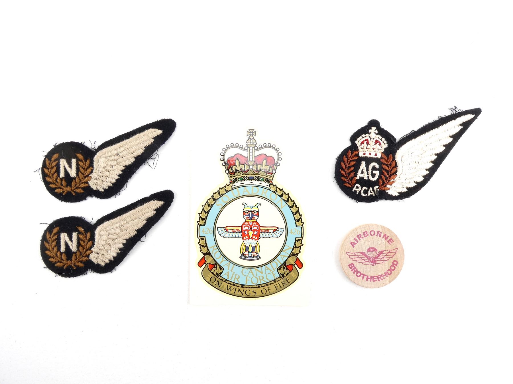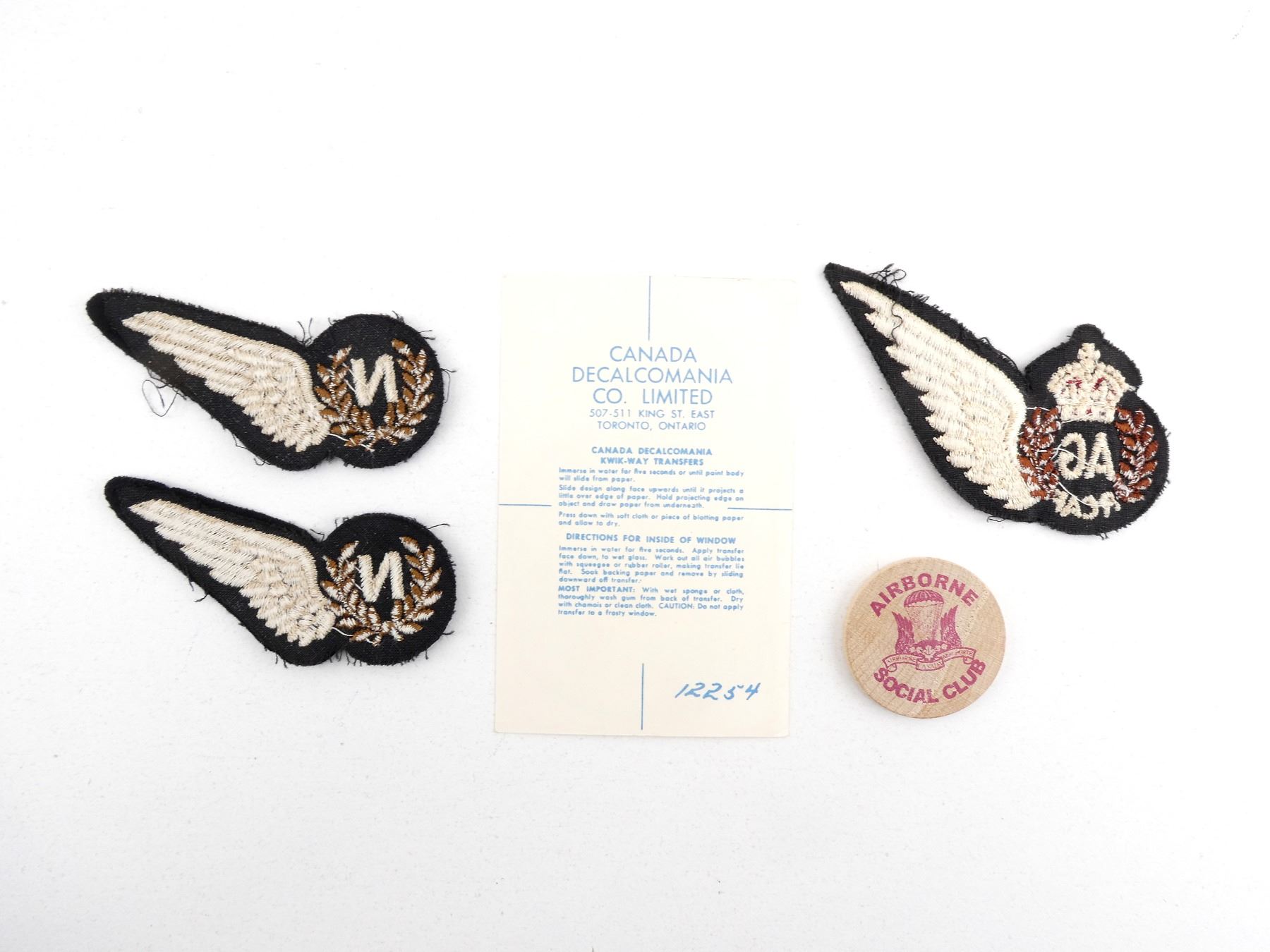 LOT INCLUDES; (2) WWII RCAF NAVIGATOR "N" WING BADGE, (1) WWII RCAF AIR GUNNER "AG" WING BADGE, (1) RCAF SQUADRON 426 PILOT HELMET DECAL WITH QUEEN'S CROWN, CONSIGNOR STATES: "ORIGINAL UNUSED PILOT HELMET DECAL", VARIOUS MARKINGS ON BACKING OF DECAL & (1) CANADIAN AIRBORNE REGIMENT SOCIAL CLUB COIN / CHALLENGE COIN, WOODEN, MARKED: "AIRBORNE, SOCIAL CLUB" & "AIRBORNE BROTHERHOOD" WITH CANADIAN AIRBORNE SYMBOLS. SEE PHOTOS.