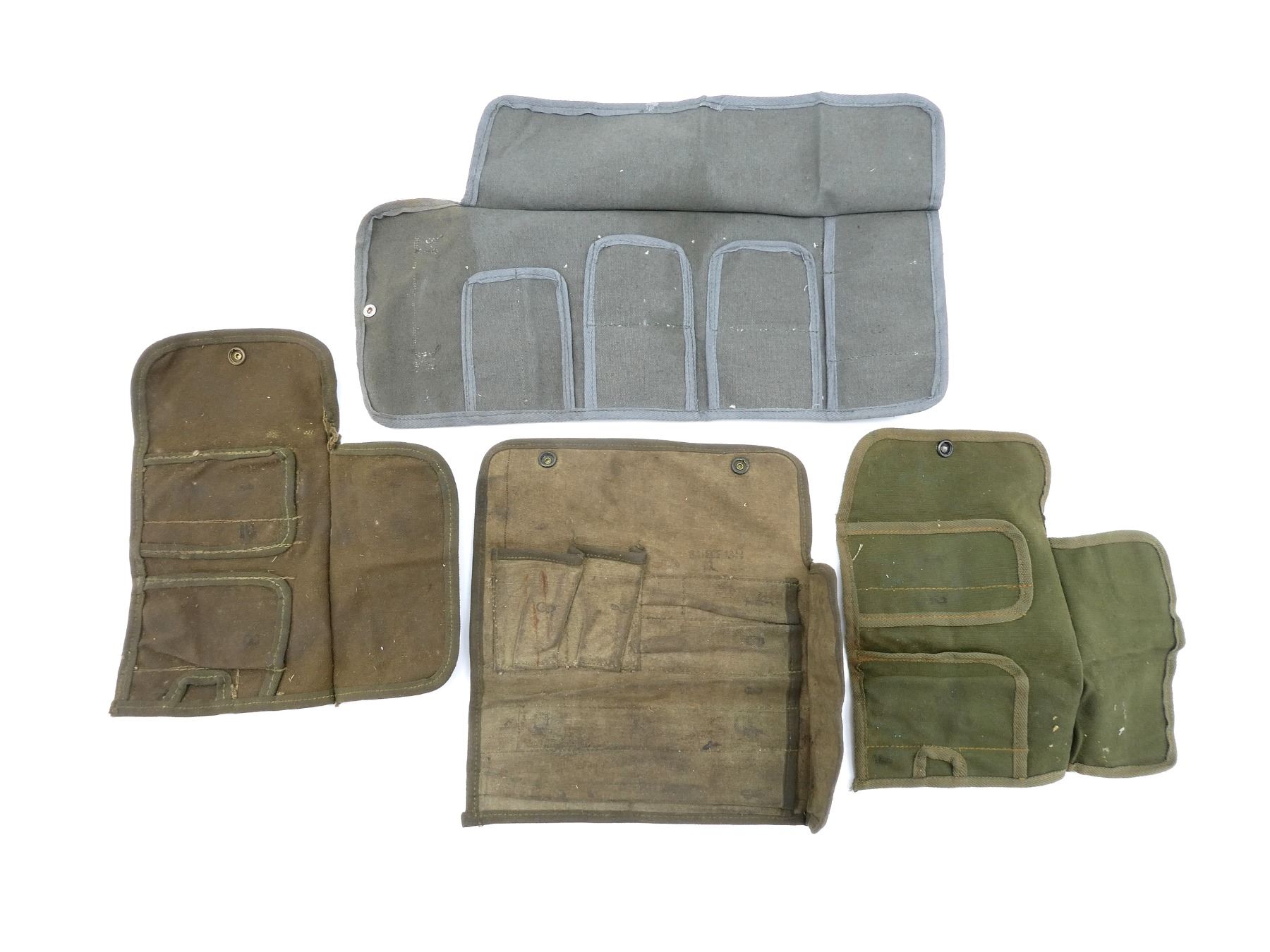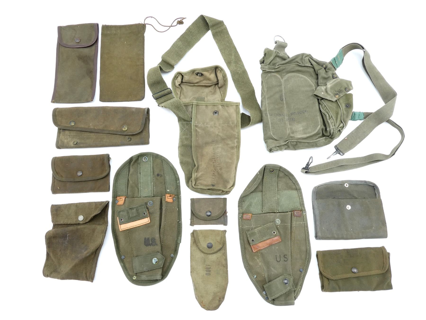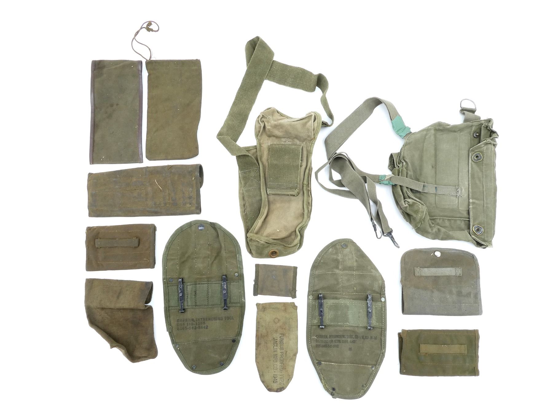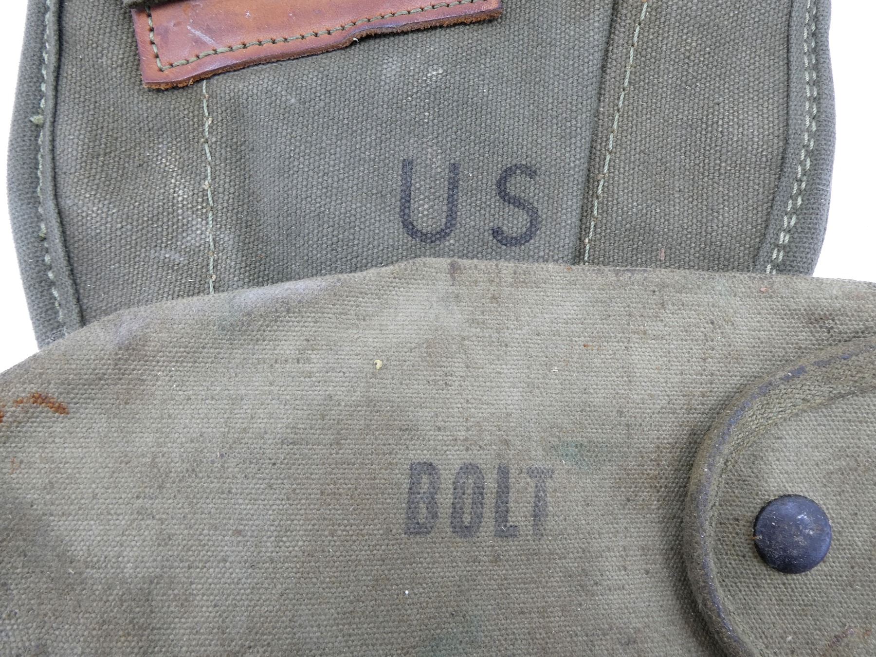 LOT INCLUDES; (4) U.S. MILITARY GREEN / GREY / TAN CANVAS TOOL ROLLS, ONE DATED: "1944" WITH VARIOUS OTHER FAINT / UN-CLEAR MARKINGS, TWO WITH VARIOUS FAINT / UN-CLEAR MARKINGS, OTHER HAS NO VISIBLE MARKINGS, ALL SHOW AGE / WEAR / TEAR, (2) UNKNOWN MILITARY TAN CANVAS POUCHES, SINGLE POCKET, SINGLE SNAP CLOSURE, NO VISIBLE MARKINGS, SHOWS AGE / WEAR / TEAR, (2) U.S. MILITARY STYLE POUCHES, ONE GREEN / TAN CANVAS SPARE PARTS BAG, DRAWSTRING CLOSURE, NO VISIBLE MARKINGS, ONE SMALL SINGLE POCKET AMMO POUCH, NO VISIBLE MARKINGS, SINGLE SNAP CLOSURE, SHOWS AGE / WEAR / TEAR, (2) U.S. MILITARY GREEN CANVAS & LEATHER ENTRENCHING TOOL COVERS, MARKED: "U.S." & VARIOUS OTHER MARKINGS, WITH BELT HOOKS, SHOWS WEAR & (1) U.S. MILITARY TAN CANVAS BOLT CASE, MARKED: "BOLT" & VARIOUS OTHER MARKINGS, DATED: "1945", SHOWS AGE / WEAR, ETC. SEE PHOTOS.
