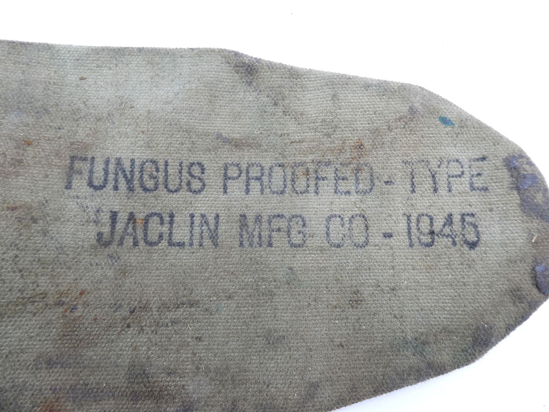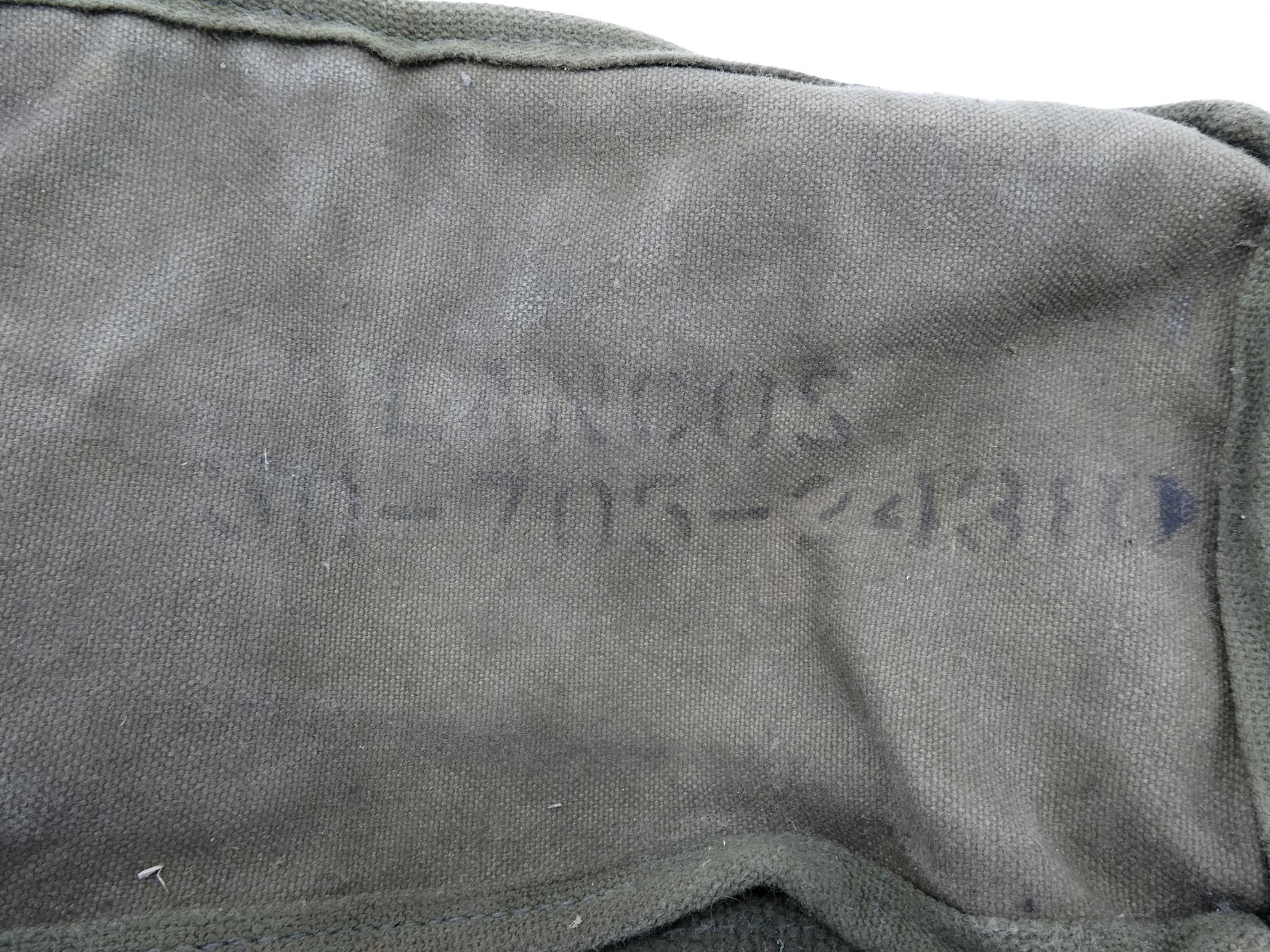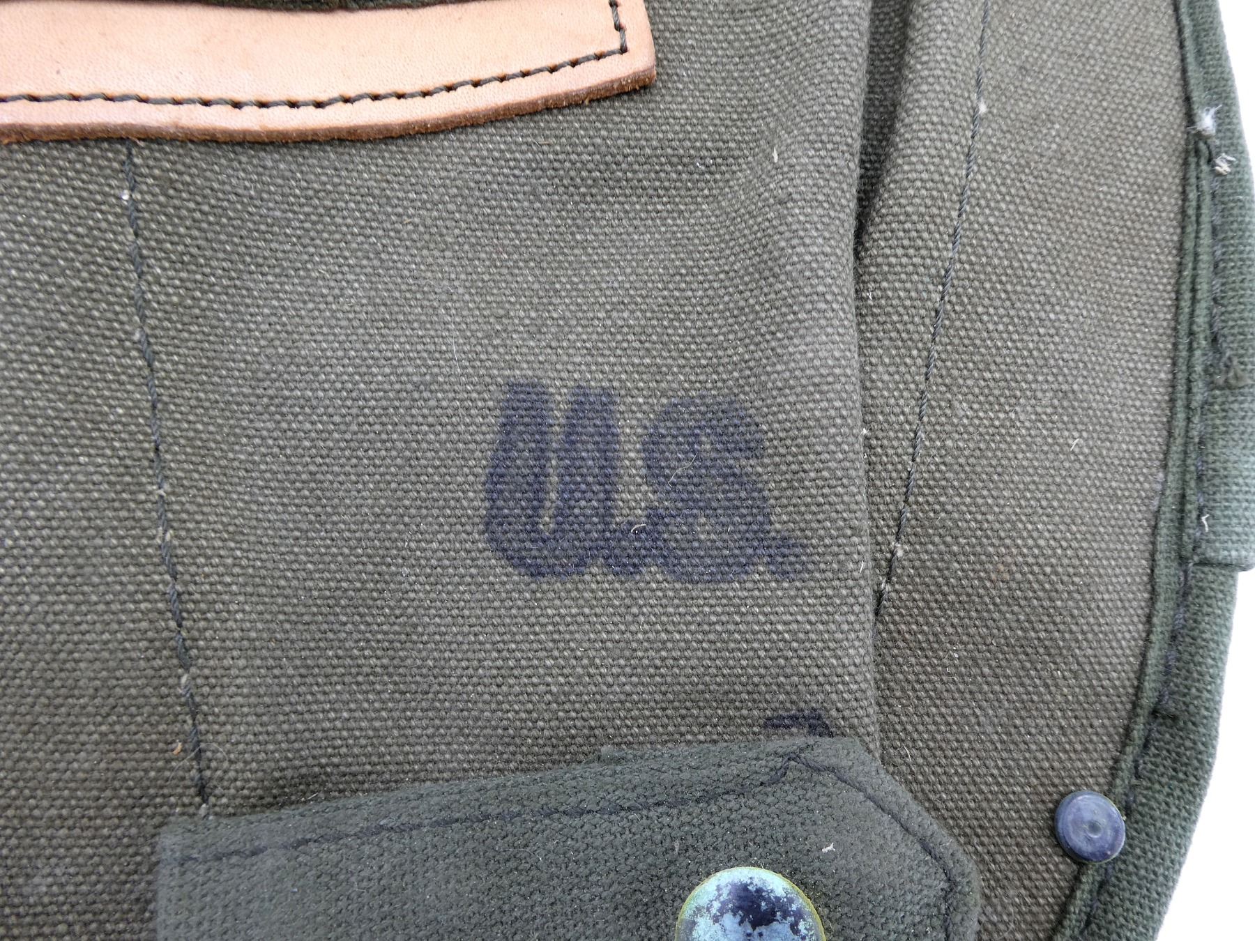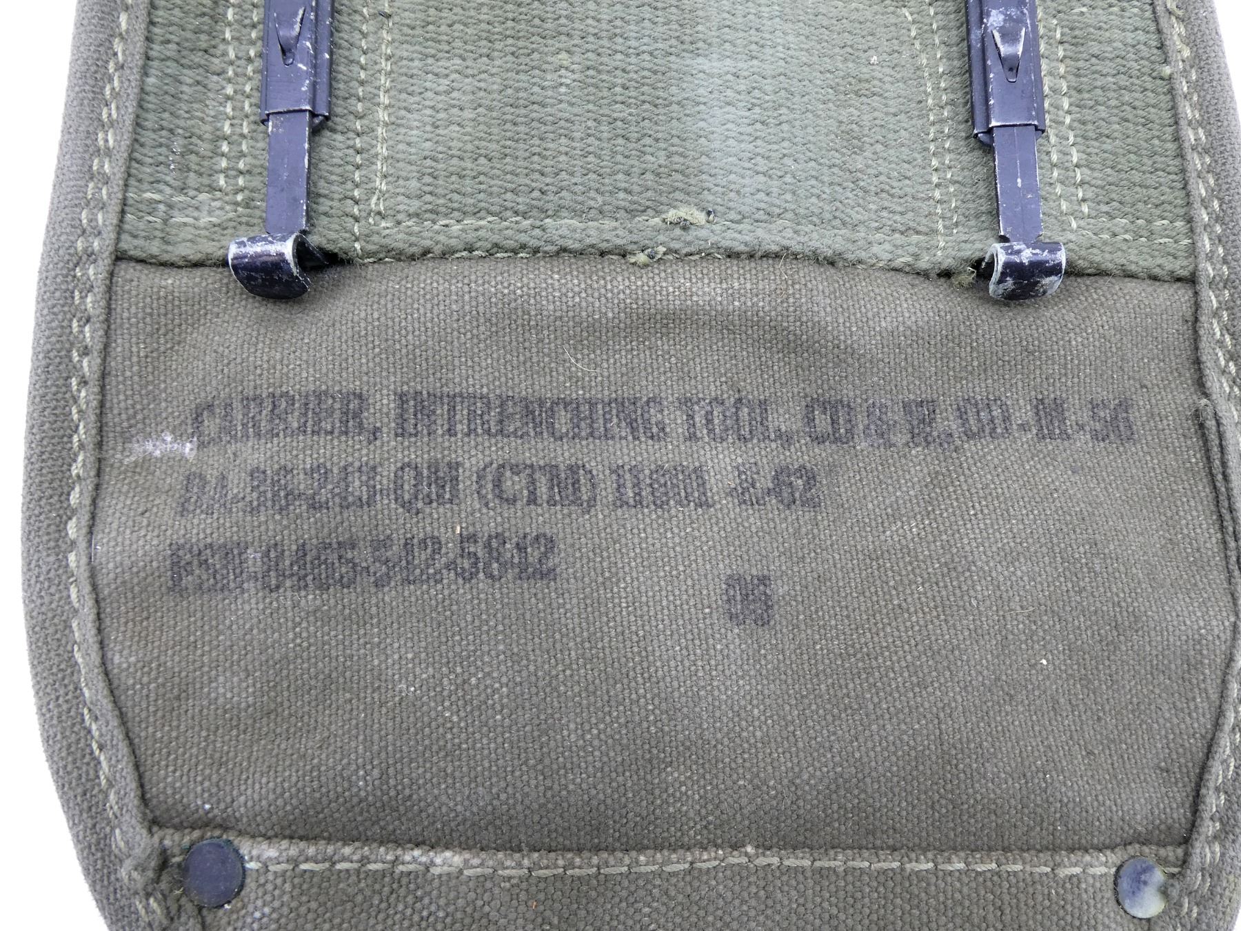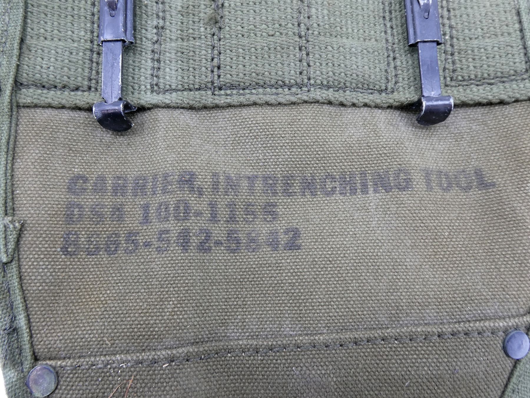 LOT INCLUDES; (4) U.S. MILITARY GREEN / GREY / TAN CANVAS TOOL ROLLS, ONE DATED: "1944" WITH VARIOUS OTHER FAINT / UN-CLEAR MARKINGS, TWO WITH VARIOUS FAINT / UN-CLEAR MARKINGS, OTHER HAS NO VISIBLE MARKINGS, ALL SHOW AGE / WEAR / TEAR, (2) UNKNOWN MILITARY TAN CANVAS POUCHES, SINGLE POCKET, SINGLE SNAP CLOSURE, NO VISIBLE MARKINGS, SHOWS AGE / WEAR / TEAR, (2) U.S. MILITARY STYLE POUCHES, ONE GREEN / TAN CANVAS SPARE PARTS BAG, DRAWSTRING CLOSURE, NO VISIBLE MARKINGS, ONE SMALL SINGLE POCKET AMMO POUCH, NO VISIBLE MARKINGS, SINGLE SNAP CLOSURE, SHOWS AGE / WEAR / TEAR, (2) U.S. MILITARY GREEN CANVAS & LEATHER ENTRENCHING TOOL COVERS, MARKED: "U.S." & VARIOUS OTHER MARKINGS, WITH BELT HOOKS, SHOWS WEAR & (1) U.S. MILITARY TAN CANVAS BOLT CASE, MARKED: "BOLT" & VARIOUS OTHER MARKINGS, DATED: "1945", SHOWS AGE / WEAR, ETC. SEE PHOTOS.