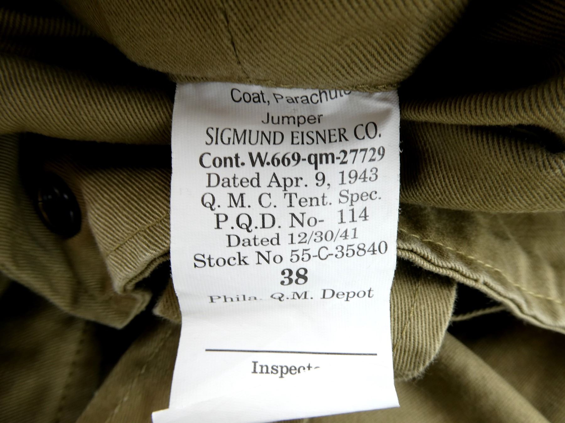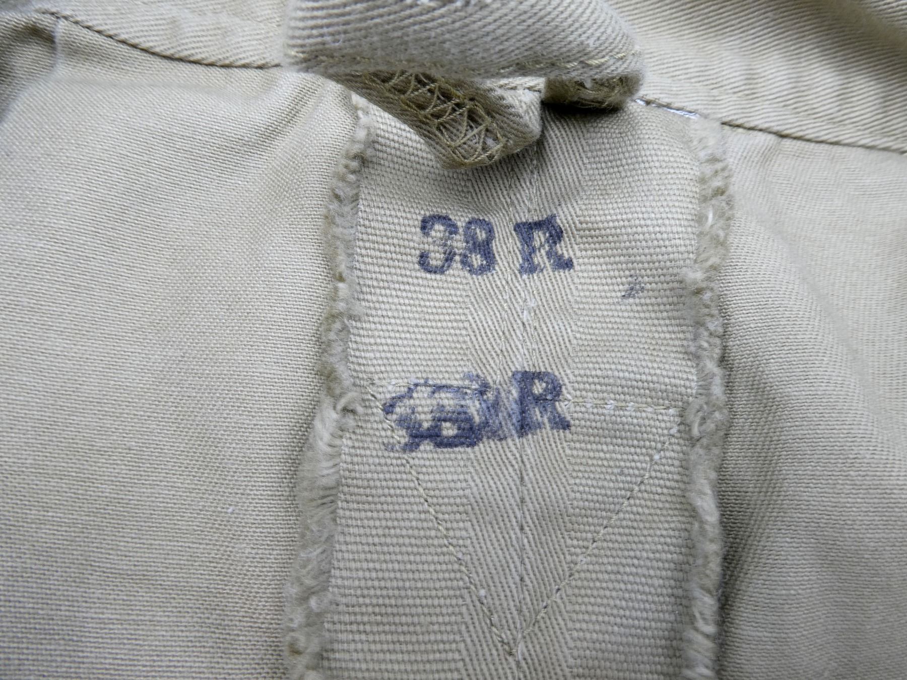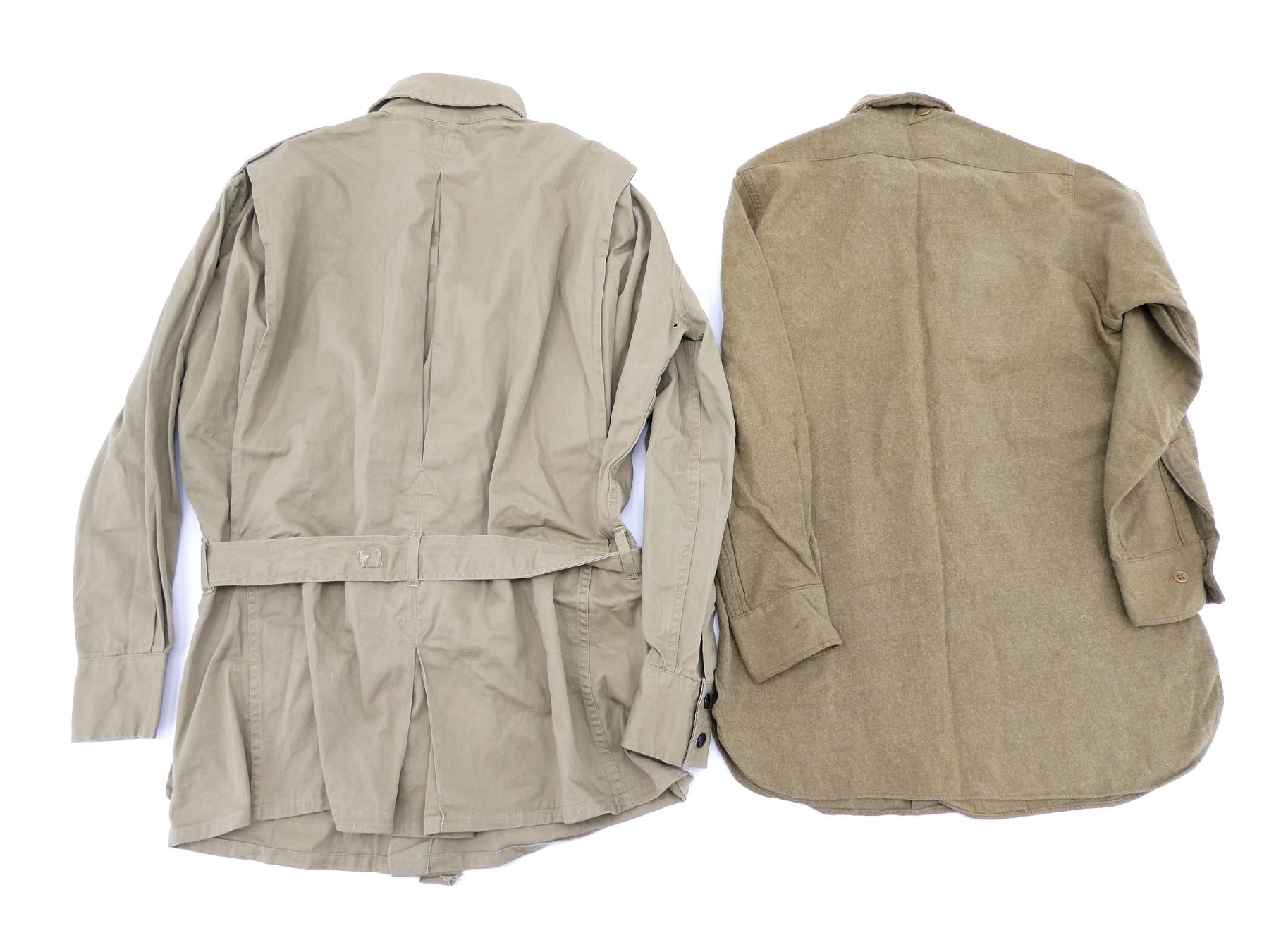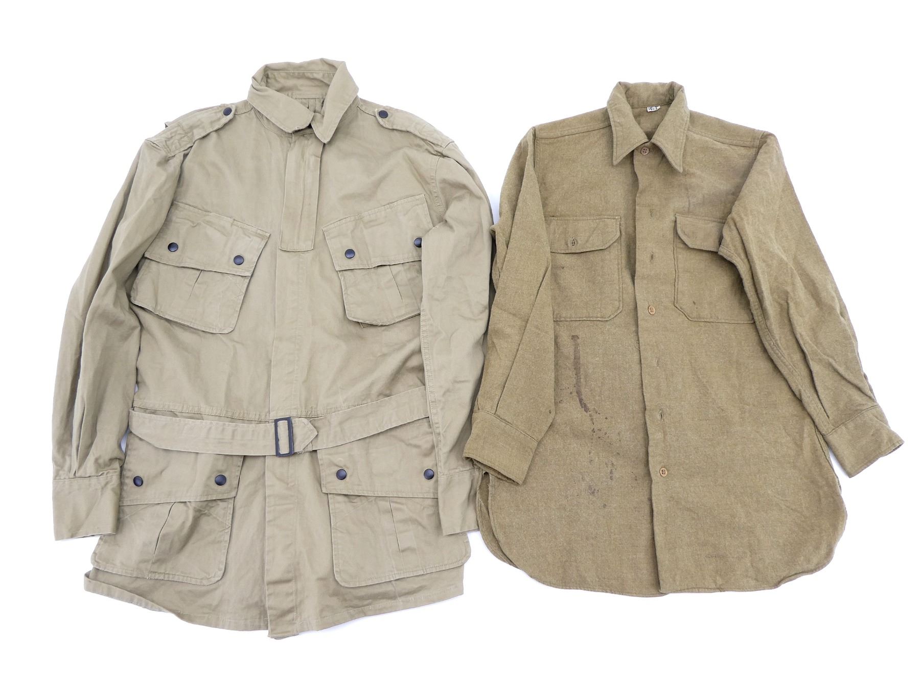 LOT INCLUDES; (1) SPECIAL COAT-STYLE OD FLANNEL SHIRT, SIZED: 14 1/2-32, NO OTHER VISIBLE MARKINGS, BUTTON-FRONT, LONG-SLEEVED, SHOWS WEAR, SHOULDER WIDTH APPROX. 15" & (1) REPRODUCTION M1942 PARACHUTE JUMPER COAT, SIZE 38 R, VARIOUS MARKINGS / LABELS, ZIPPERED-FRONT (WORKS), WITH WAIST BELT. SEE PHOTOS.