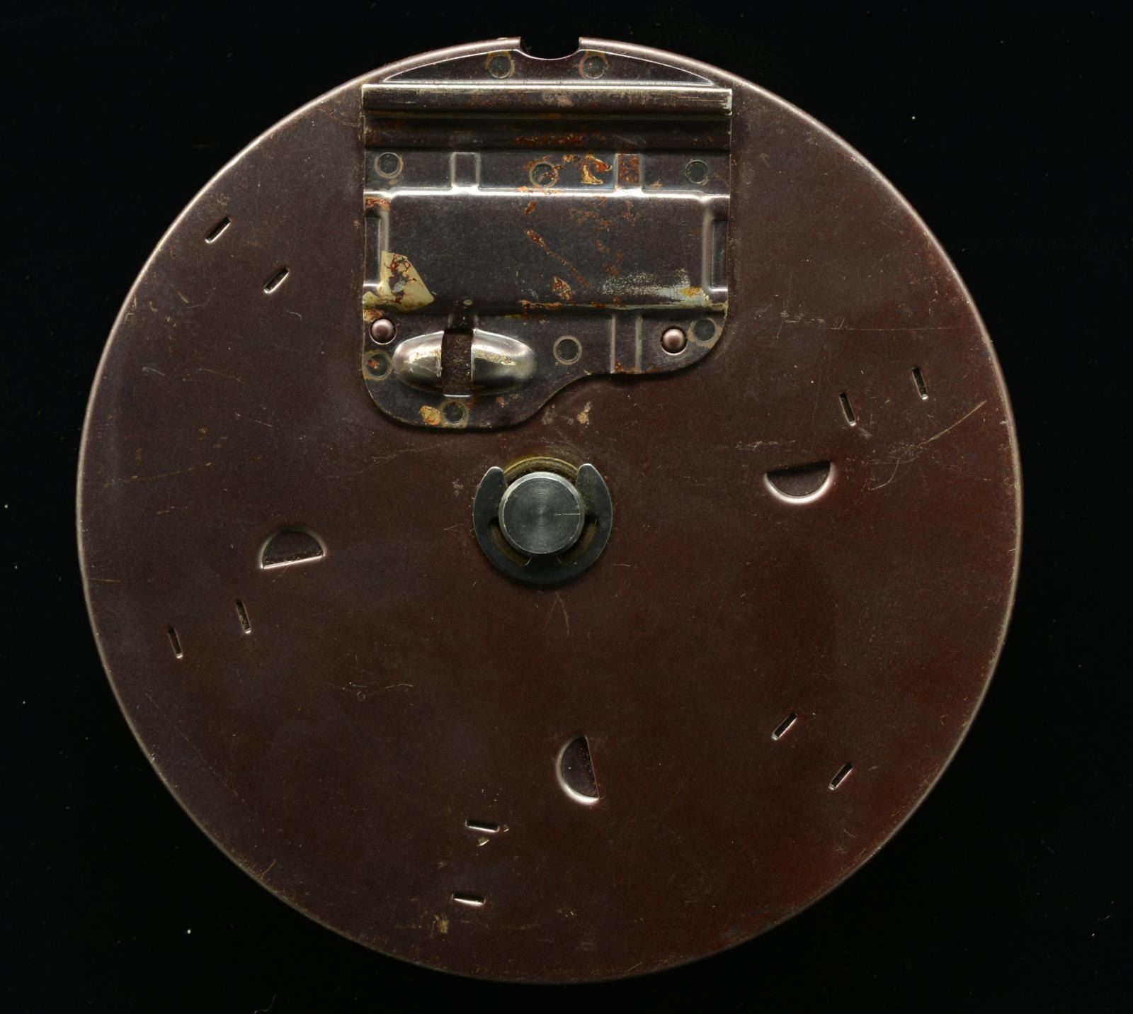 1) Matte finish front data plate marked “MAGAZINE TYPE L. THOMPSON SUBMACHINE GUN. 50 CARTRIDGES CAL. 45. FOR 1928 MODEL WIND TO 9 OR 11 CLICKS.” Marked below data plate w/ dbl. lined letter “U”. Front face plate marked w/ Thompson bullet logo & "WIND TO 9 OR 11 CLICKS”. Rear data plate marked “AUTO-ORDNANCE CORP. BRIDGEPORT, CONNECTICUT. REGISTERED IN THE U.S. PATENT OFFICE”. Marked below data plate w/ dbl. lined letter “U”. Inside tan canvas pouch marked w/ bullet logo & MILLS. (02-13613). 2) Blued finish on front cover. Brown finish on rear cover. Front & rear data plates unmarked. Front face plate marked “AUTO-ORDNANCE CORP. WEST HURLEY, NEW YORK, U.S.A.” & Thompson bullet logo. CONDITION: no major dents that would appear outwardly to influence function. Drum #2 has a very light dent in the front data plate, though it doesn’t seem to be deep enough to affect drum function. (02-13614). 3) Parkerized, matte finish. Front data plate marked “MAGAZINE TYPE L. THOMPSON SUBMACHINE GUN. 50 CARTRIDGES CAL. 45. FOR 1921 MODEL WIND TO 11 CLICKS. FOR 1928 MODEL WIND TO 9 CLICKS". Rear data plate marked “AUTO-ORDNANCE CORP. NEW YORK, N.Y., U.S.A. PATENTED. JULY 27, 1920. DEC. 7, 1920". (02-13615/JZ). $900-1,200.
