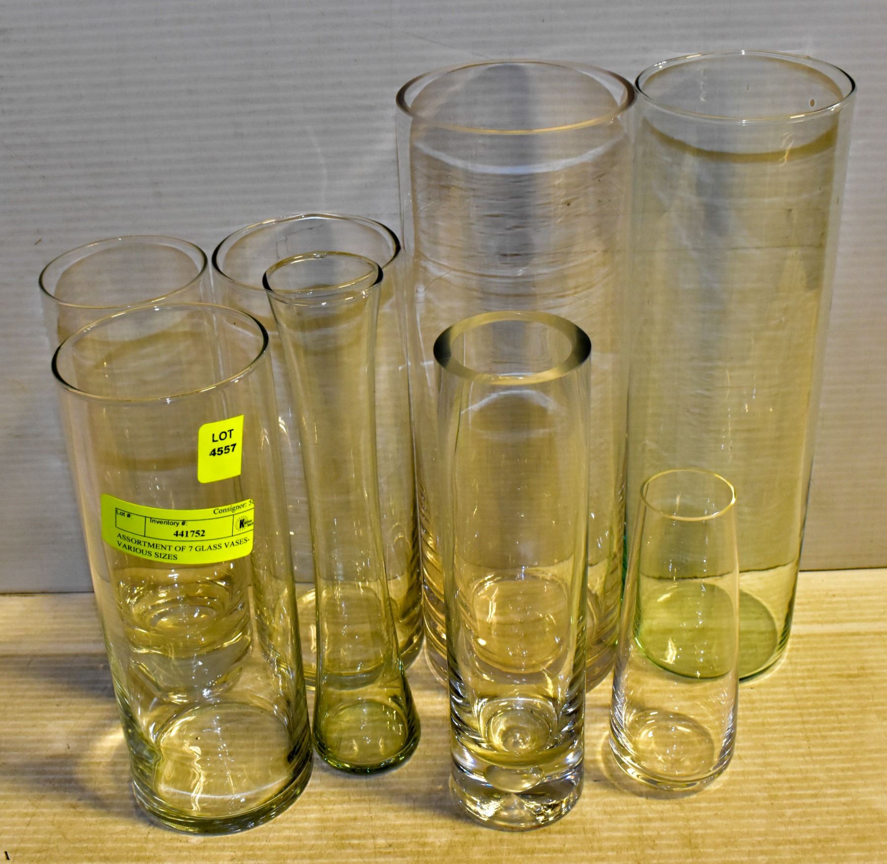 ASSORTMENT OF 7 GLASS VASES- VARIOUS SIZES