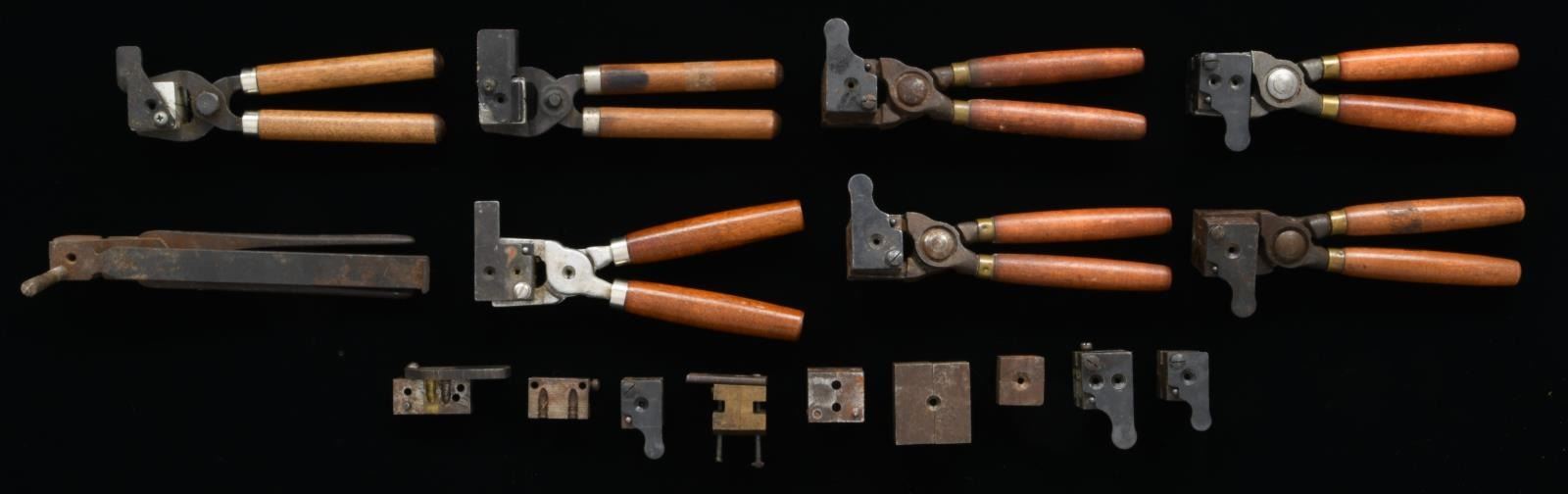 BALL. Mold brands include Lyman, Ideal & Lee. Some with handles. Some molds appear to be shop made but most are commercial production. 1) Ideal # 575-213 w/ handles. Plug for hollow base is not present. 2) Lyman # 575-213 w/ handles. Plug for hollow base is not present. 3) Lyman # 685 650 w/ handles. Plug for hollow base is not present. 4) Ideal double cavity # 403 89 rnd. ball w/ handles. 5) Ideal # 516 rnd. ball w/out handles. 6) Lyman # 375 rnd. ball w/out handles. 7) Ideal 358 125 conical rnd. nose, double cavity w/out handles. 8) Lyman # 371 double cavity rnd. ball. Sprue cutter & handles are not present. 9) Unknown double cavity rnd. ball marked "J 320 J 0104". 10) Lee ?0319 conical wadcutter bullet w/ handles. 11) Lee 500 - 36 - M. 50 cal. Minie wood handles. 12) Antique blacksmith made Conical bullet approx. 375 cal. w/ integral metal handles. 13) Unmarked brass triple cavity blocks. Approx. .266 diameter conical bullets. 2 bullets are Louverin Type & one is not grooved. 14) Unmarked steel blocks, no provision for handle. Approx. 50 cal. rnd. ball. 15) Approx. 44 cal. rnd. ball. Unmarked steel blocks. No provision for handle. 16) 2 non matching steel 1/2 blocks. CONDITION: molds will need to be cleaned. Cavities may have light scratches & oxidation. Exterior of molds have wear, oxidation & handling marks. Handles have scorching & cracking. (02-19707/RW). $300-600.