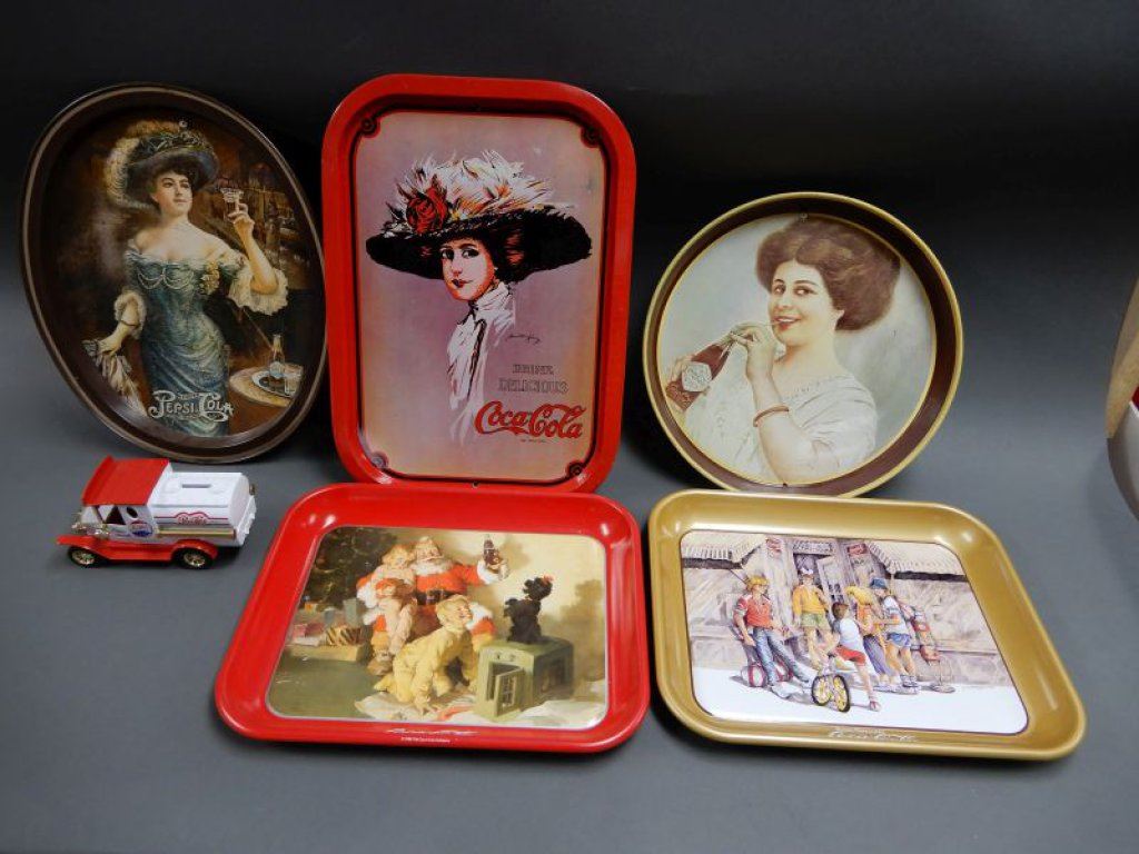 ASSORTMENT OF COKE & PEPSI COLLECTIBLES 5 COKE & PEPSI TRAYS - NAIL DAMAGE ON TRAYS- PLASTIC PEPSI TRUCK LOCATION: SODA SHOP