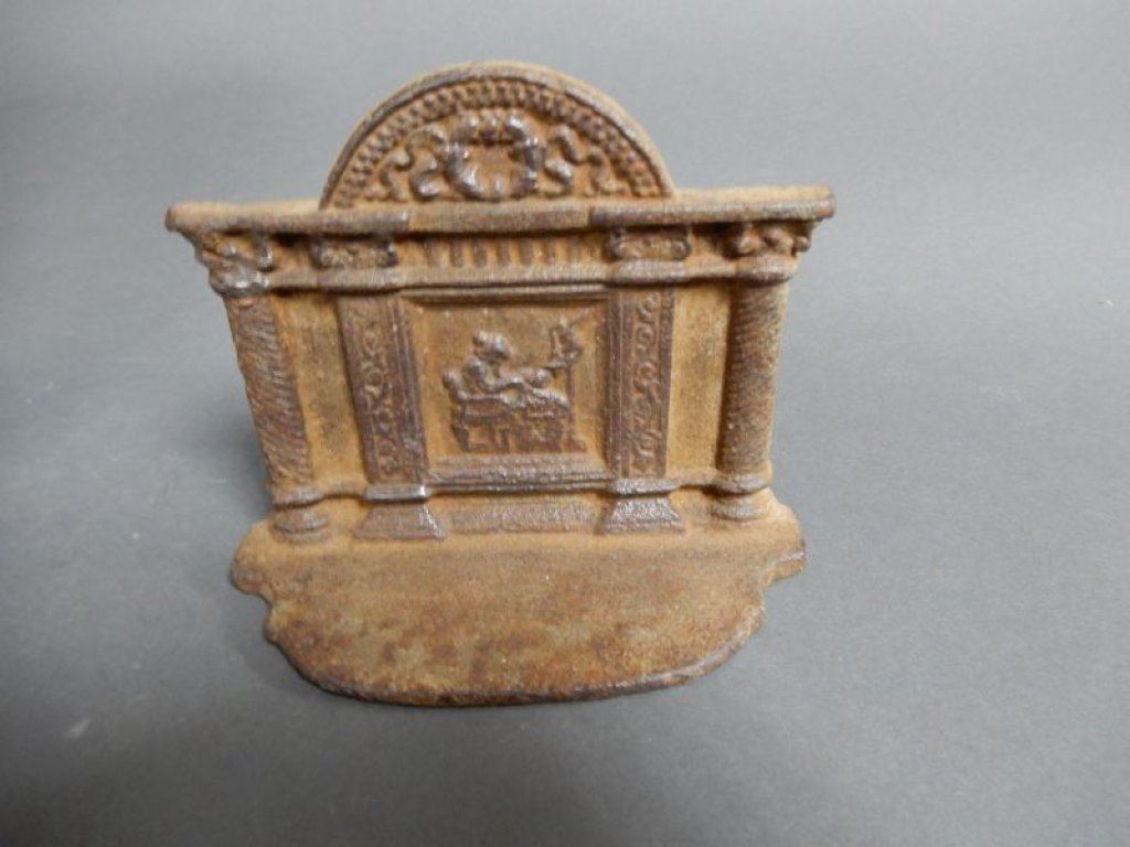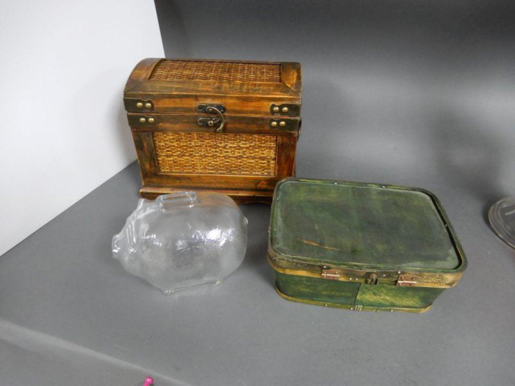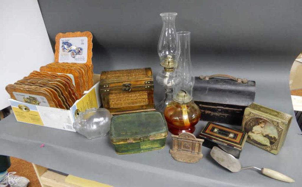 29 HARDBOARD "OLD TIMERS" PERFECT CIRCLES - 2 OIL LAMPS - CAST BOOKEND - 2 PIGGY BANKS LUNCH BOX - 2 WOODEN BOXES & TIN - LIFTER
