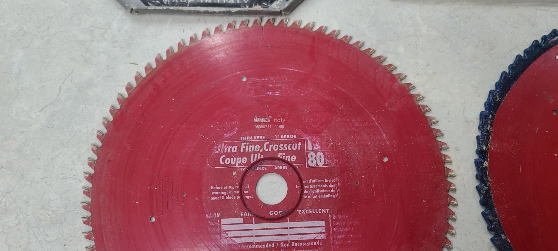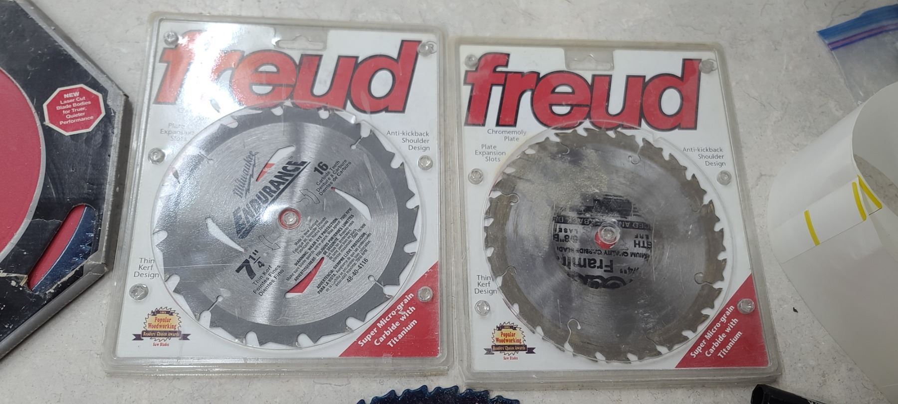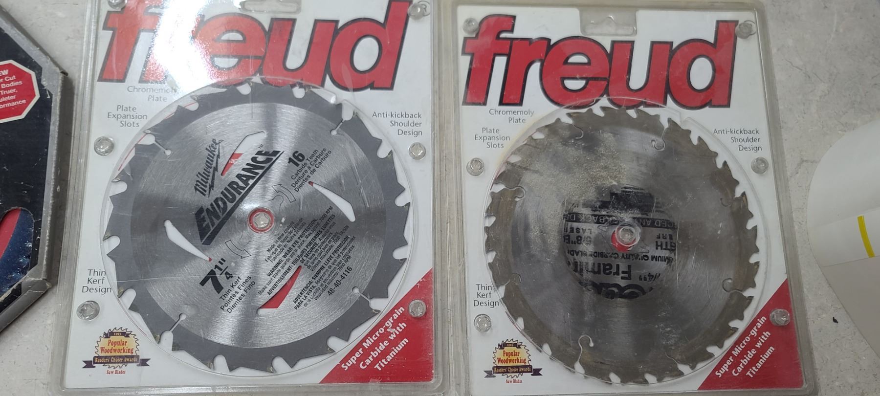 ASSORTMENT OF FREUD BLADES - TWO 7 1/4" AND THREE 12" ULTRA FINE CROSS CUT - LASER CUT BLADE AND SUPER MICRO GRAIN CARBIDE WITH TITANIUM