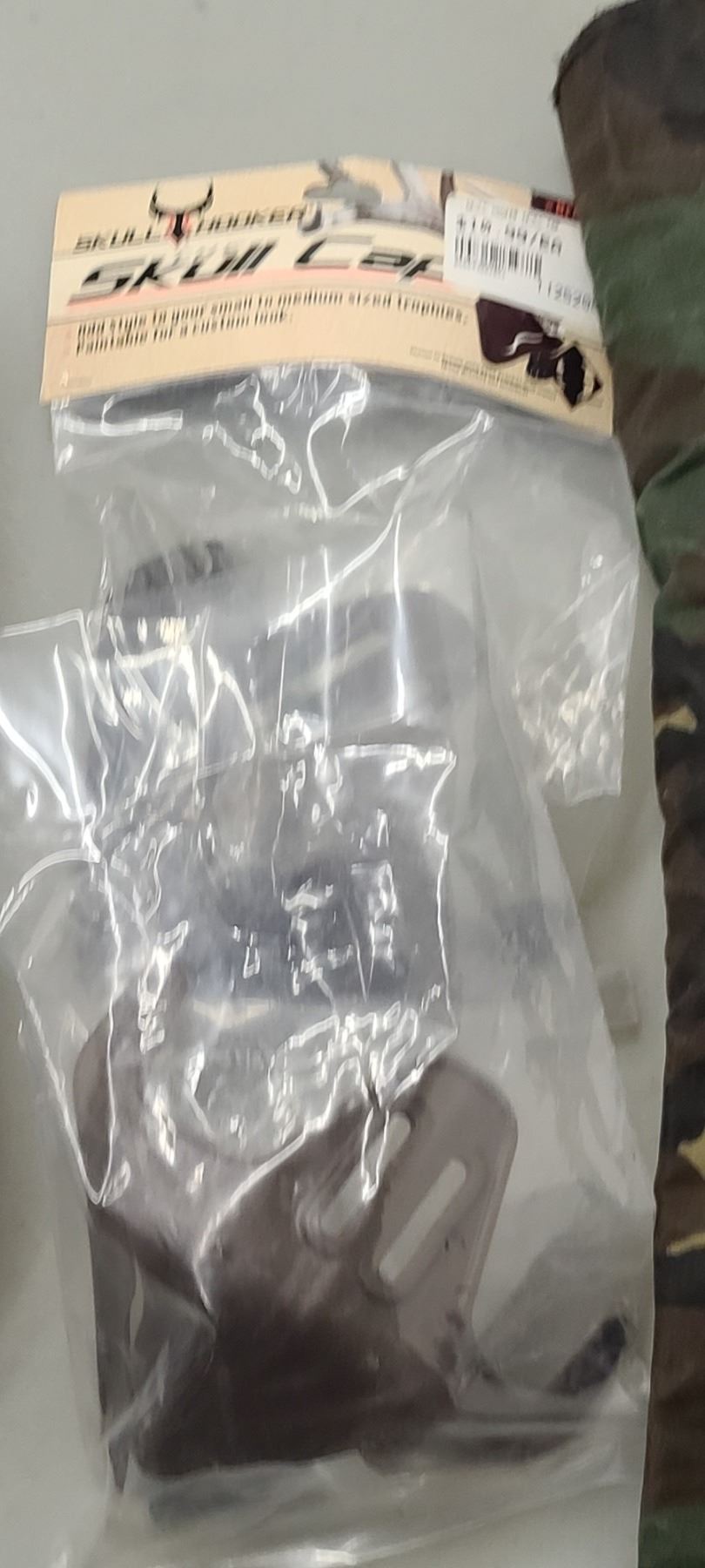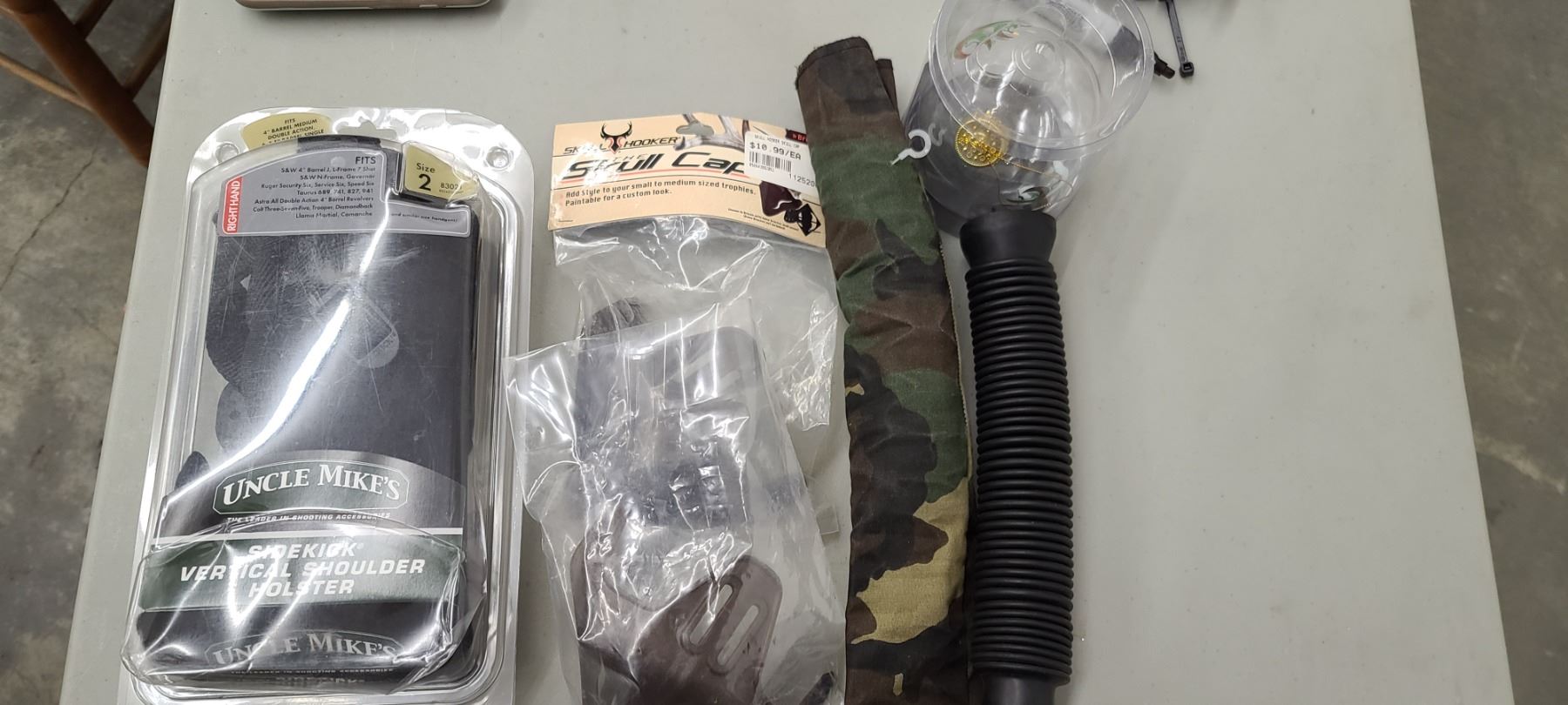 ASSORTMENT; VERTICAL SHOULDER HOLSTER, JOHN DEER ORNAMENT, 2 SKULL CAPS