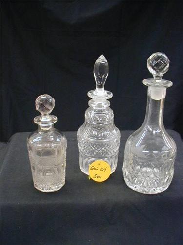 ASST. DECANTER LOT INCLUDES (1) 10 1/2in CUT & ETCHED VINE CRYSTAL DECANTER W/STOPPER, (1) 10in CUT CRYSTAL CRYSTAL DECANTER W/STOPPER, (1) 7in PRESSED GLASS DECANTER W/STOPPER, 3 PC EXCELLENT