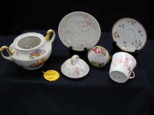 ASST. LIMOGES PATTERNS INCLUDES (1) 7in SPREAD 3inT DBL. HND. SUGAR CH. FIELD HAVILAND PINK & ROYAL BLUE BOUQUETS W/PINK ROYAL BLUE PETUNIA & STARFLOWER IN BASKET ON TOP EDGE EXCELLENT, (1) 4 1/2in SAUCER PINK ROSE FLORAL CH. FIELD HAVILAND, (1) 5in BOWL J.