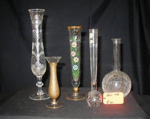 ASST VASE LOT INCLUDES (1) CRACKLE VASE 9in, (1) DENMARK BUD VASE W/ BUBBLE BASE OVERALL 9 1/2in, HNDPTD. VASE W/GOLD TRIM 10in, (1) GOOFUS LIKE VASE 6 1/4in, (1) CUT VASE W/RIM CHIP 12in, 5 PCS