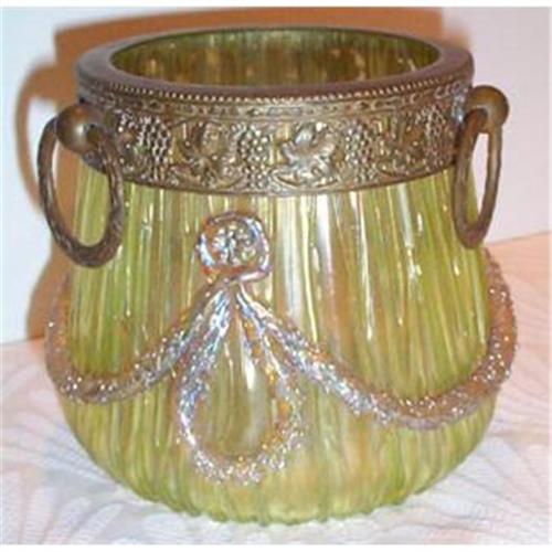 This is an ASTOUNDING Loetz Vase that is Empire Style with adorning swags and cartouches and a metal collar. This vase is in SUPERIOR condition with no chips, cracks, or dings not even to the swag adornment. There are a very few minor flakes under the metal collar but that has to be removed to see them. This vase is a yellow vaseline color and it measures 4" in diameter at its base and about 3.50" at its opening and stands a very stately 4.25" tall. This is an EXTREMELY RARE piece of Loetz.