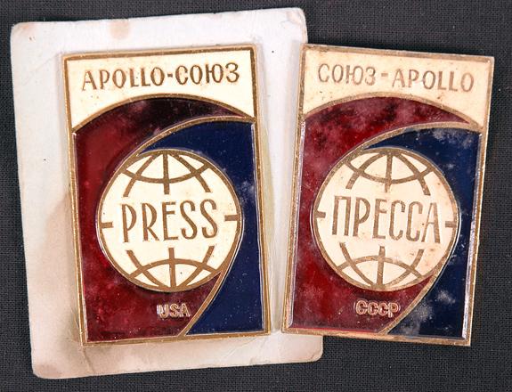 ASTP, 1975, Russian Metal "PRESS" Badges (1.5x2.5") These two enameled metal PRESS badges were issued in versions for American and for Russian members of the press. One reads: "Apollo-Soyuz / Press / USA" and the other reads: "Soyuz-Apollo / NPECCA /CCCP". The US badge is blued to a piece of blue card, whereas the Riussian badge has a pin back. An attractive pair.