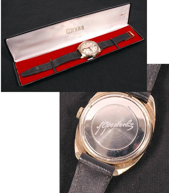 ASTP, 1975, Russian "Slava" (Glory" Presentation Wristwatch. This watch is engraved on the back with the autograph of Leonid Ilyich Brezhnev, General Secretary of the Communist Party / Russian Premier from 1966-1982. Deke, and the other US crew members received these watches during a post-flight ceremony with the Soviet crew members and the Soviet Premier, which lasted in excess of an hour. The Soviet crew, Leonov and Kubasov, received "Hero of the Soviet Union", gold medals from the Premier at a subsequent ceremony.