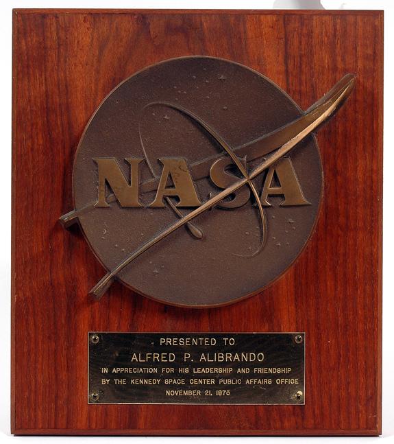 ASTP Program, 1975, "Leadership" Award Plaque (10.5x12") This heavy plaque consists of a massive brass "NASA Meatball" patch mounted on a thick wooden plaque. There is a polished brass plate on the bottom that reads: "Presented to Alfred P. Alibrando / in appreciation for his leadership and friendship by the Kennedy Space Center Public Affairs Office / November 21, 1975".