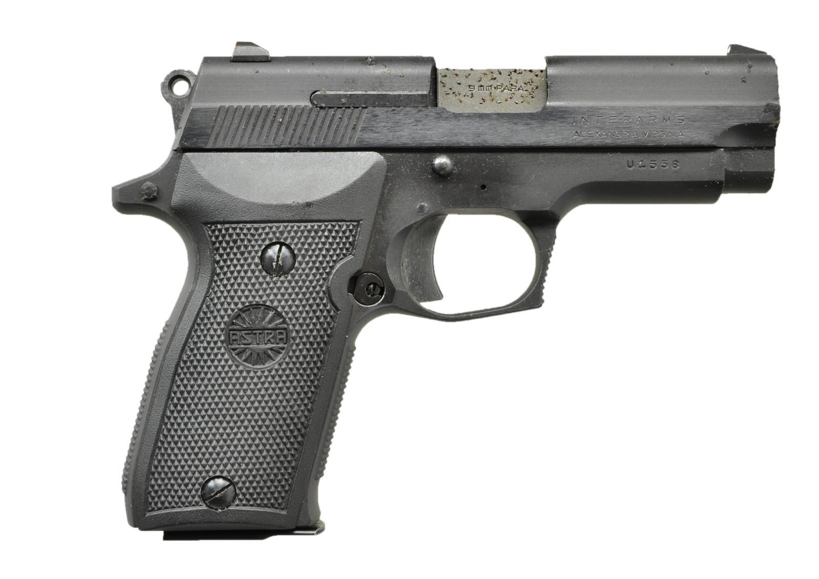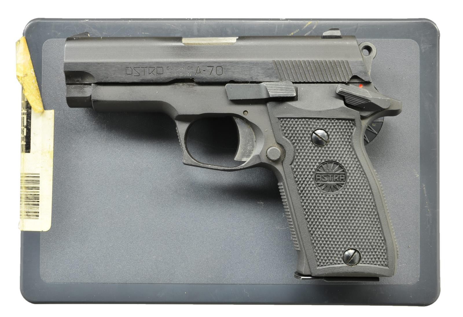 Cal. 9mm Luger. Ser. #U1558. Bbl. 3-1/2". Single action only. Imported by "INTERARMS ALEXANDRIA VIRGINIA". Right side of slide is marked "ASTRA" "A-70" "GUENICA SPAIN". 3 dot fixed sights. Loop type hammer. Black checkered plastic grips w/ "ASTRA" logo. MAGS: 2 8 rd. mags. UNATTACHED ACCESSORIES: matching plastic carrying box. CONDITION: pistol is in very good overall condition w/ very light high point wear. Left side of slide & bbl. have scattered fine pitting. Near excellent shiny bore. (22-4345/RW) MODERN. $300-500.