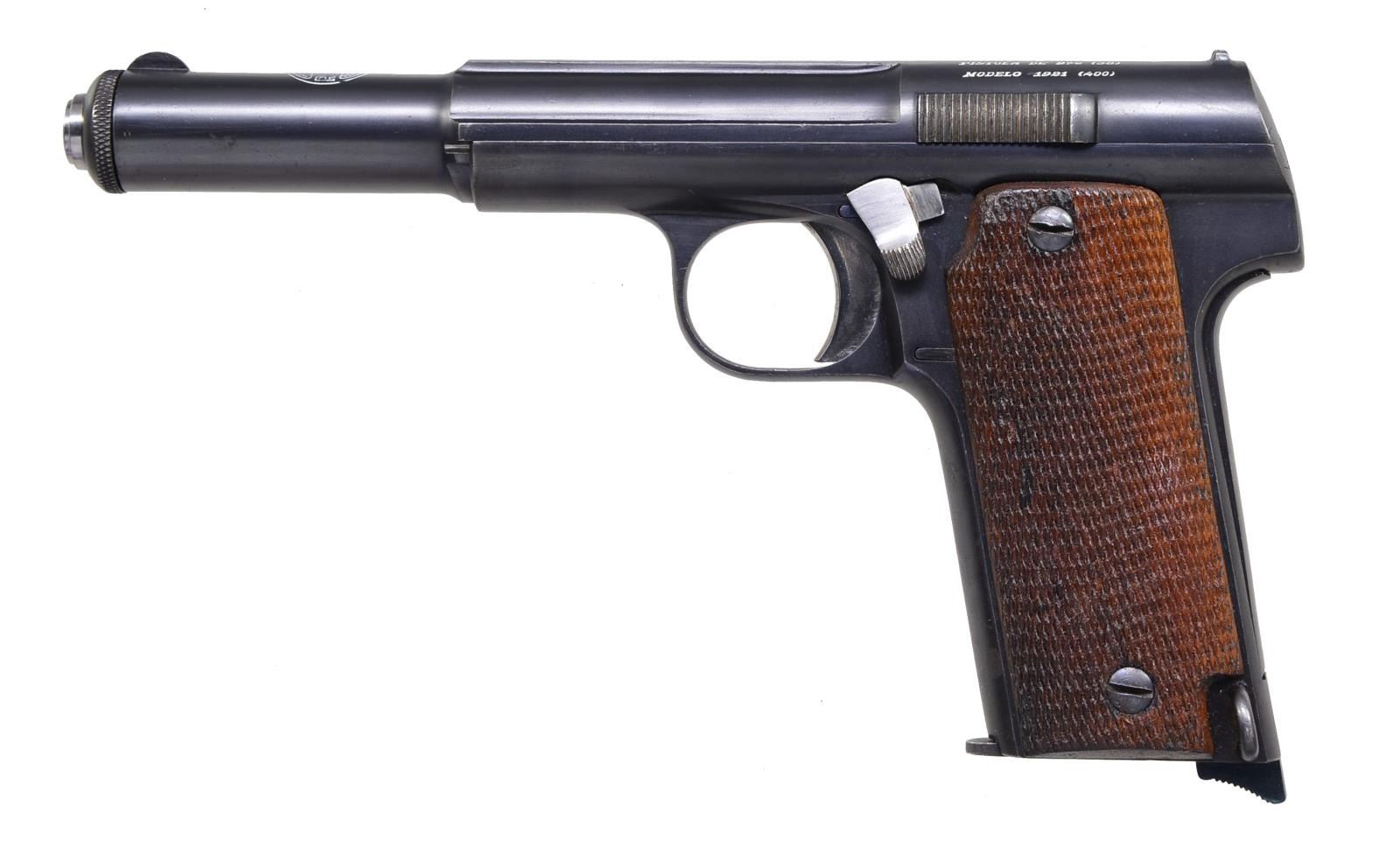 Cal. 9mm Largo. S# 86444. Bbl. 6" marked "9m/m & 38" indicating also for 38 ACP. Mfg. 1921-1945. Matching numbered slide & bbl. Checkered walnut grips w/ lanyard loop at left rear of butt. MAGS: 1 very good 9 rd. CONDITION: faint peppery oxidation in grip area especially front. All other aspects very good to excellent including bore & grips. (20-3064/NW). CURIO. $450-600.