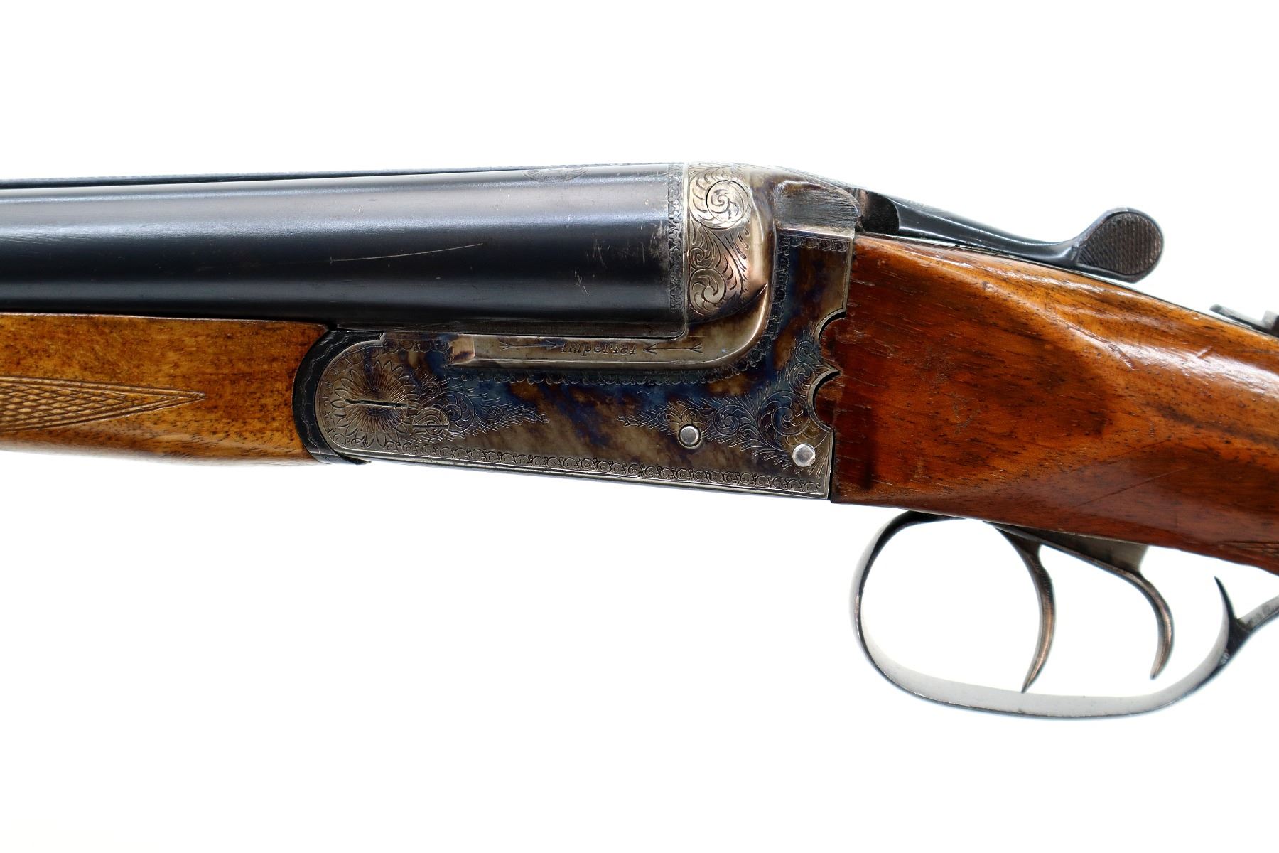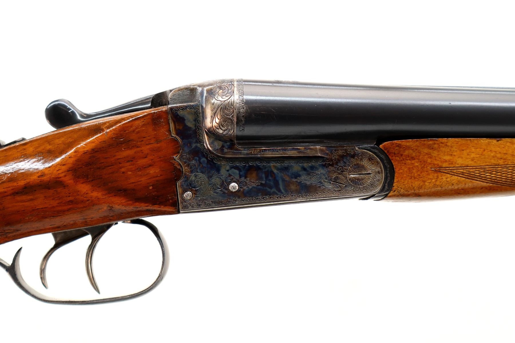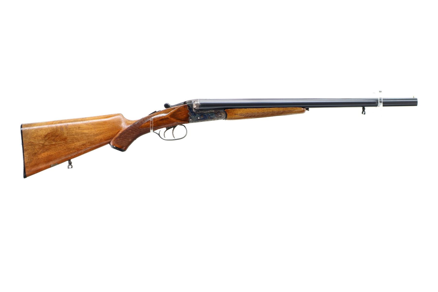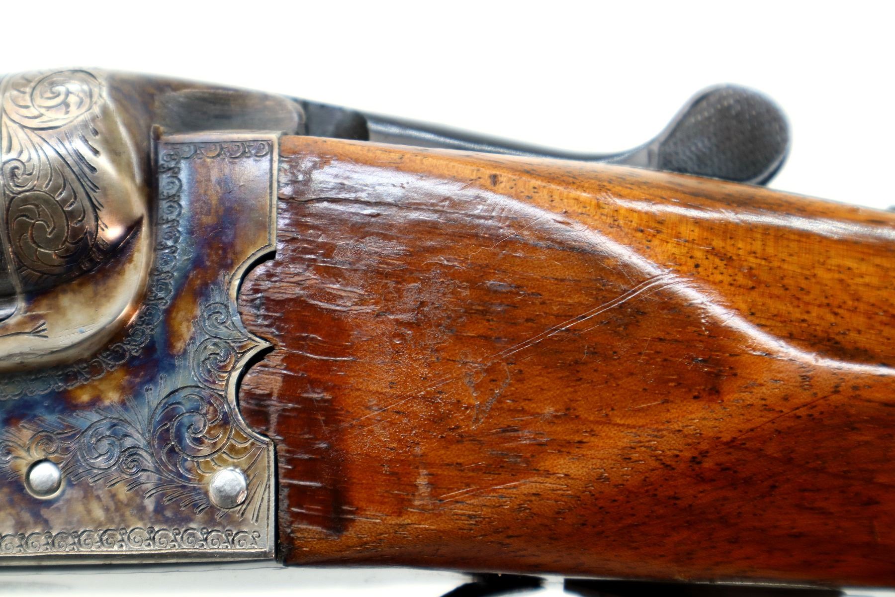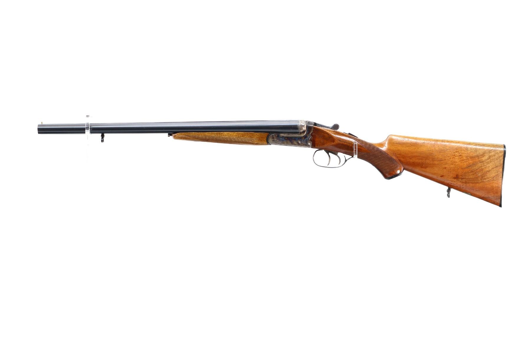 Main Description: Brass bead, shortened blued barrels with solid rib, engraved colour case hardened receiver, automatic safety, extractor, double triggers. Two piece wood stocks, checkered forearm and pistol grip, small cracks behind receiver and upper tang, grooved black polymer butt plate, vanity plate, grip cap, sling swivels.