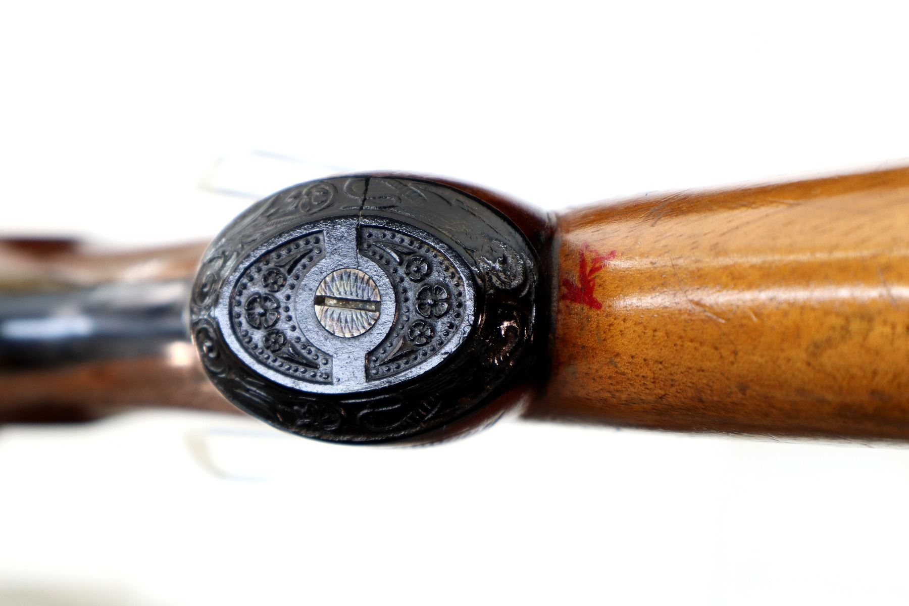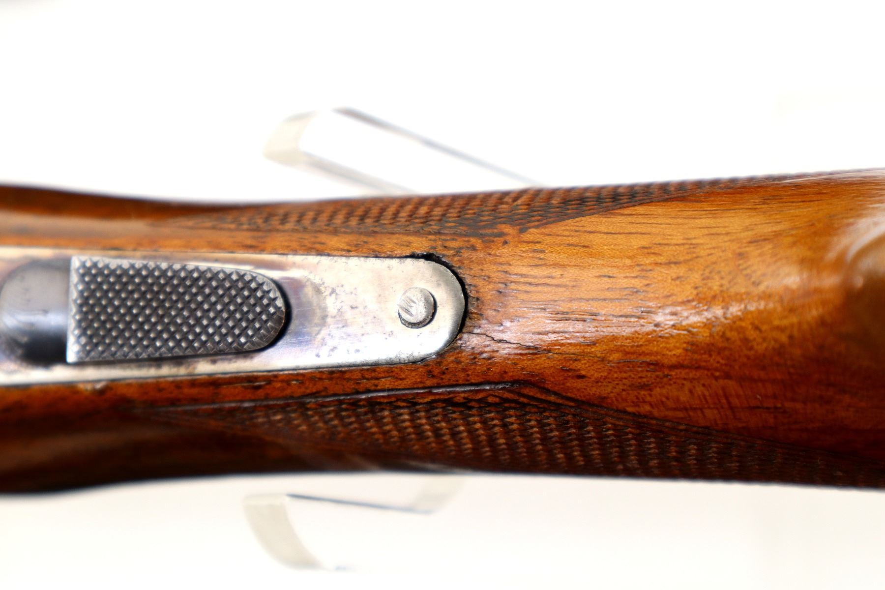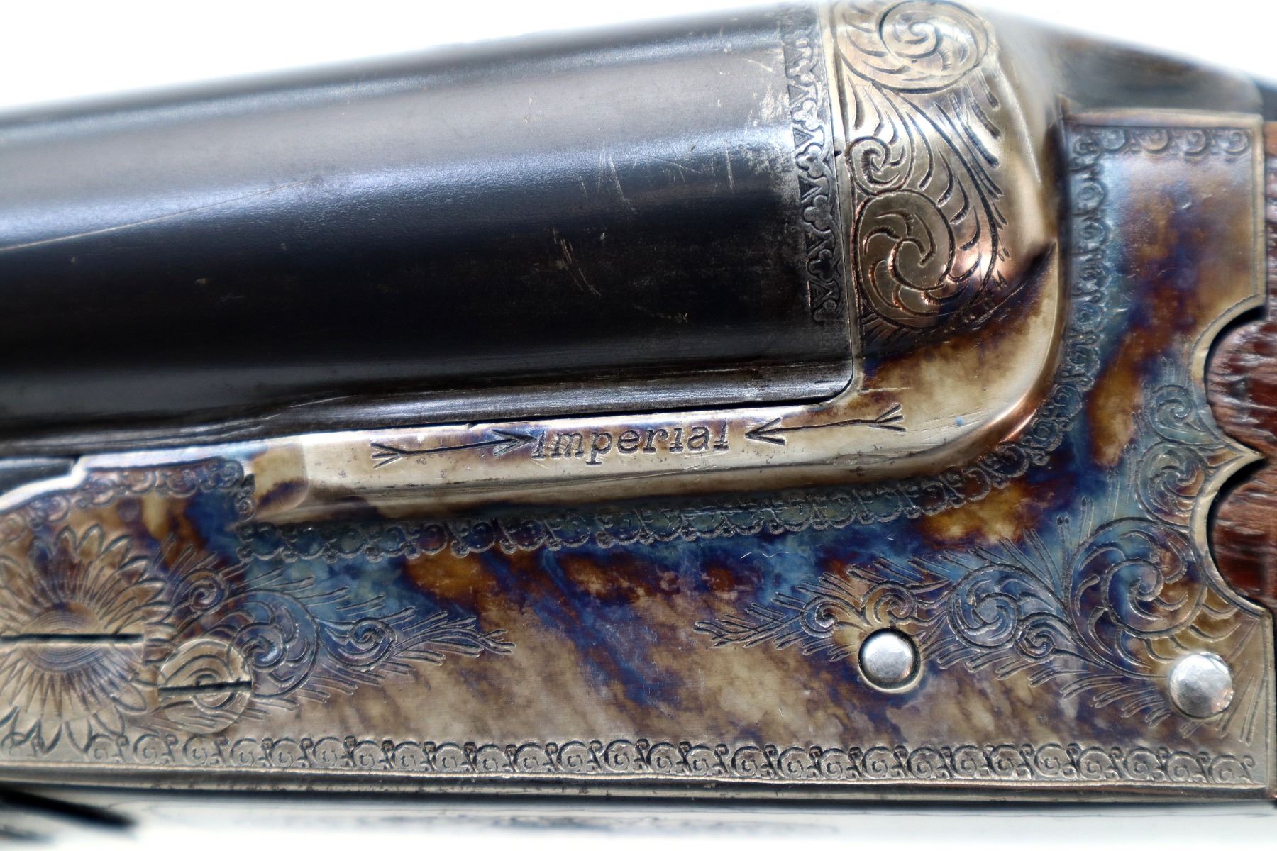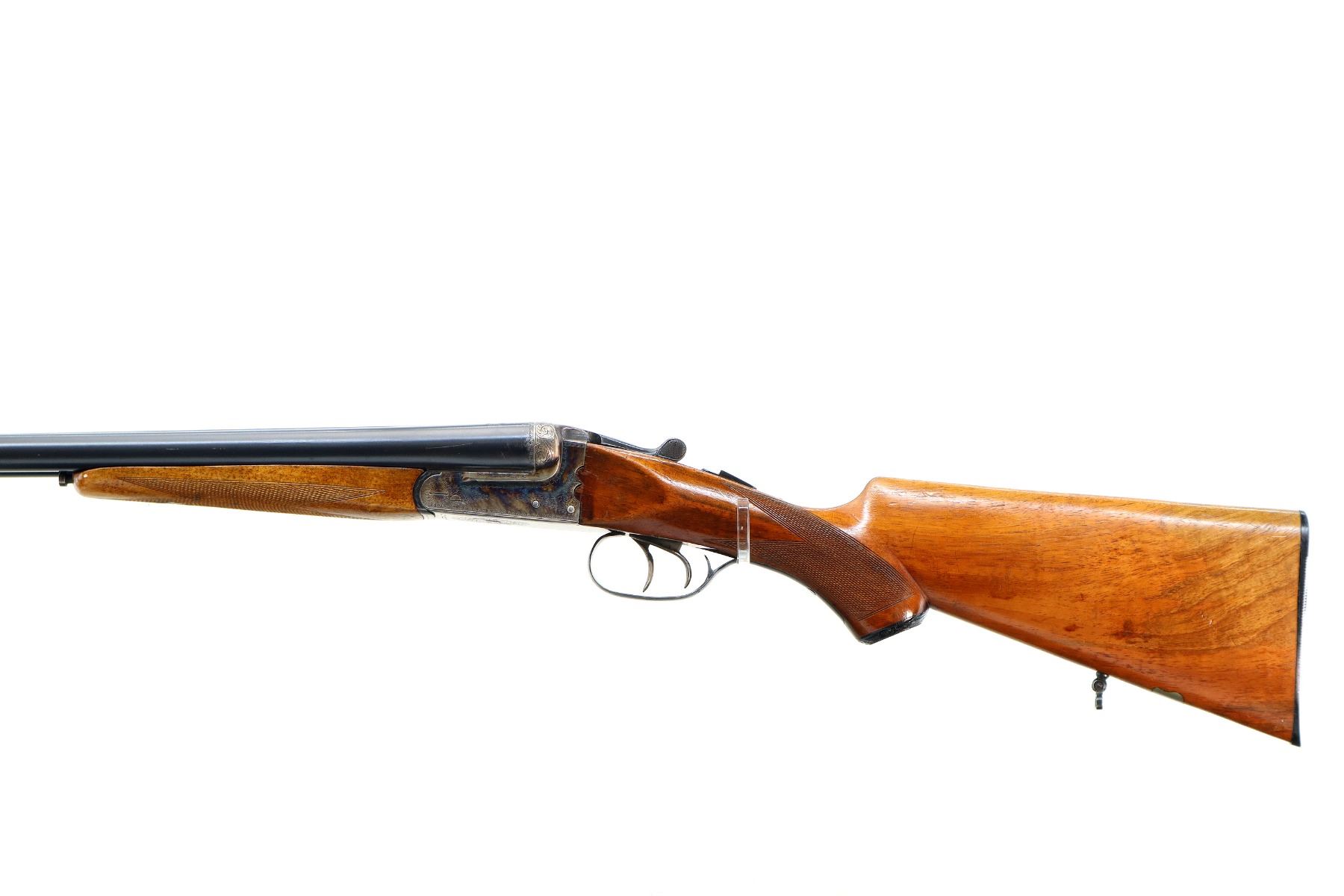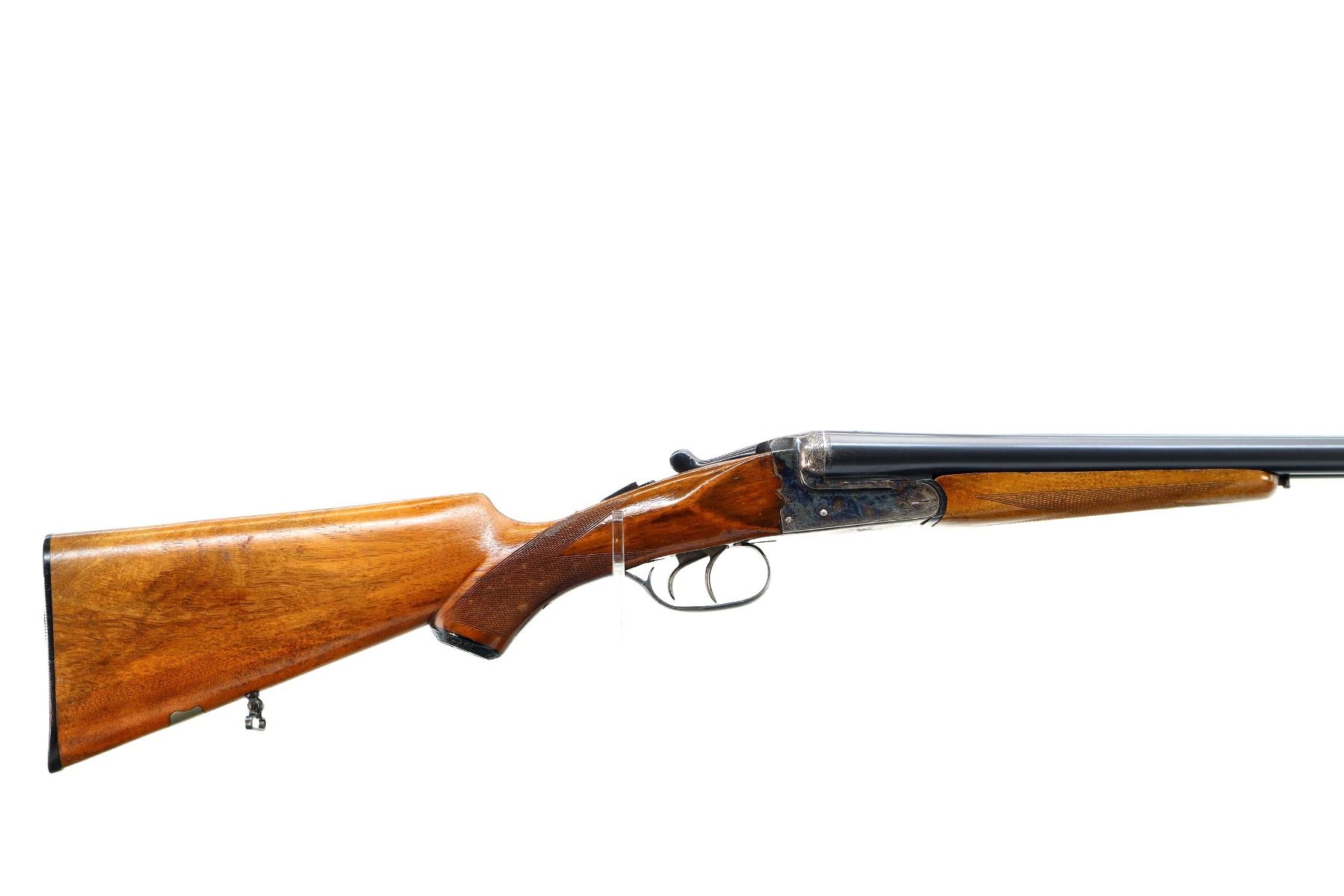 Main Description: Brass bead, shortened blued barrels with solid rib, engraved colour case hardened receiver, automatic safety, extractor, double triggers. Two piece wood stocks, checkered forearm and pistol grip, small cracks behind receiver and upper tang, grooved black polymer butt plate, vanity plate, grip cap, sling swivels.