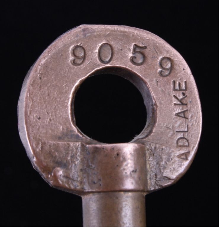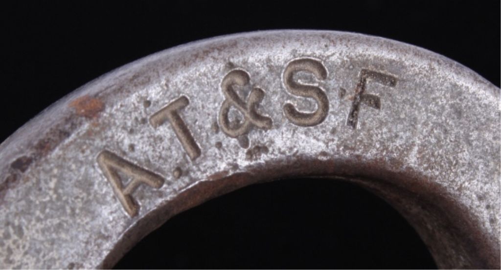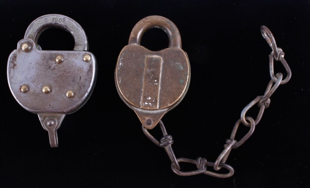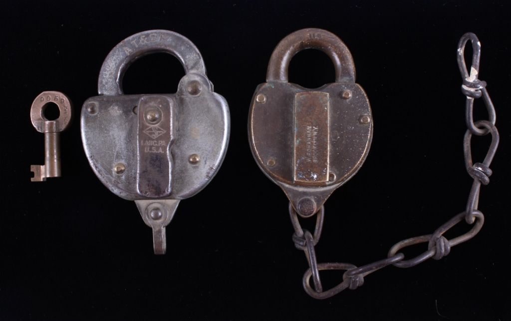 The lot features two original antique railroad locks. The first is an Atchison, Topeka and Santa Fe Railway Lanc. PA U.S.A. S 1962 with the original 9059 Adlake Wabash brass key. The other is a W. Bohannan Brooklyn N.Y. 119 Brass lock. AT&SF measures 4 5/8"x3" and the other is 2 5/8"x4" with a 9.5" chain.