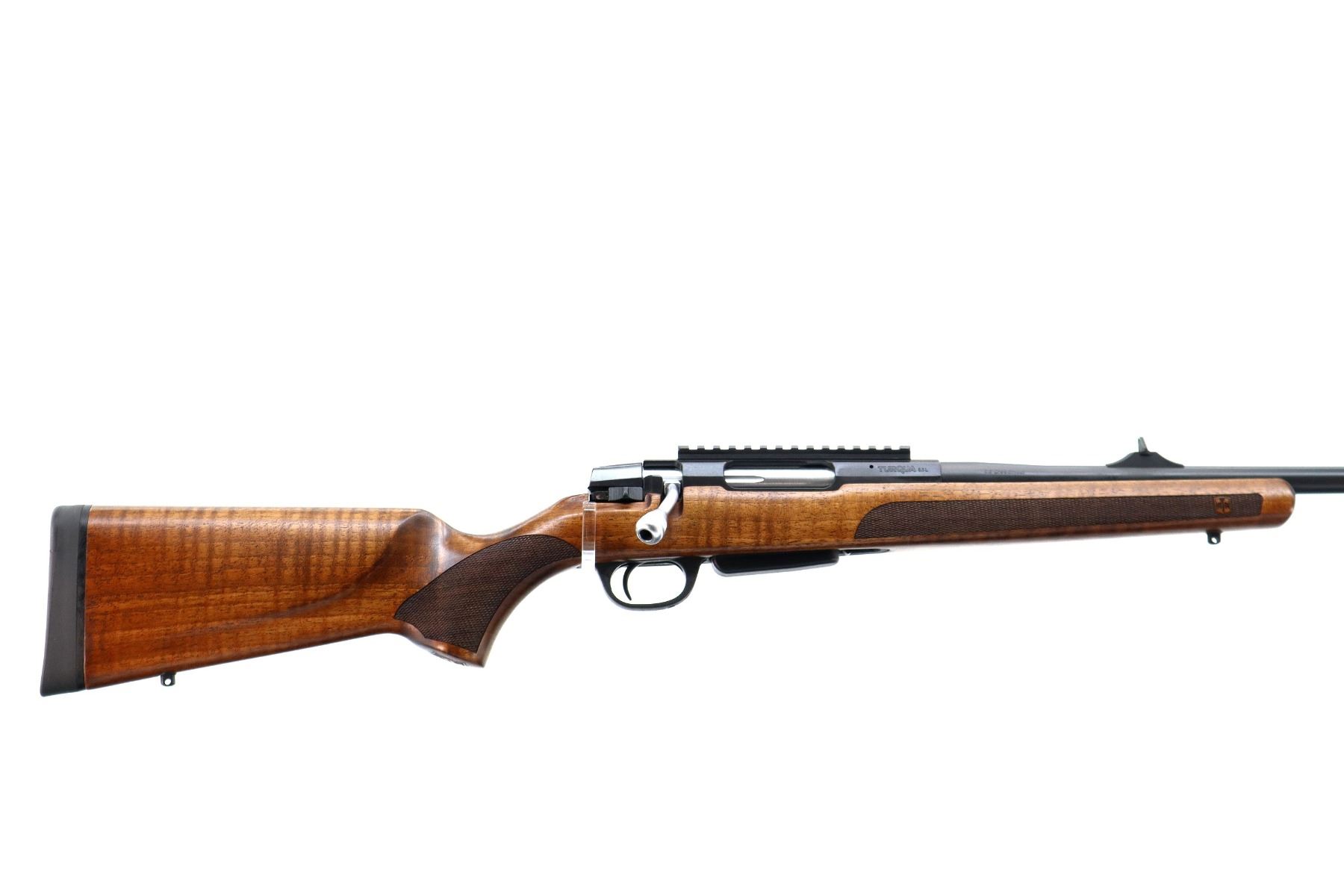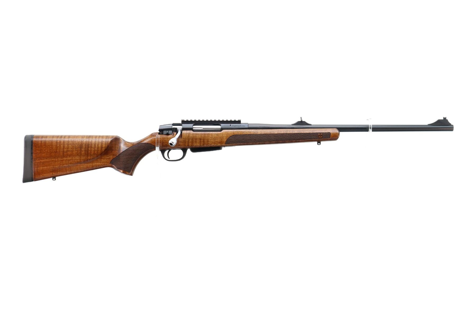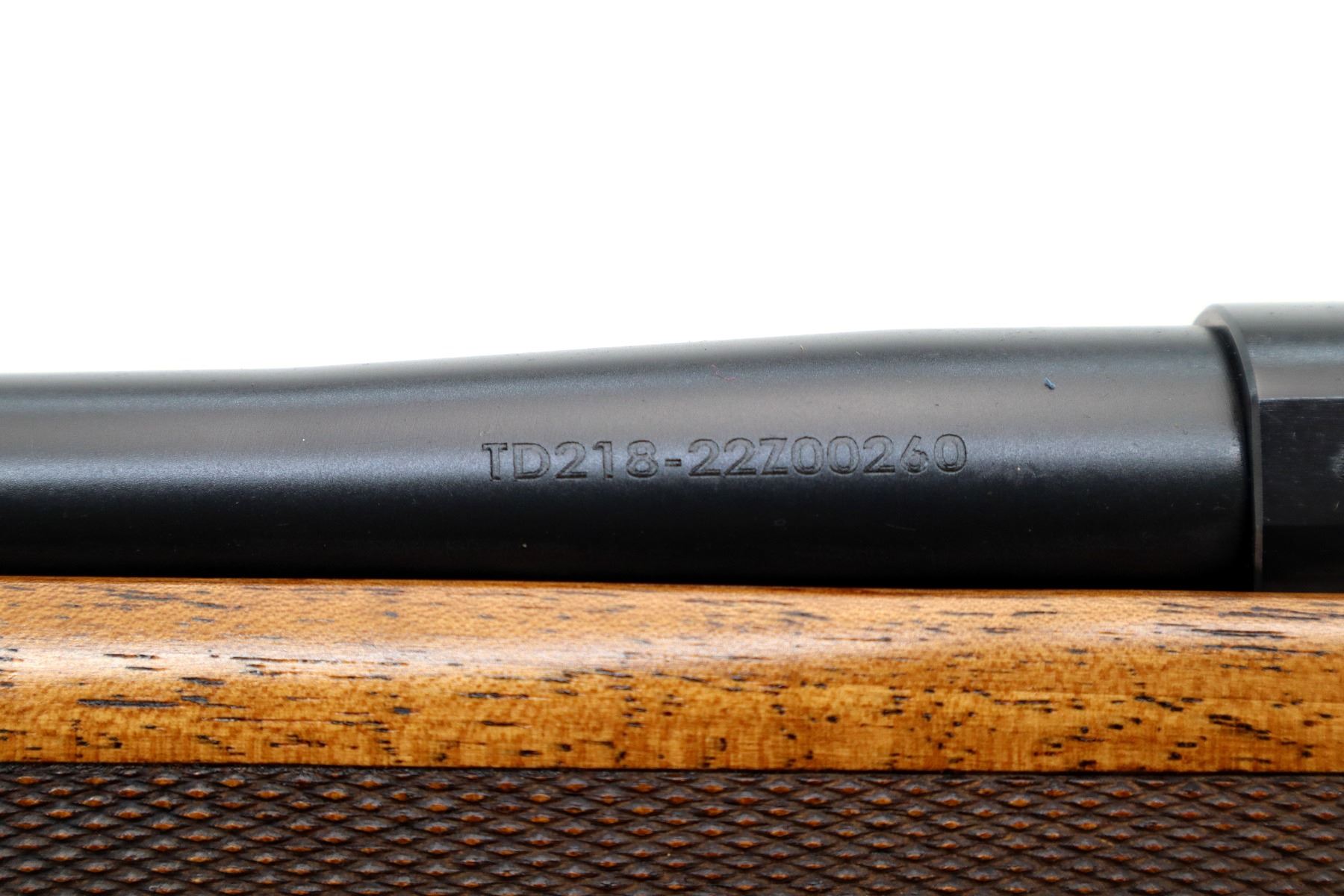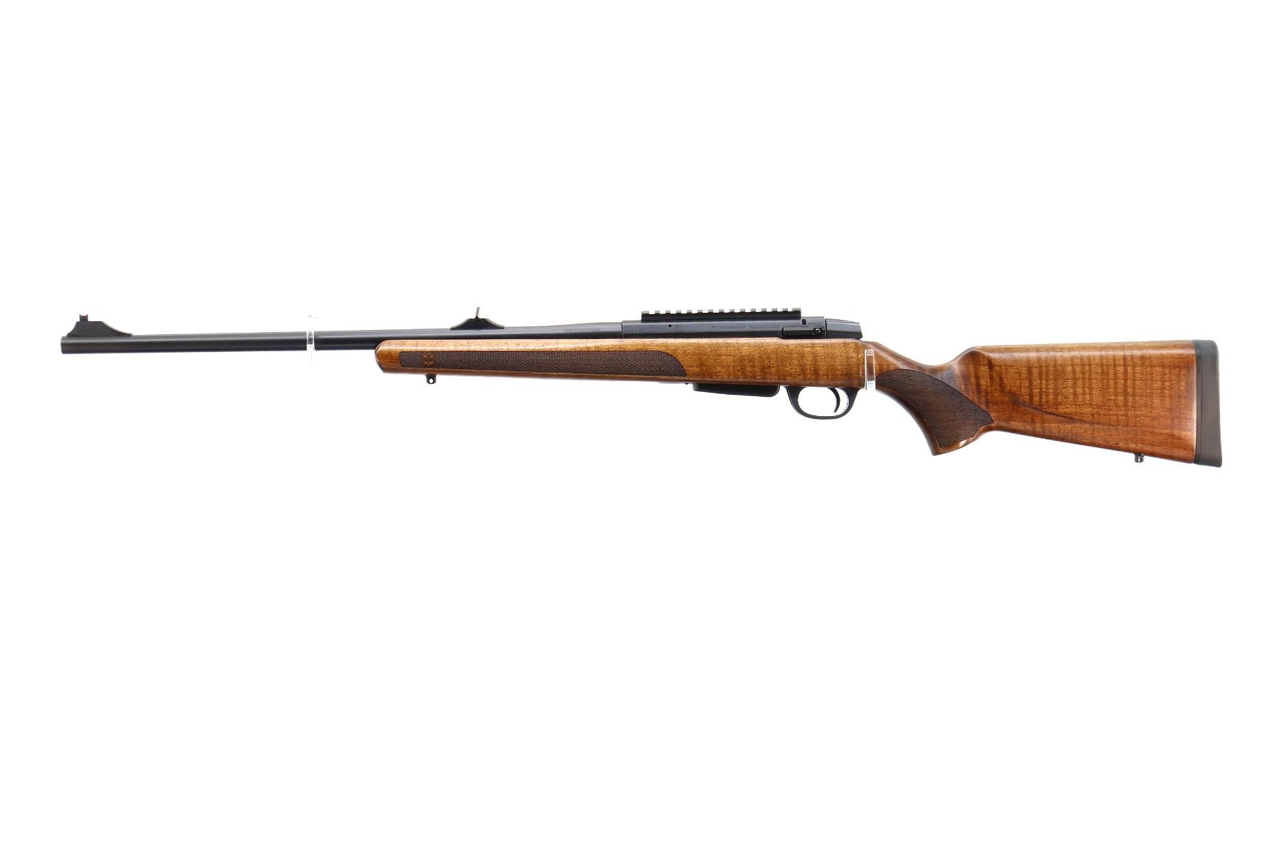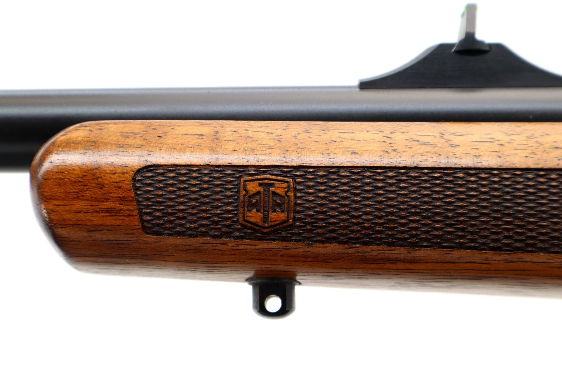 Main Description: Red fiber optic blade front sight with ramp, adjustable green fiber optic u notched rear sight with ramp, Satin blued metal finish, receiver drilled and tapped with one piece rail installed, silver fluted bolt with grooved knob. One piece Walnut wood stock, checkered forearm and pistol grip with ambi palm swells, black rubber recoil pad, swivel studs.