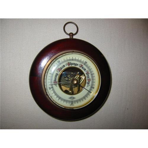 ATCo art deco style 6.5 inch German Mahagony wheel barometer is covered with glass, with brass hardware and has off white face. This instrument designed to measure the weight or pressure of the atmosphere to anticipate approaching weather changes. color of Pink letter a focal point (Stormy, Rain, Change, Fair, very dry) . excellent conditon,with some imperfections. scratches only. everthing in place. vintage and decorative. 6 " Diam. something to think about!