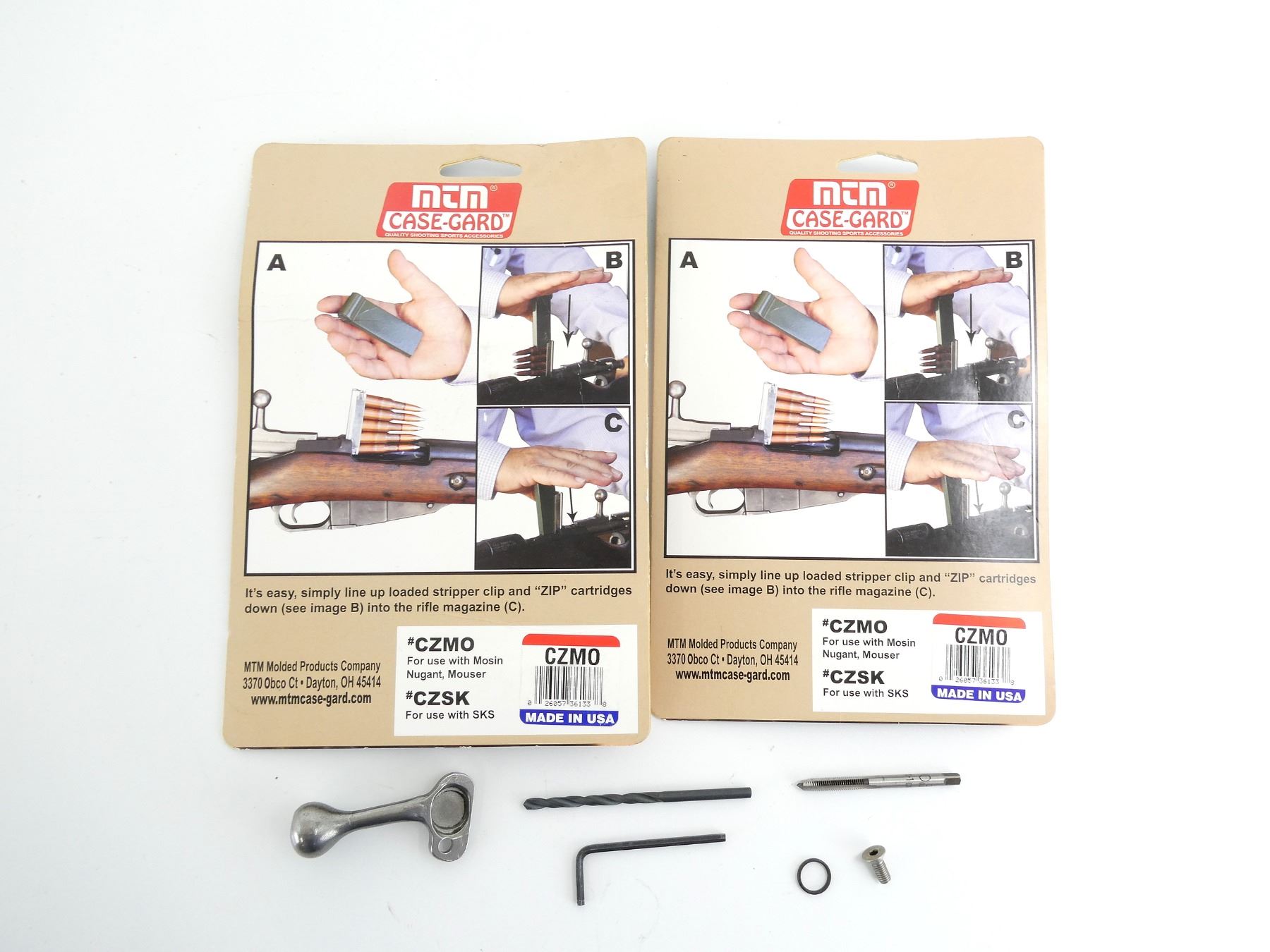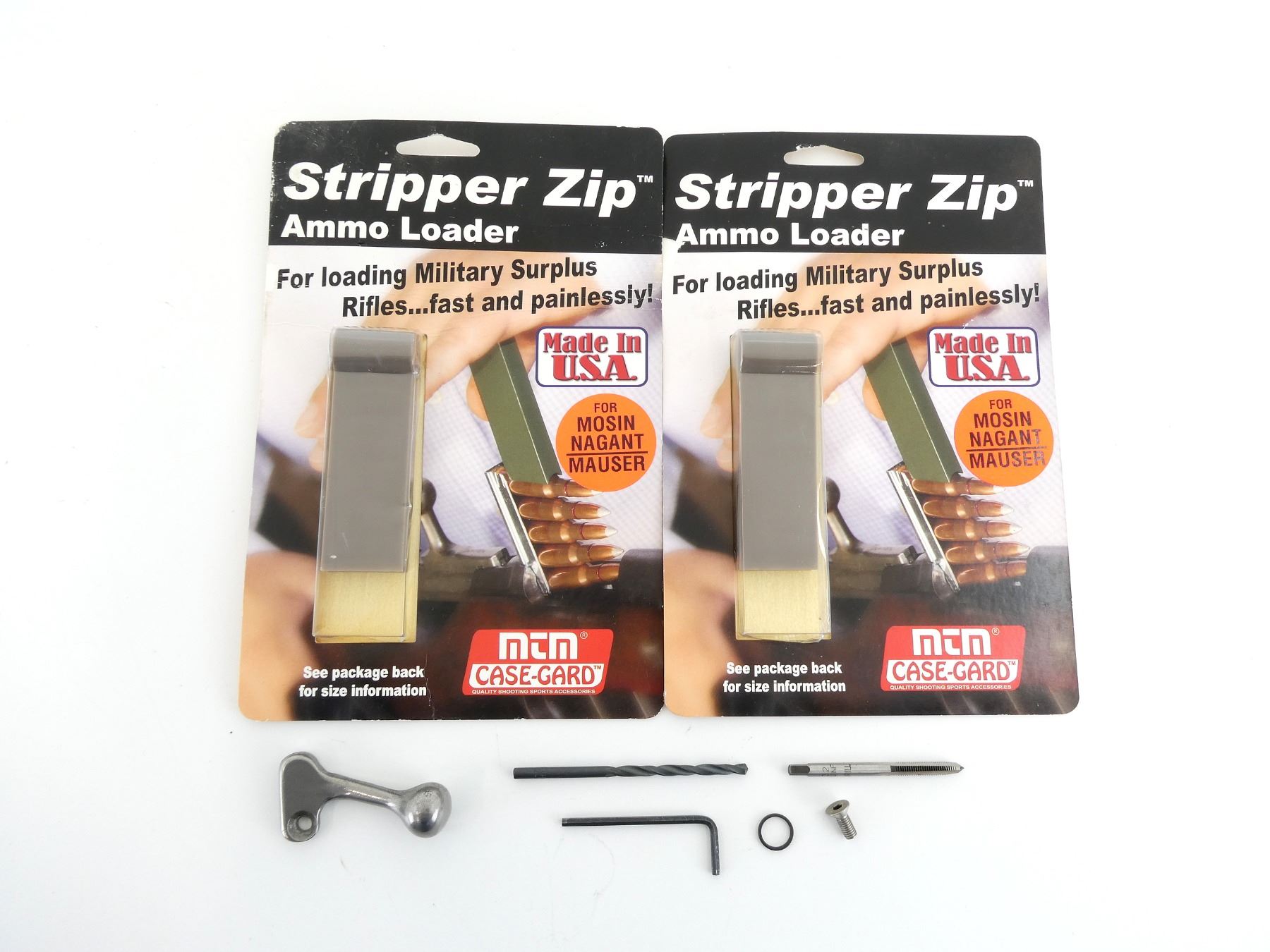 LOT INCLUDES; (1) ATI MOSIN NAGANT BOLT KIT, CONVERTS TO LOW SCOPE BOLT HANDLE, WITH DRILL BIT, TAP & MOUNTING SCREW, KIT MAY NOT BE COMPLETE & (2) MTM STRIPPER ZIP AMMO LOADERS, POLYMER, NOS IN ORIGINAL PACKAGING. MAY REQUIRE FITTING. SEE PHOTOS.