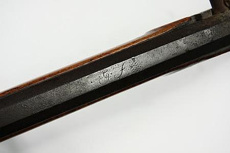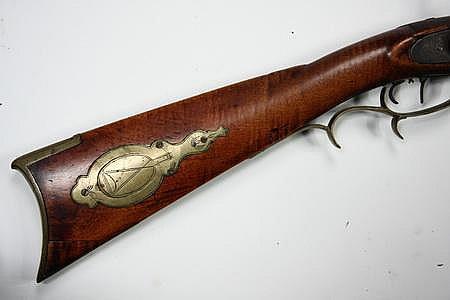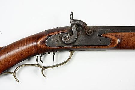 ATKINSON SET-TRIGGER LONG RIFLE - Pennsylvania Long Rifle with set trigger, marked Atkinson Warranted on the percussion lockplate, tiger maple stock, shaped and engraved brass patchbox in stock, longtail shaped brass trigger guard, brass butt and fittings, 43 1/2IN octagonal barrel with open sights, 58IN long overall.