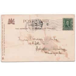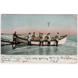 Postcard featuring sailors pushing life boat out to sea. Titled "Atlantic City, N.J.-Life Saving Crew". 1906 postmark on reverse.