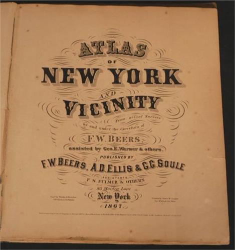 ATLAS OF NEW YORK & VICINITY, Beers, Ellis & Soule, 1867, covers worn, torn at spine, toning, some tears, contents not verified, PACKING AND SHIPPING (excluding insurance) $30,