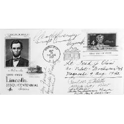 <b>1127. ATOMIC BOMB AVIATORS </b>Excellent first-day postal cover honoring Lincoln's birth, cancelled Washington, May 30, 1959, signed by five aviators associated with the dropping of the atomic bombs on Japan. Included are <b>PAUL TIBBETS</b> who adds "<i>Enola Gay Pilot</i>", <b>CHARLES W. SWEENEY</b> who adds: "<i>Aircraft Commander [Pilot] Nagasaki</i>", <b>FRED J. OLIVI</b>, adds "<i>Co-Pilot `Bocks Car''77' Nagasaki 9 Aug. 1945</i>", <b>THOMAS FEREBEE</b>, who adds: "<i>Bombardier Enola Gay Hiroshima</i>", and <b>JACOB BESER</b>, who adds: "<i>Radar Countermeasures Observer Enola Gay & Bocks Car</i>". Matted with brass descriptive plaque and set into a brown wood frame. <b>$150-200</b>