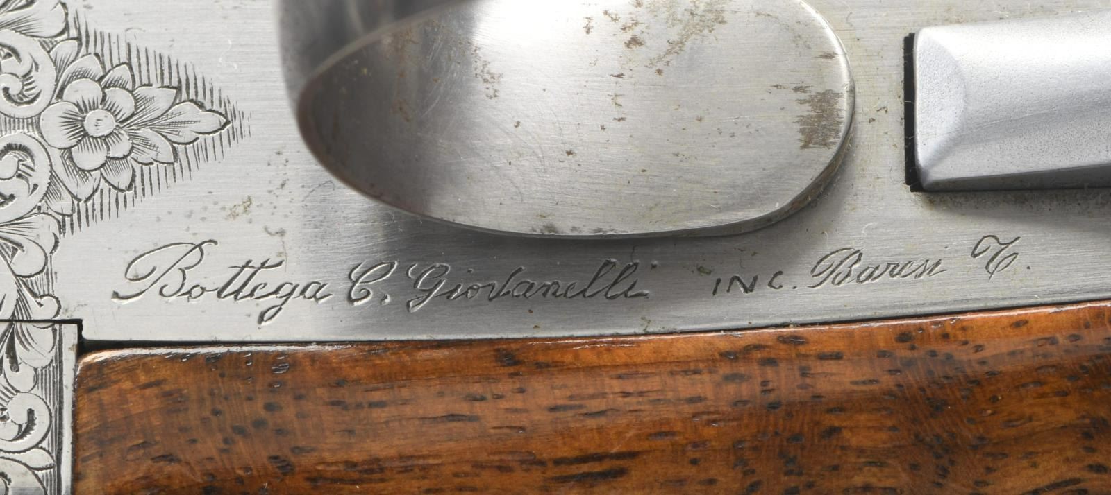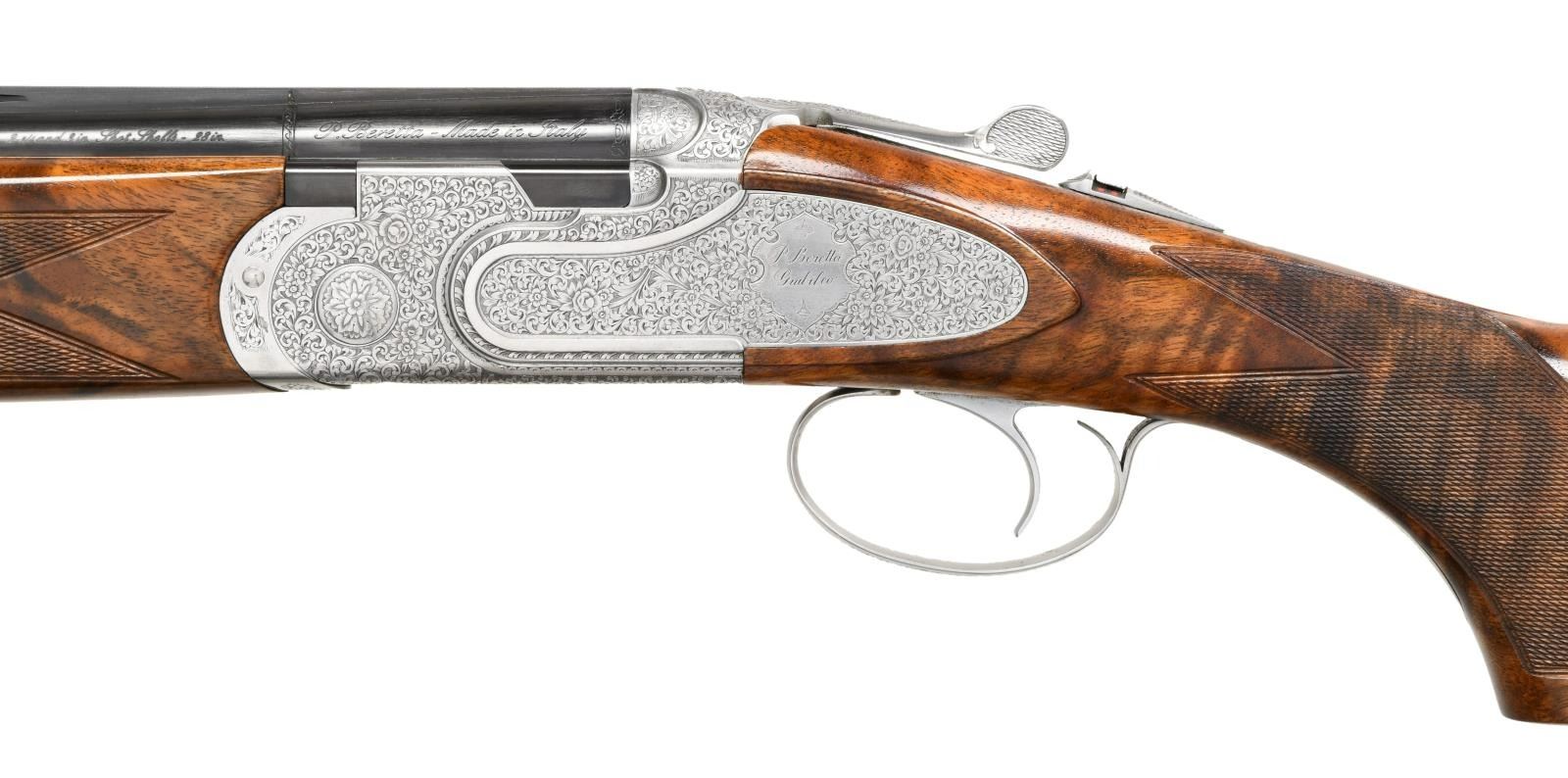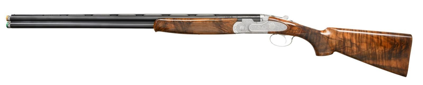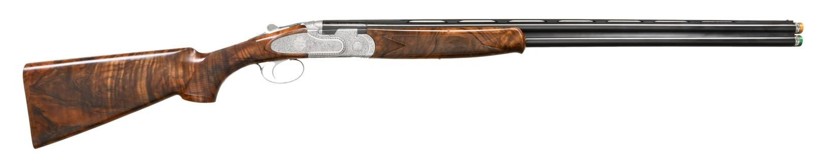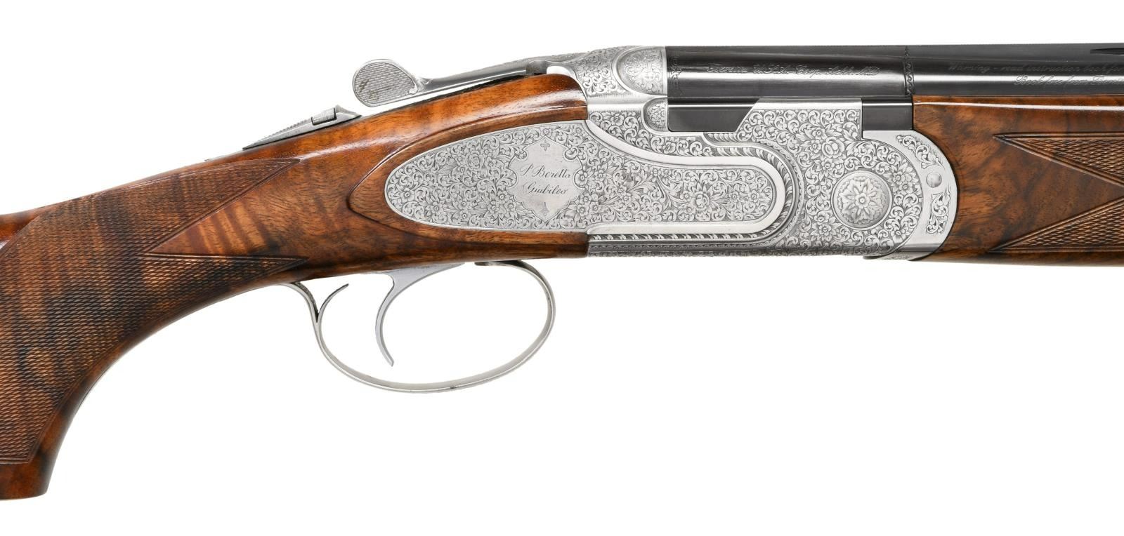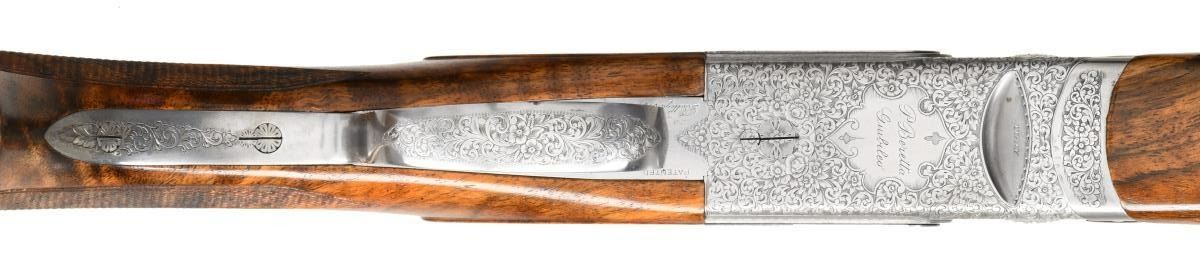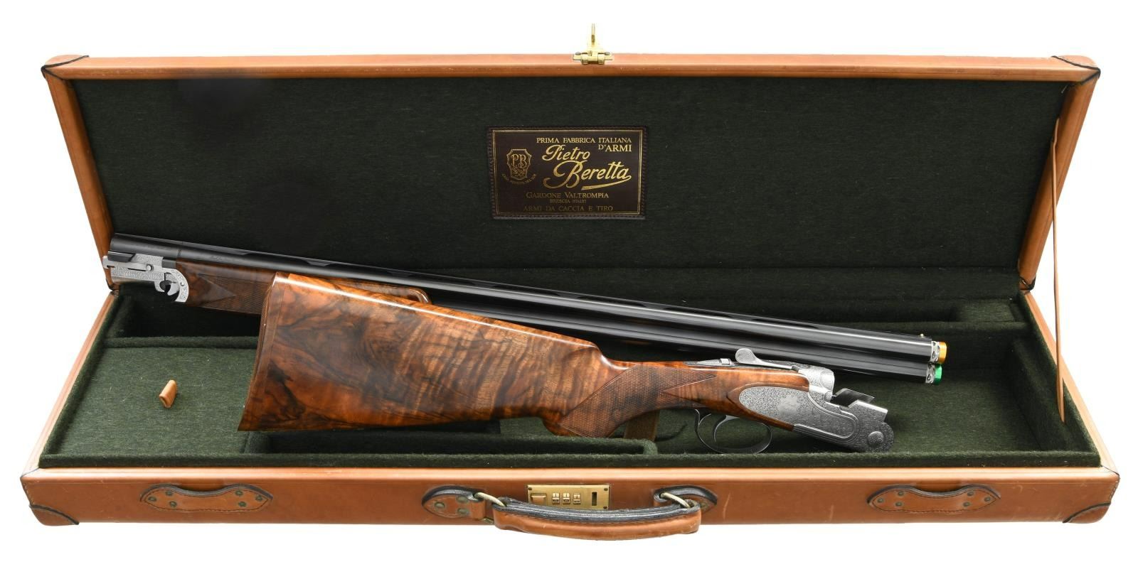 WITH CASE. Cal. 20 Ga. 3". S# GIU216A. Presently only available from Beretta Galleries these fine little guns retail for over $18,000. This gun has 28" monobloc barrels fitted with matted ventilated rib and choke tubes. Beretta markings, chamber information and importer are marked on top barrel. S# and 1998 Italian nitro proofs are on bottom of monobloc. Coin finished Beretta type boxlock action with ornamental sideplates is fitted with single selective trigger. Action and sideplates are engraved with full coverage of very well cut and shaded varying size scroll with floral and acanthus accents. Both lock plates are engraved "P. Beretta Giubileo" which is also found on bottom of action. Trigger plate is engraved "Bottega C. Giovanelli inc. Baresi T." (This gun is obviously engraved by Tiziano Baresi as there are no bullino elements to this fine engraving). Strikingly figured and beautifully marbled flesh tone European walnut pistol grip buttstock measures 14 5/8" over checkered wood butt on wooden buttplate. Point pattern checkering is at grip. Matching schnabled ejector forend has Deeley type release which is gold inlaid "Beretta Gallery" on lever. A gold "PB" logo is also inlet. MEASUREMENTS: STOCK: DAH: 2 1/8". DAC: 1 3/8". CAST: about 1/4" off. LOP: 14 5/8". WEIGHT: 6 lb. 0 oz. UNATTACHED ACCESSORIES: gun is house in its original tan leather case with stitched leather corners lined in olive felt. A Beretta label is in lid. Case contains: bags for barrels and action, snap caps and 3 piece rosewood cleaning rod. A covered compartment contains 4 rosewood handled turn screws. Other compartments hold 5 standard Beretta choke tubes & wrench (2 Briley extended tubes are in gun). CONDITION: exceptionally fine. Has seen very little use and has only a few minor handling and assembly marks on all surfaces. Bores are bright and shiny. Mechanically crisp. (23-4816/MGM). MODERN. $7,000-10,000.