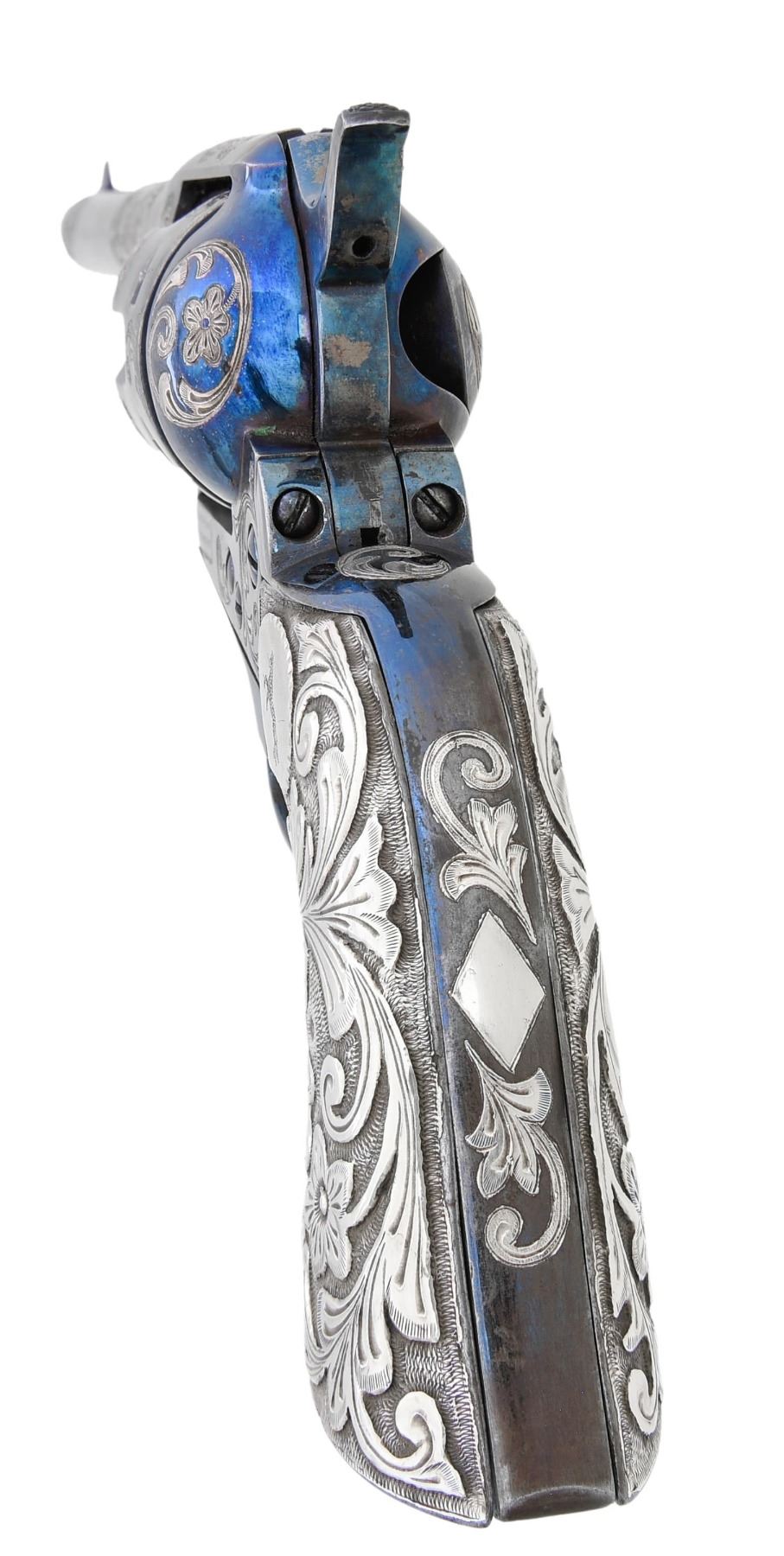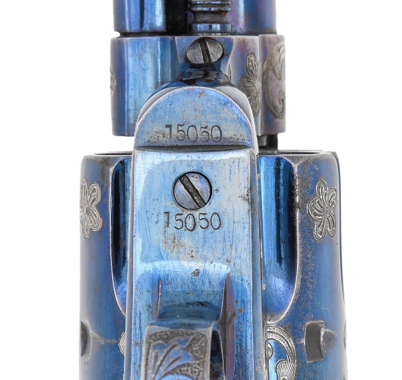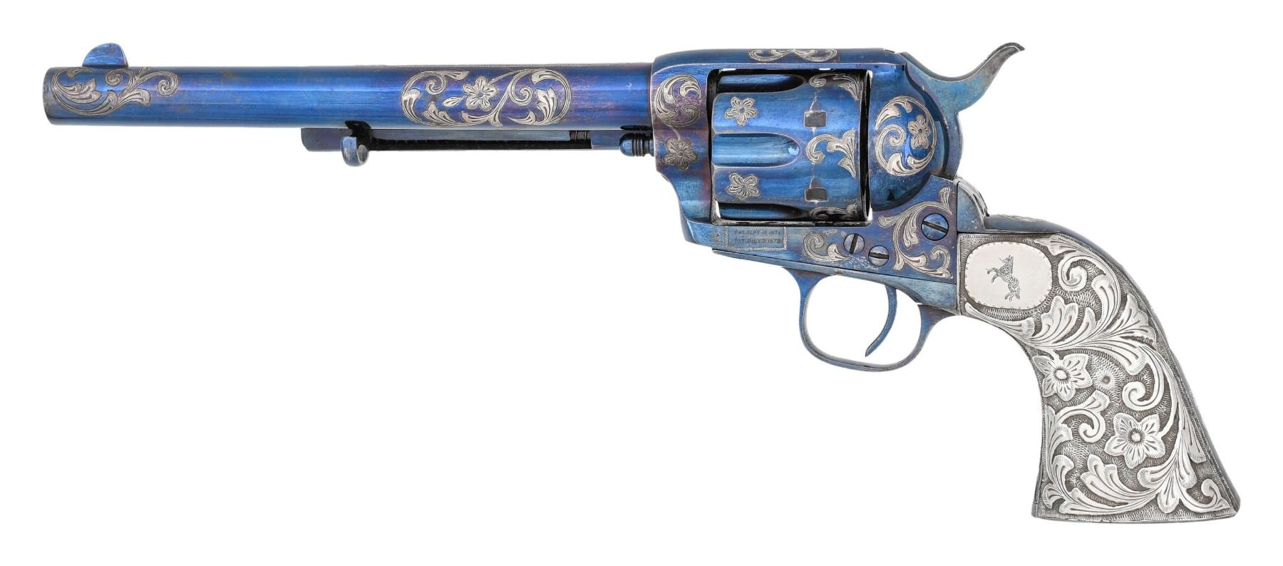SINGLE ACTION ARMY REVOLVER. Cal. 45. S# 15050. Standard configuration of 1875 manufacture with 7.5" barrel, 1-line Hartford USA address, left side of frame has 2 patent dates. Ejector housing is later than manufacture, so barrel probably replaced when customized. Revolver is totally reworked with floral scrolls inset into barrel, frame, and grip strap. Grips are decorated en suite with repose silver applied to sheet iron. Gun is beautifully fire blued. Displayed in modern Colt casing. CONDITION: fine to excellent as totally refurbished, address remarked. Mechanics fine, shiny rifled bore. (01-26743/JS). ANTIQUE. $4,000-6,000.