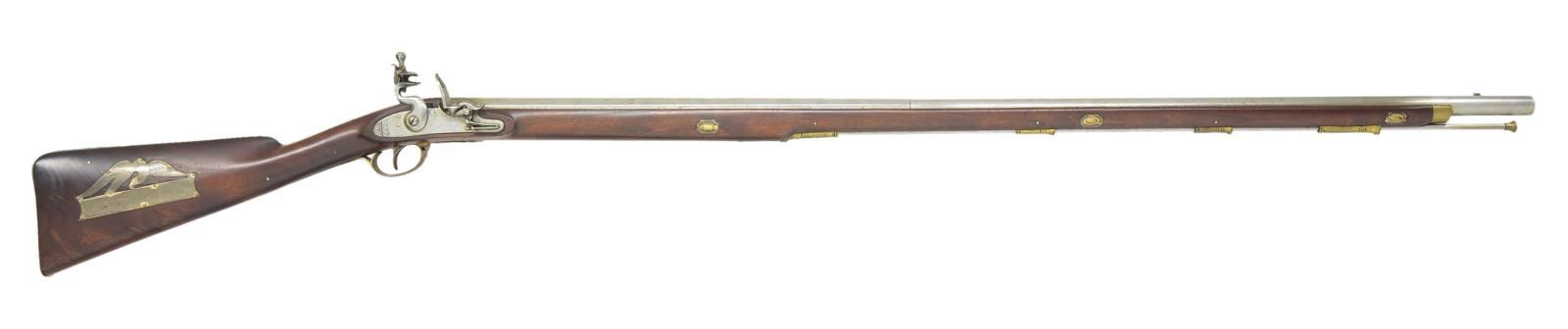 MARKED "SHARPE" HAS PRESENTATION PLAQUE IN STOCK. Cal. 65. NSN. Bbl. 39 1/2" half oct., unmarked, "1826" is deeply stamped on tang. Good quality lock w/ slightly raised plate & rebated tail features serpentine cock, semi waterproof pan, bridled frizzen & roller on feather spring w/ bulbous finial. Bbl. & lock are in original flint. Well figured walnut stock extends to w/in 3" of muzzle & attaches to bbl. w/ 3 brass side bolts through shaped rectangular escutcheons. Stock is brass mounted. Triggerguard & buttplate w/ some scroll engraving. Steel ramrod w/ brass trumpet head mts. through 3 flared pipes & matching thimble. Right side of butt has later silver inlay of drooped head heraldic eagle over rectangular presentation plate inscribed "Awarded to Jacob W Van Deern Sgt. by the 7th Company National Guards, Commanded by Capt Charles B Spicer in the 27 Regt N.Y..S.A., for his superior skill at target firing. Aug 16 1826". CONDITION: fine as refinished. Bbl. & lock cleaned to bright silver. Lock markings nearly eradicated. Stock w/ old oil refinish & some repaired cracks in front of lockplate, is otherwise sound. Brass w/ worn surfaces is nicely toned. Presentation inlay has considerable polishing wear. Newer brass tacks are toned. Lock is good, mainspring weak. Bores good, shiny. PROVENANCE: The Estate Collection of Gary Parietti. (01-19710/MGM). ANTIQUE. $800-1,200.