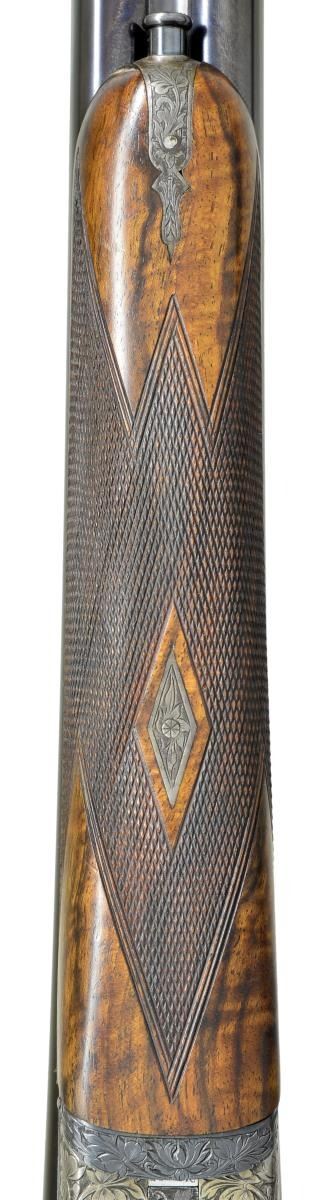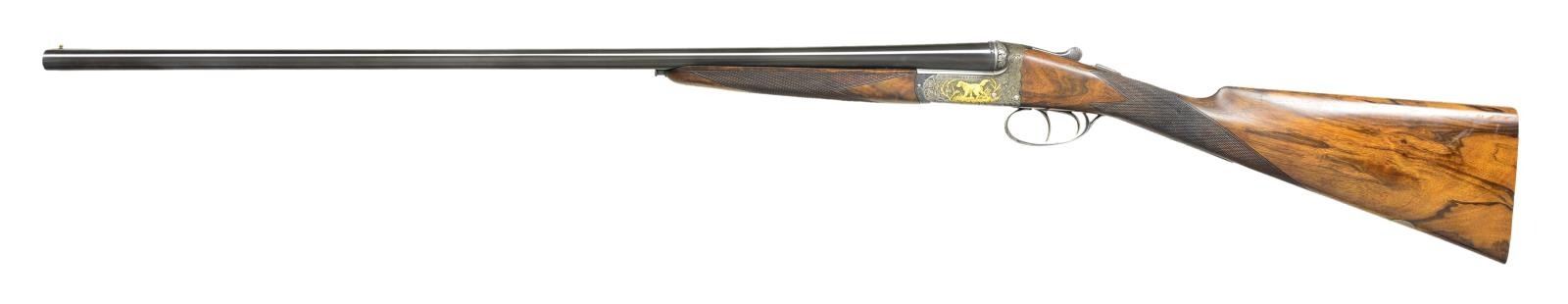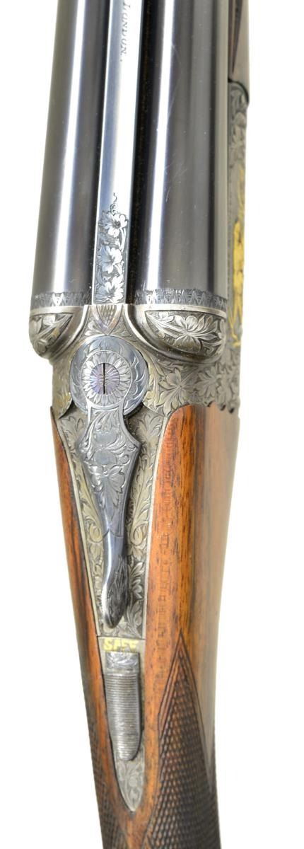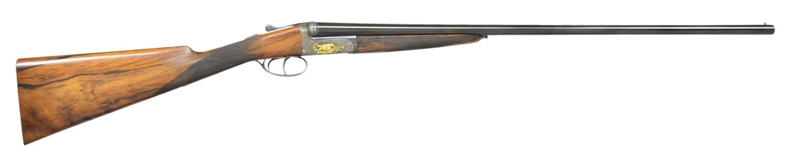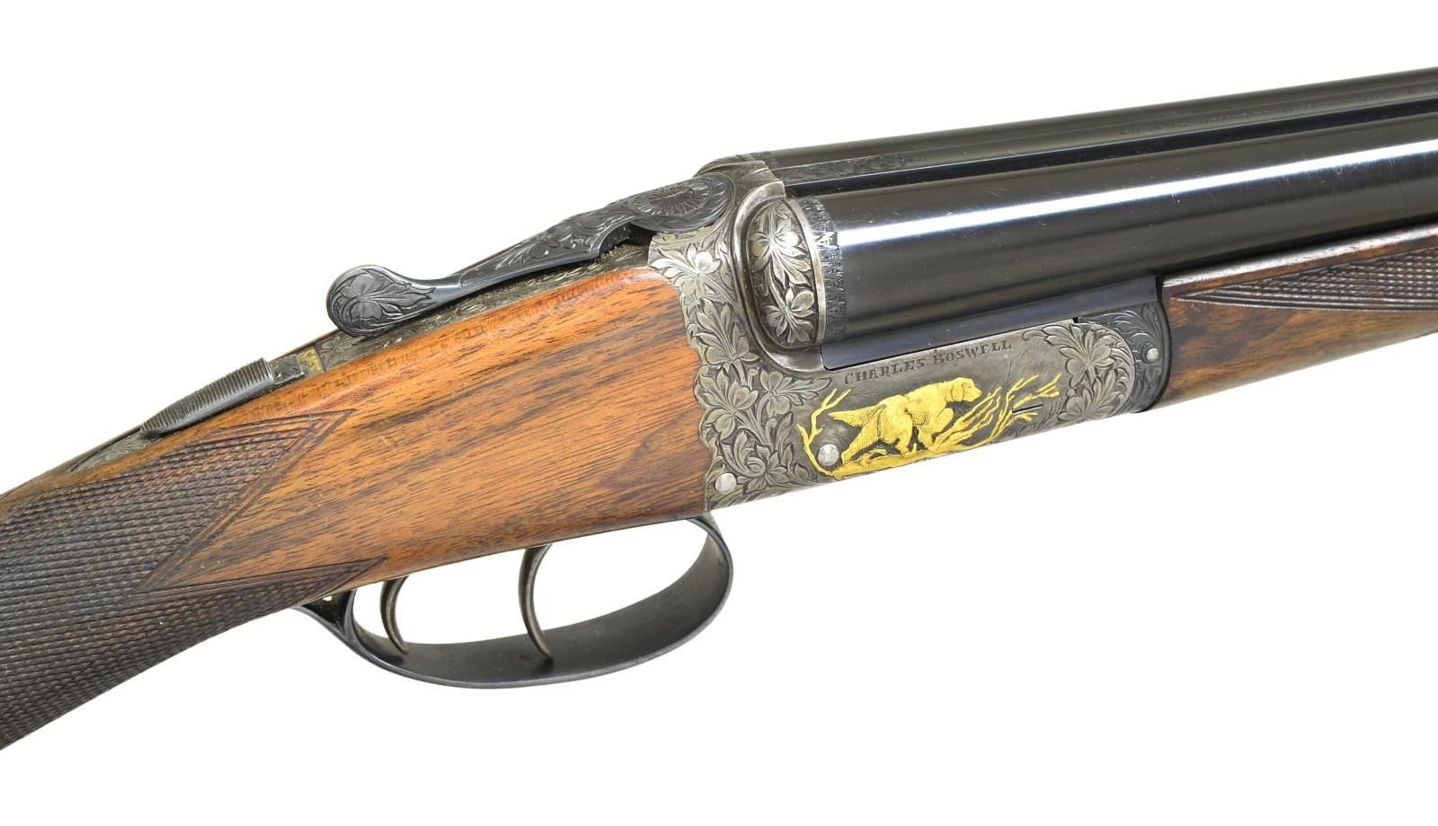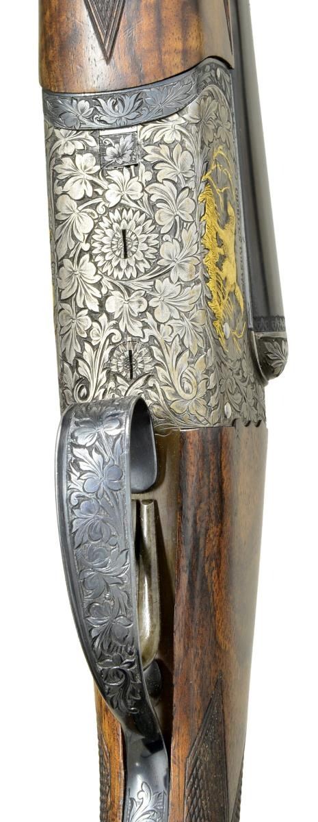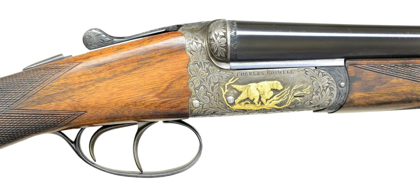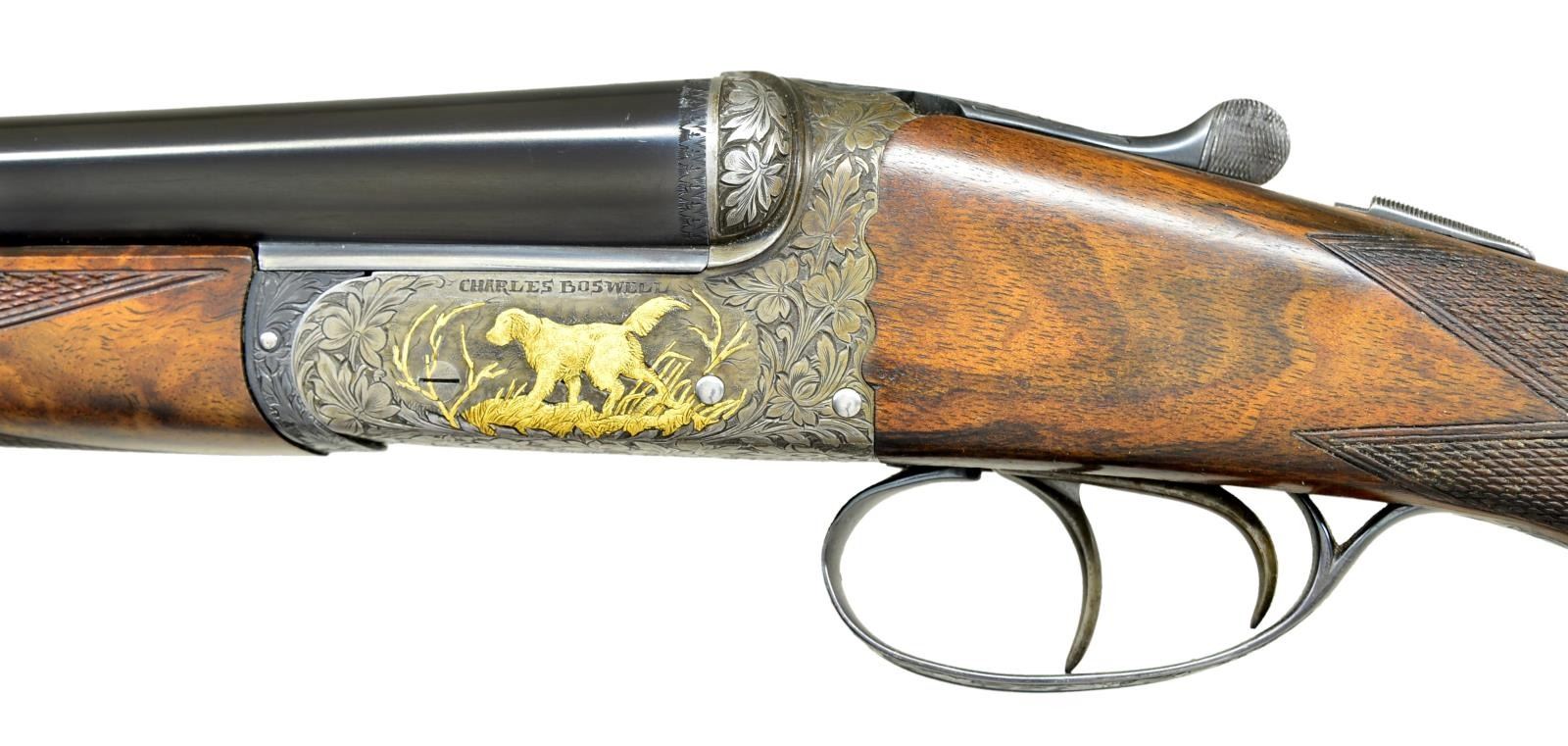 BOXLOCK EJECTOR LIGHT GAME GUN. Cal. 28 Ga. 2 3/4". S# 146835 (1988). The 28" dovetailed bbls. are engraved "Charles Boswell Gunmaker, London." on a slightly swamped narrow game rib. Bbl. flats are stamped w/ 1988 Birmingham nitro proofs for 2 3/4" chambers. Case-hardened double-Ogee-backed boxlock action features automatic safety ("SAFE" inlaid in gold) and dbl. triggers. Action is well filed & engraved, with near-full coverage of large shaded acanthus, which surrounds gold-inlaid semi-releif renditions of birddogs in action, w/ pointing setter standing on a fallen brushy log on the right side with its mate honoring point while standing in an open meadow on the left. Maker's name is engraved on each side. Blued top lever & single-beaded trigger guard are engraved to match. Serial number is on the trigger guard tang. Straight grip buttstock of well marbled European walnut measures 15" over checkered wood butt. Point pattern checkering is around grip, and a vacant silver oval is on toeline. Matching large splinter ejector forend has an Anson release. MEASUREMENTS: BBLS: Bore Diameter: R .557", L .558". Restriction: R .024" (MOD), L .035" (FULL). Min. Wall Thickness: R .028", L .035". STOCK: DAH: 2 1/4", DAC: 1 1/2". LOP: 15". CAST: approx. 1/2" off WEIGHT: 5 lb. 9 oz. CONDITION: very fine. Bbls. retaining over 95% of the original blue. Action with over 80% original light case hardening color, w/ some silvering on fences & edges. Top lever & trigger guard also show some high-edge wear. Stocks retain nearly all of their original finish with a considerable number of marks and scratches, some fairly heavy, as expected from field use. Bores are bright & shiny. Action is tight. Bbls. are on the face. Ejectors are strong & in time. (22-2252/MGM). MODERN. $5,000-9,000.