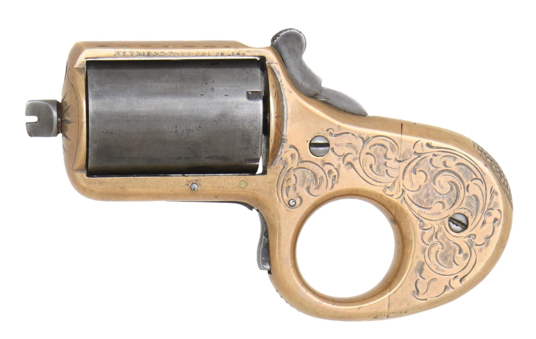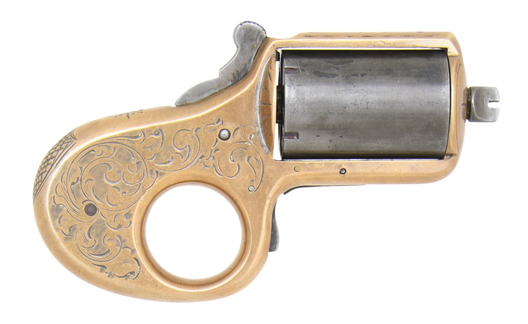 KNUCKLE DUSTER REVOLVER. Cal. 31. S# 11796. Bbl. 1 5/8". My Friend single action knuckle duster revolver mfg. by James Reid. Left side of the top strap is marked "MY FRIEND PAT'D.DEC 26.1865". Sides of the frame exhibit scroll engraving, with a checkered panel and starburst design engraved on the rear edge, and additional decorative engraving is present over the top of the top strap and on the front face of the frame. Steel 5-shot cyl., trigger, and hammer exhibit a blue finish. All visible serialized parts are matching and include the frame, cyl., and trigger. Cyl. base pin head has been notched. CONDITION: frame retains a few traces of its original silver-plated finish (along the edges of the recoil shield), with the balance exhibiting a mellow patina overall. Steel parts retain traces of their original blue finish, with the balance exhibiting a gray patina overall. Bores/chambers are bright, exhibiting scattered areas of dark pitting throughout. An attractive example of the James Reid My Friend knuckle duster revolver. PROVENANCE: from the collection of a Tennessee gentleman. (01-25703/BH). ANTIQUE. $800-1,500.