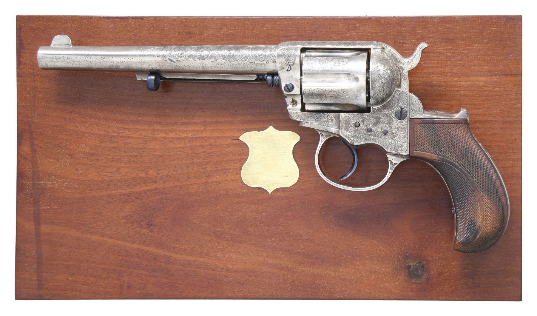 "THUNDERER" DOUBLE ACTION REVOLVER WITH DISPLAY CASE. Cal. 41. S# 30200. Bbl. 6". Model 1877 "Thunderer" double action revolver mfg. by Colt in 1881. The top of the bbl. is marked with Colt's 2-line address, with Colt's patent information marked on the left side of the frame. Left side of the rear trigger guard web is marked "41 CAL". Frame, bbl., loading gate, and rear grip strap exhibit professionally executed scroll engraving on a stippled background, which is also present between the flutes of the cyl. Sides of hammer and trigger guard exhibit foliate pattern engraving. Frame screws exhibit small foliate motifs on the screw heads. Metal components exhibit what appears to be a period reapplied nickel plated finish, with nitre blued parts exhibiting a reheated finish. Frame is mounted with a contemporary 1-piece checkered wood grip. Fixed half-moon blade front sight, with frame notched rear sight. All serialized parts are matching and include the frame, trigger guard, rear grip strap, as well as the cyl. UNATTACHED ACCESSORIES: vintage wood display case, featuring a brass shield escutcheon inlaid on the lid and a red felt lining, while containing 18 vintage rds. of assorted .38 S&W ammunition and 5-rds. of Peters .41 LDA ammunition. CONDITION: metal components retain the majority of their period reapplied nickel plated finish, exhibiting small scattered spots of minor dark oxidation overall, some light flaking, as well as some scattered spots of mild surface oxidation. Nitre blue parts retain the majority of their reapplied finish, exhibiting some spots of wear, some areas of pitting beneath the finish, as well as some scattered spots of surface oxidation. Fair bore, exhibiting scattered areas of dark pitting, while retaining strong rifling throughout. Grip is excellent overall. Display case shows some superficial marks from handling and storage, but otherwise presents nicely. (01-26619/MLW). ANTIQUE. $4,000-6,000.