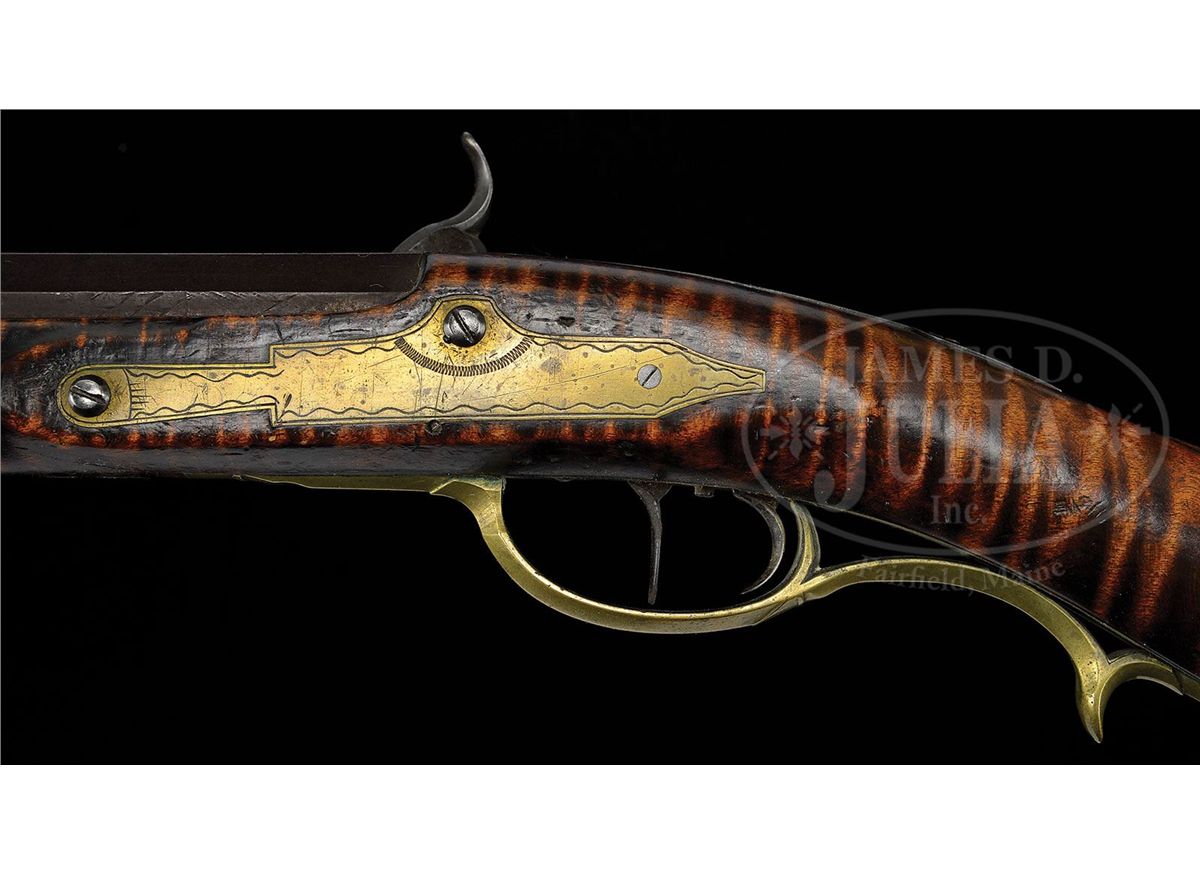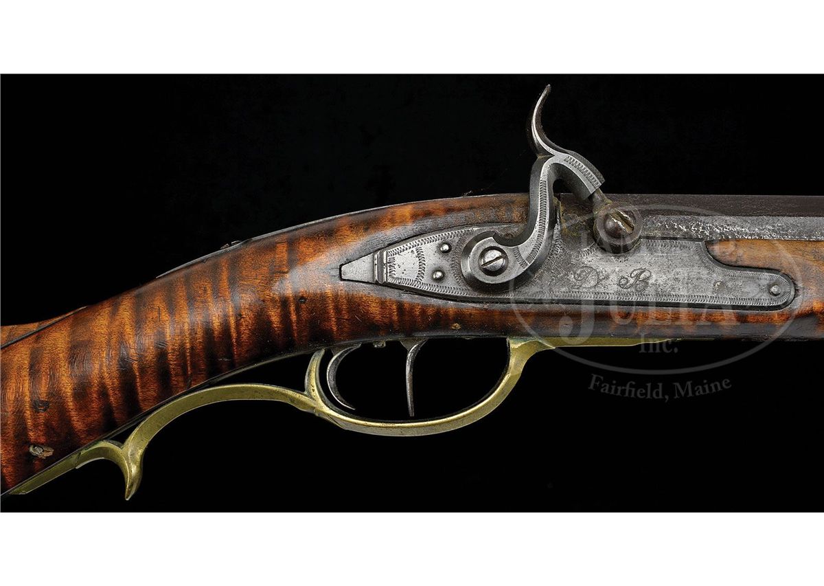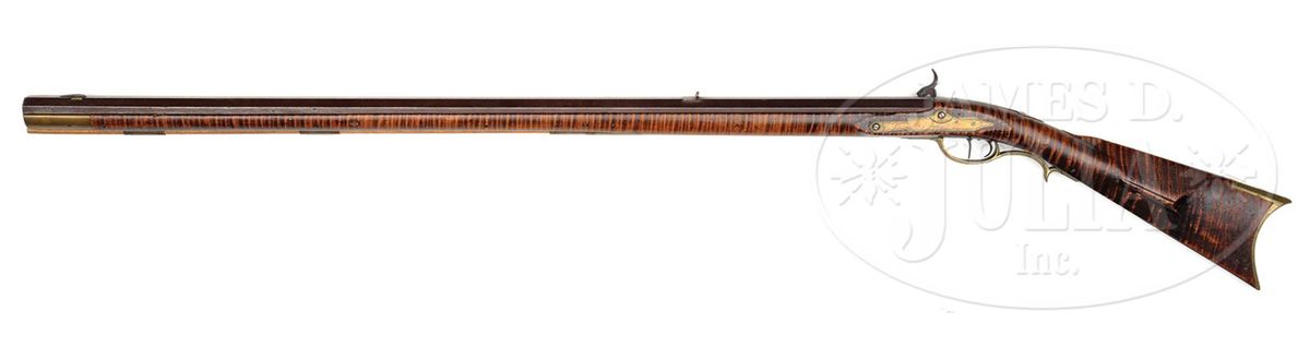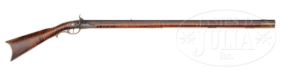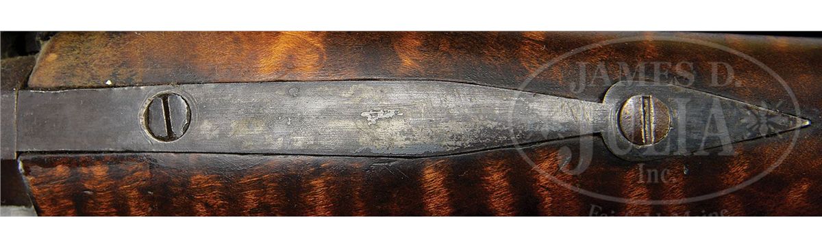 NSN. 37-3/4" full oct .45 Cal rifled unmarked bbl. Bbl has a very attractive 5" long bbl tang ending in a tear drop design over the wrist. Bedford/Somerset style percussion lock with it's Bedford style high spurred hammer is nicely engraved with the initial "DB" . Stock is very fine curly maple. Characteristic Somerset style brass sideplate is engraved and has 3 screws, the rear screw being a wood screw. Brass nosecap is 2-3/4" long. Daniel Border had his first shop in Schellsburg, PA which closed in 1833. He moved to Davidsville, Somerset County, where he was in business by April 1844. His dated guns are dated between 1864-1873. Although this gun is not highly decorated it is a fine orig example of Border's work. PROVENANCE: Frank Sujansky Collection. CONDITION: This rifle is in wonderful orig condition throughout. 4-49433 RG60