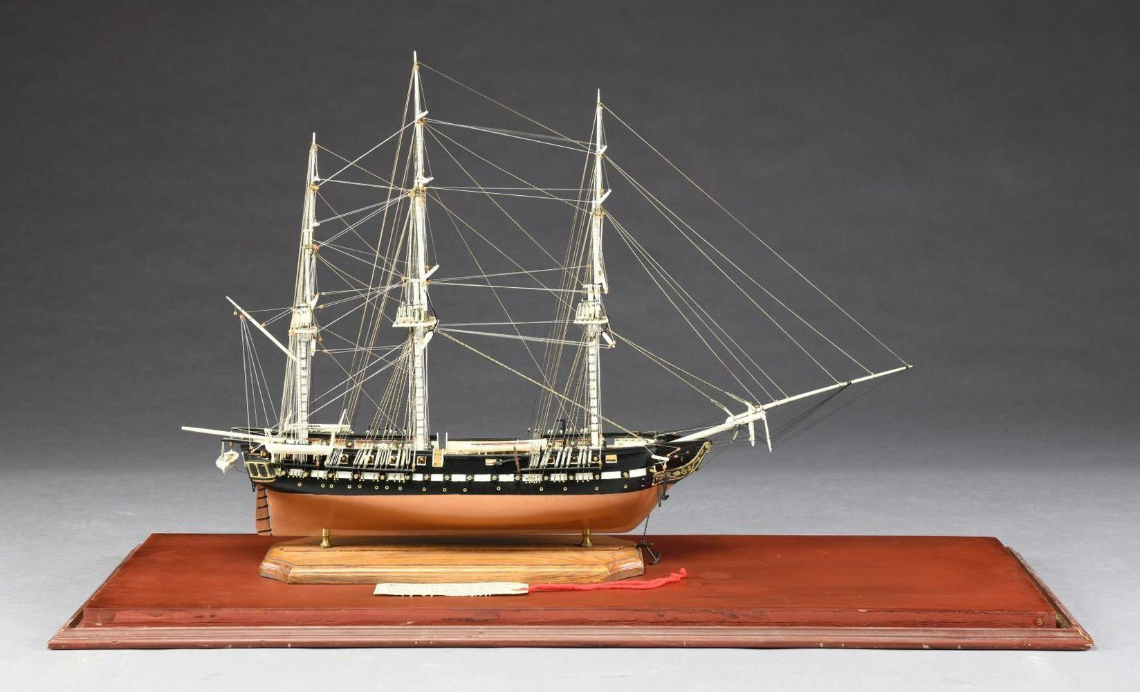 CONSTITUTION IN DISPLAY CASE. Red painted bead moulded wood display case measures 41" x 30" x 16". Model measures 30" overall and is on oak display stand. Information tag identifies the model and gives history. Model has well detailed rigging and blocks. Deck apparatus and lifeboats are well done. Cannons appear to be die cast. CONDITION: fine, stern lifeboat is hanging by the bow and port side anchor has come loose. (02-18988/MGM) $500-1,000.
