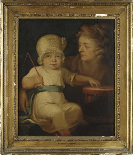 ATTRIBUTED TO ANGELICA C. KAUFFMANN (Swiss, 1741-1807) PORTRAIT OF MOTHER AND CHILD WITH DRUM. Fine early oil on canvas portrait shows mother with hand around seated child. The child’s hand holds drumstick and other with finger on drum. Child wears white lace bonnet, white dress with blue sash at waist. Housed in an early frame, which is marked with artist name. SIZE: 24” x 20”. CONDITION: Very good. Needs cleaning. 9-26969