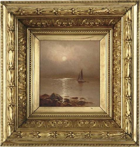 ATTRIBUTED TO CHARLES HENRY GIFFORD (American, 1839-1904) MISTY SAIL. Small unsigned oil on canvas laid on board scene shows a small sailboat in tranquil cove under a misty or foggy sunlit sky. Rocky beach is seen in foreground. Housed in a period gesso decorated frame. SIZE: 5" x 5". CONDITION: Very good. 9-26546