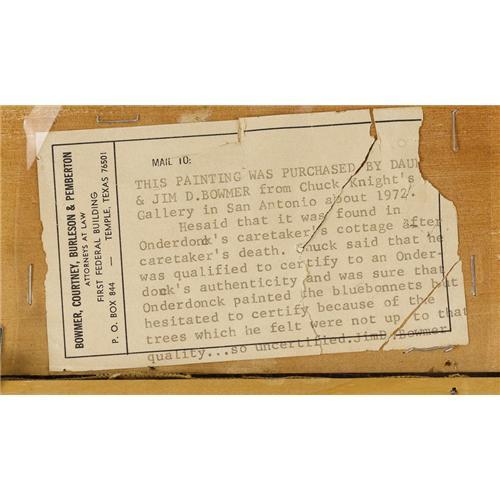<B>ATTRIBUTED TO DAWSON DAWSON-WATSON (1864-1939)</B></I><BR>Untitled Bluebonnet Landscape<BR>Oil on canvas<BR>24in. x 30in.<BR>Unsigned<BR><BR>This painting was purchased from Chuck Night's gallery around 1972 by Daurice and Jim Bowmer, owners of Salado Galleries. The painting was unsigned but was sold as attributed to Julian Onderonk.<BR><BR>We believe the Onderdonk attribution to be wrong. Based on style, especially in the light of the Dawson-Watson bluebonnet painting in this auction (lot # ), we attribute this painting to Dawson Dawson-Watson.<BR><BR>Provenance:<BR>Chuck Knight<BR>Daurice and Jim Bowmer<BR>Acquired by descent from the above by the present owner<BR><BR> <B>Condition Report:</B> Excellent condition. Period frame in excellent condition.<BR><BR><b>Shipping:</b> Requires 3rd Party Shipping (<a target="_blank" href="http://www.heritageauctions.com/common/shipping.php">view shipping information</a>)