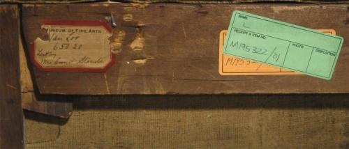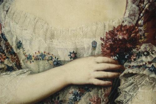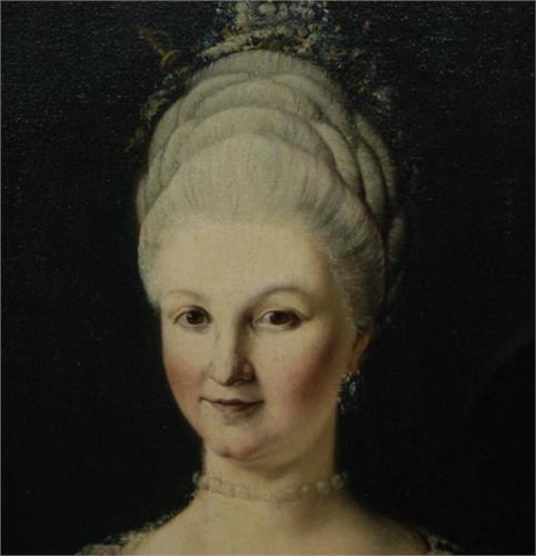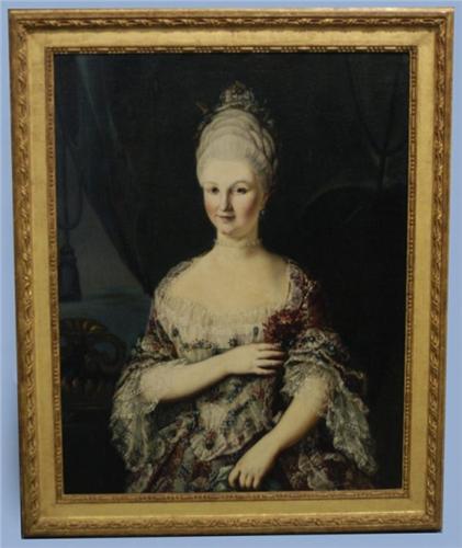 ATTRIBUTED TO JEAN BAPTISTE VAN LOO, 40"x31" oil on canvas portrait of a noble woman with museum label verso 18th century <BR>condition: cleaned and reframed in recent years, various old restoration, most noteworthy some repaint in neck and each shoulder of subject