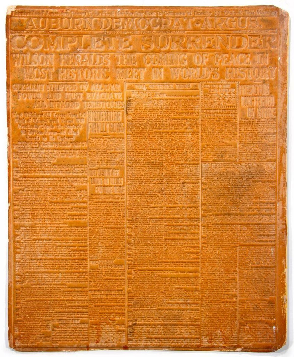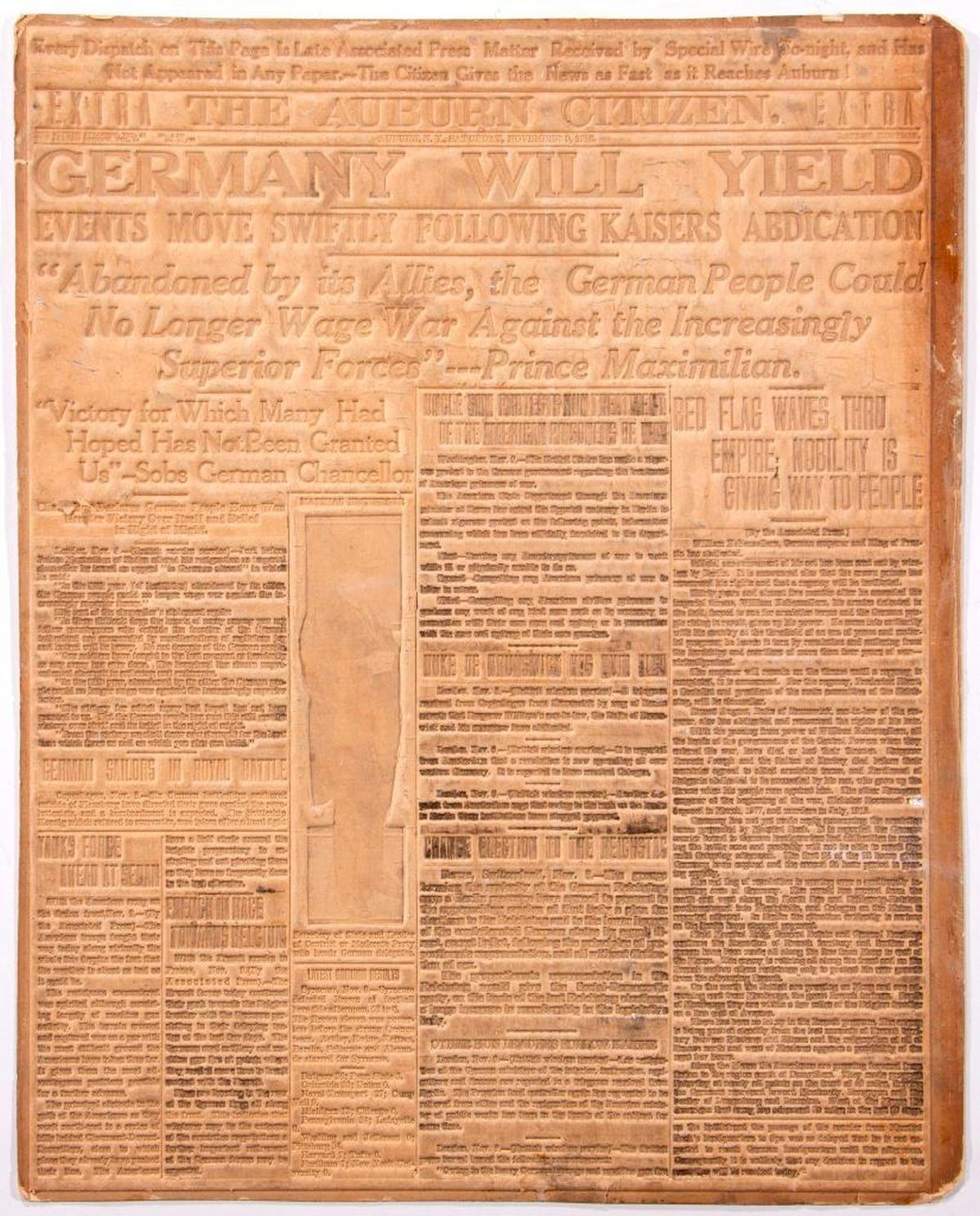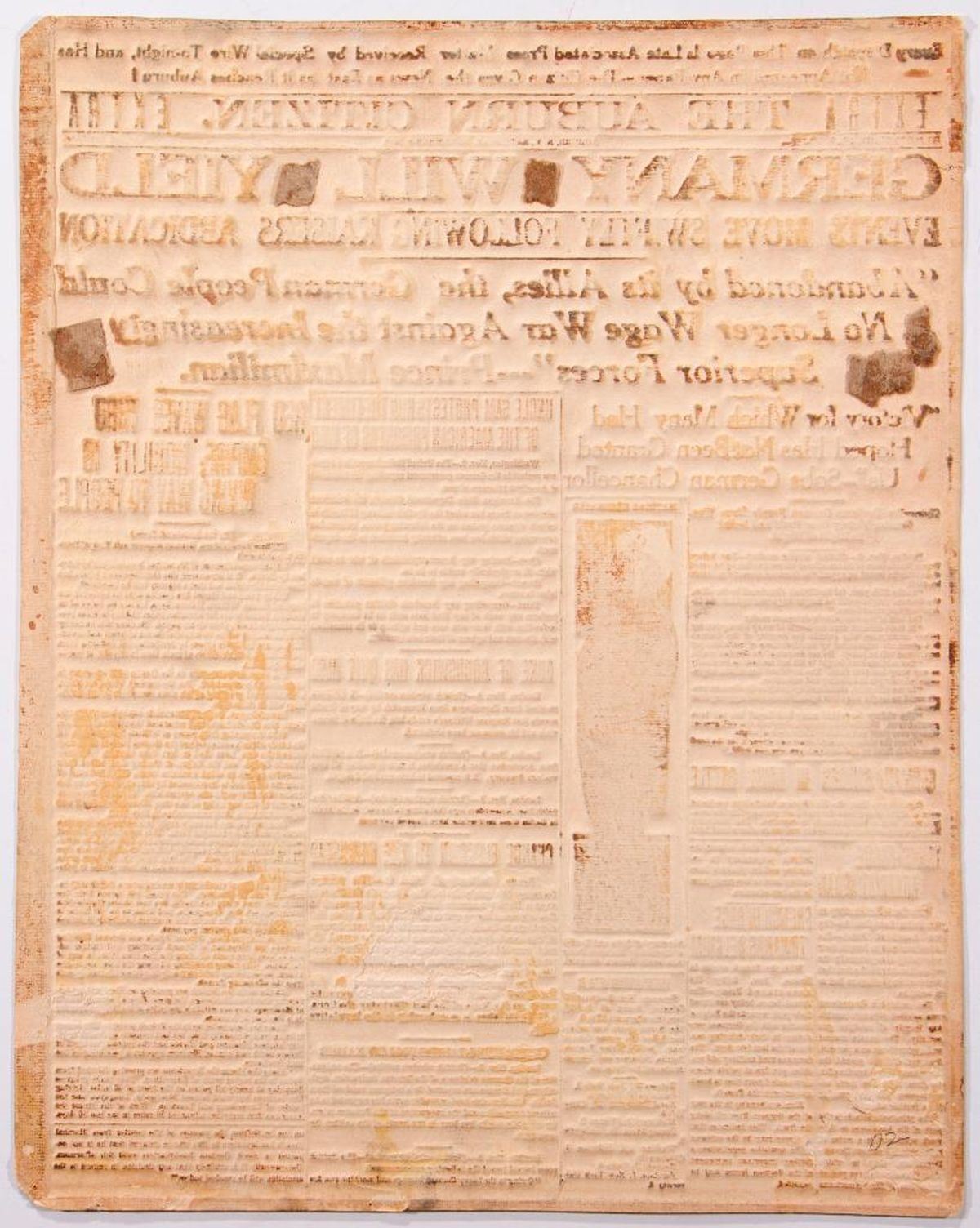 There are three front-page flonges (molds) from an Auburn, New York newspaper. These are negative molds made of some form of cellulose and used to create the lead plates from which the newspaper was printed. They can be read directly and reveal what front page news the American public was seeing at war's end. Headlines read: "Germany will yield"; "Republic cries Berlin"; "Complete surrender." Size: 21 x 16 1/2 in. each. Condition: Fair to good with some losses to cellulose.