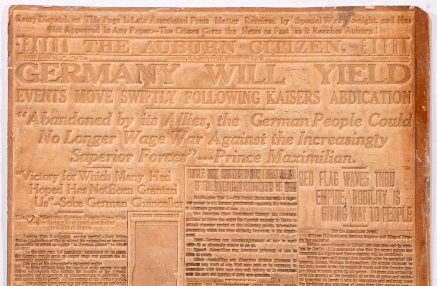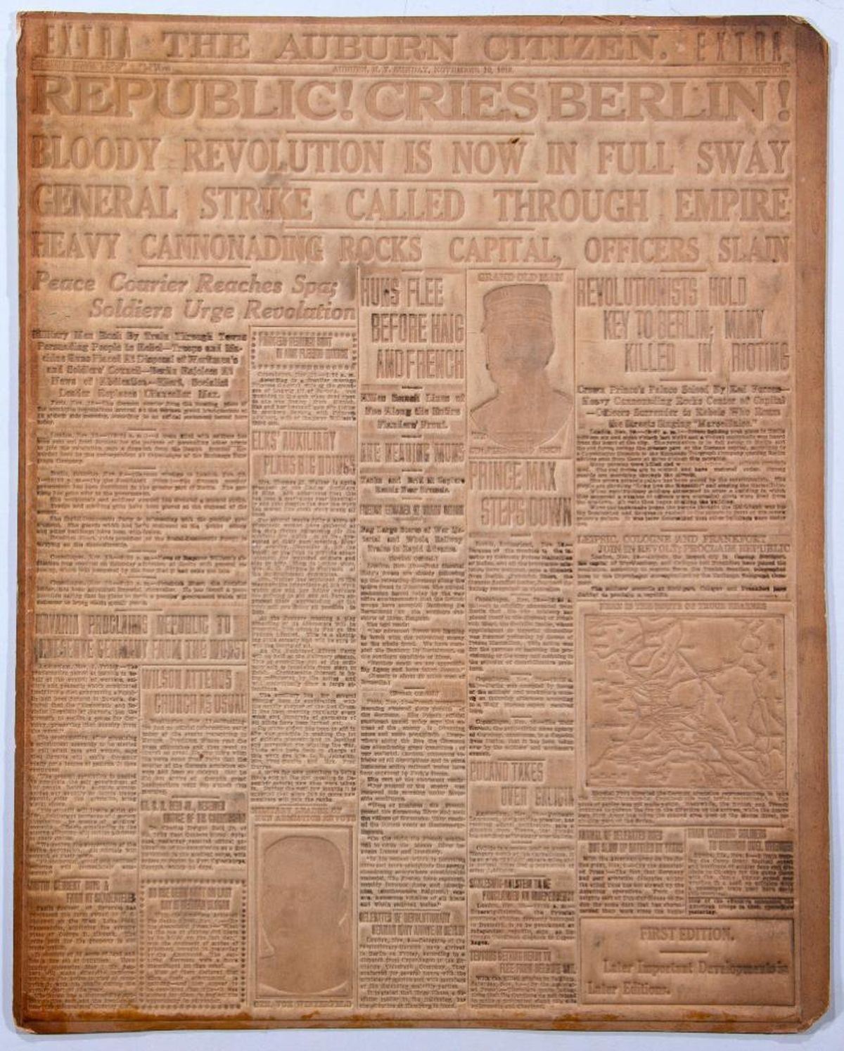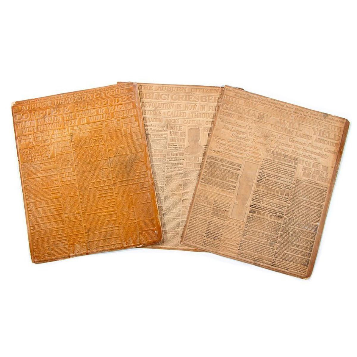 There are three front-page flonges (molds) from an Auburn, New York newspaper. These are negative molds made of some form of cellulose and used to create the lead plates from which the newspaper was printed. They can be read directly and reveal what front page news the American public was seeing at war's end. Headlines read: "Germany will yield"; "Republic cries Berlin"; "Complete surrender." Size: 21 x 16 1/2 in. each. Condition: Fair to good with some losses to cellulose.