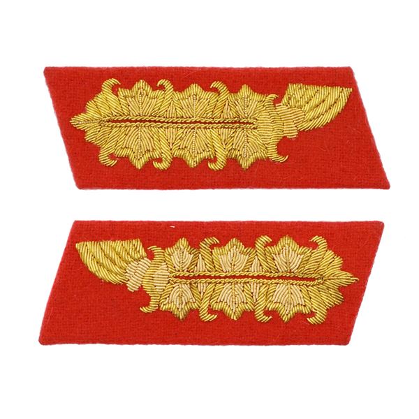 A pair of WWII German army general uniform collar tabs, hand embroidered using a gold bullion cord onto a stiffened scarlet red, wool backing. The orn