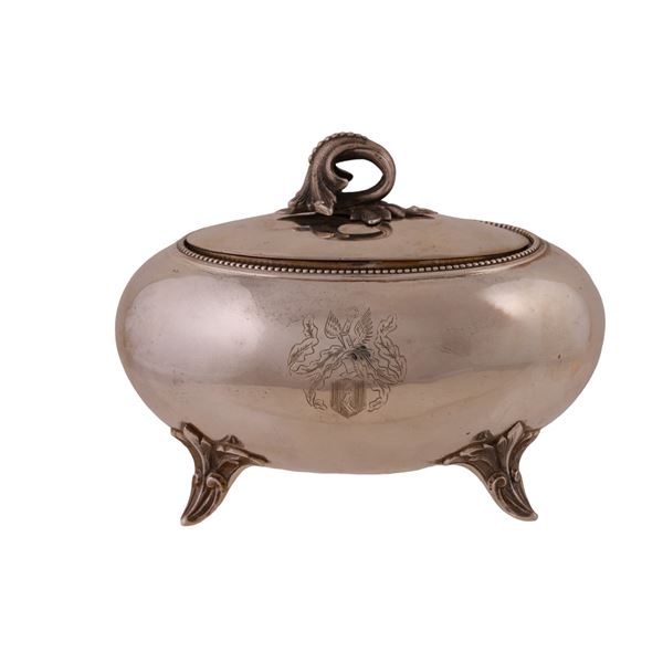 An exquisite silver sugar bowl given as a gift to Hermann Goering for his 40th birthday in 1933. On the front is an engraving bearing his family'...