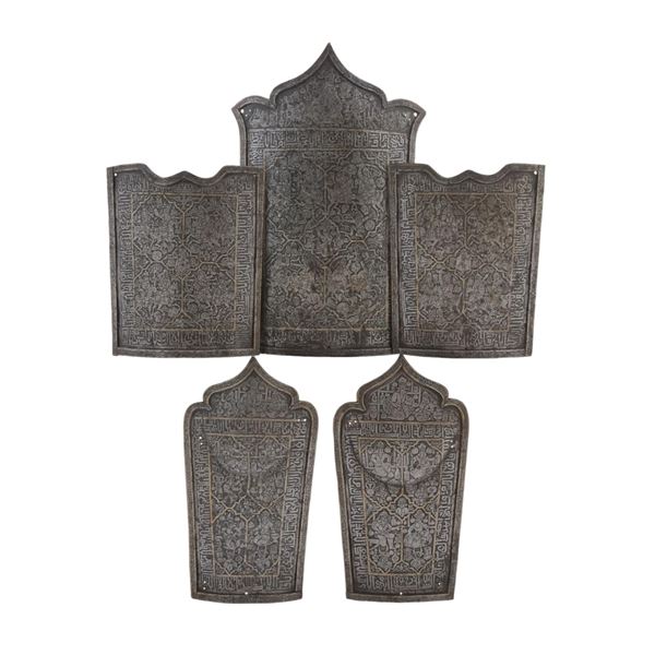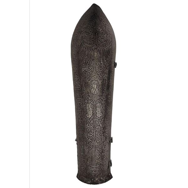 A rare Persian, Qajar period iron box entirely covered with etched decoration forming a characteristic Persian floral motif, calligraphy and human fig