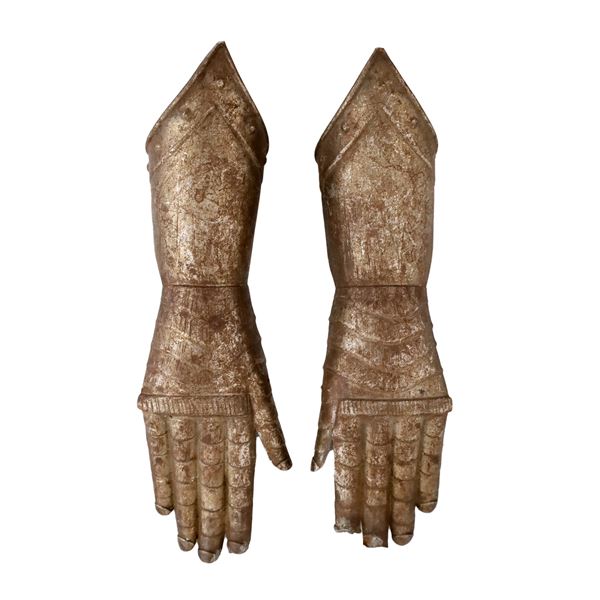 This pair of gauntlets is based on the German, 15th-century Nuremberg-made gauntlets for a child. Decorated with engraving. Good with minor traces of